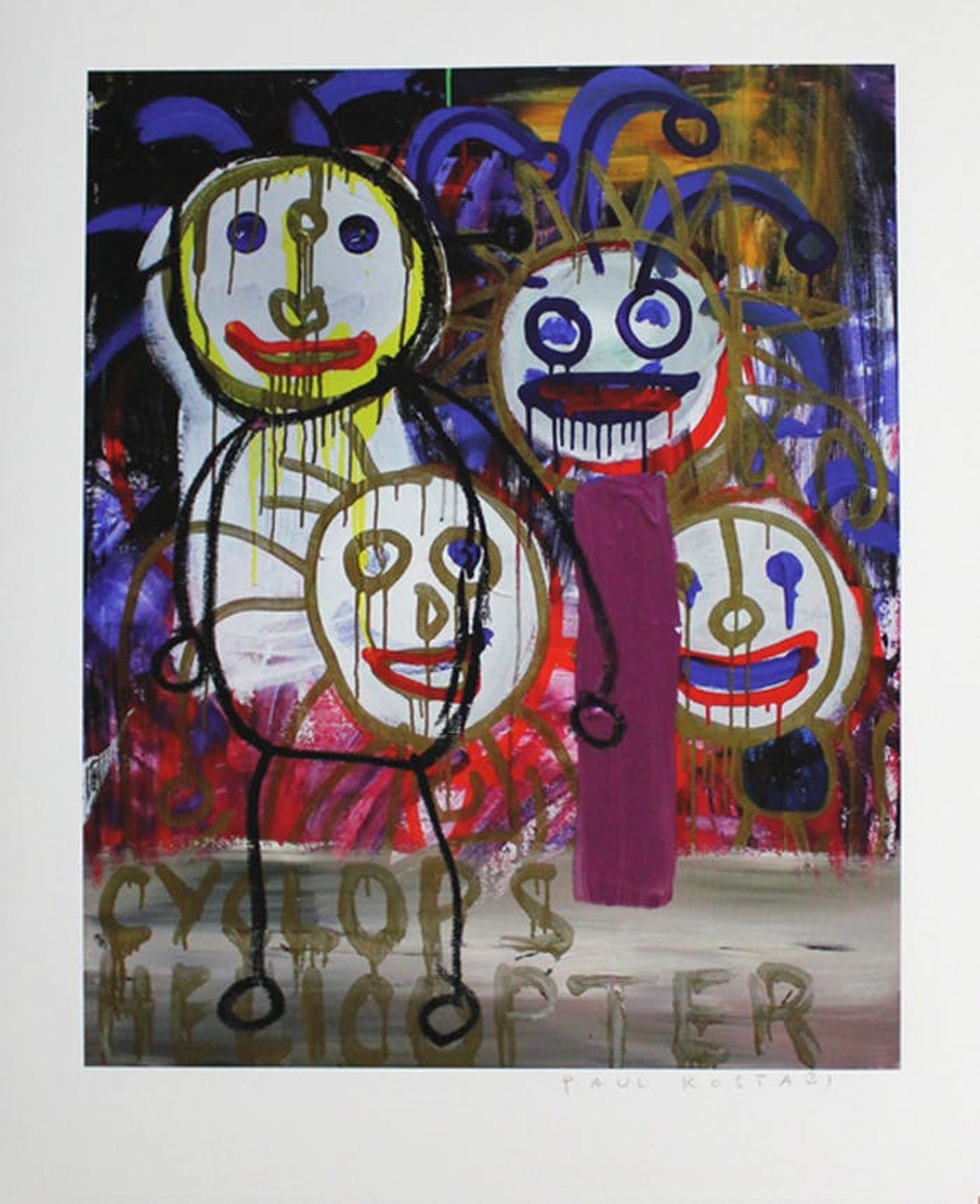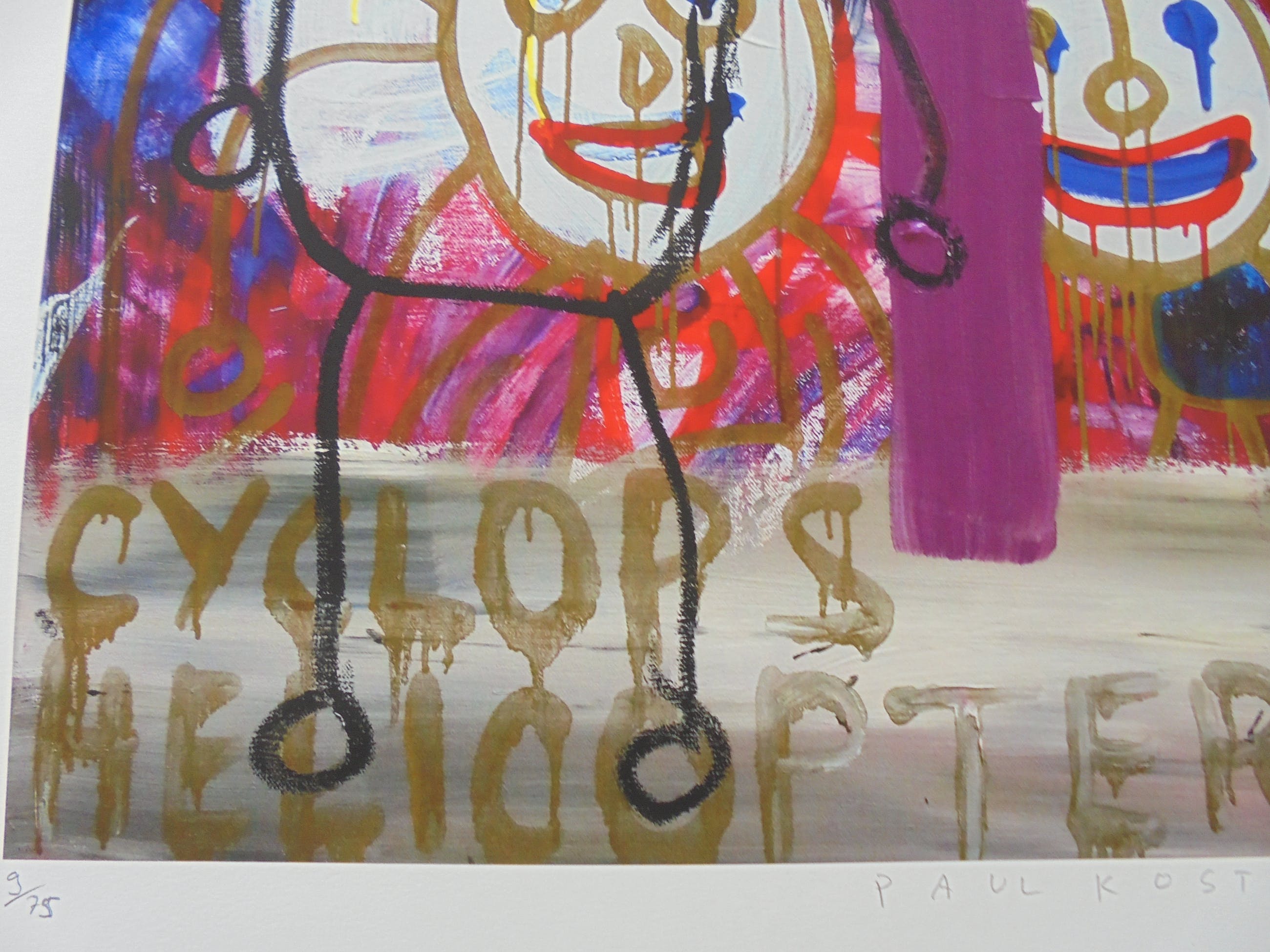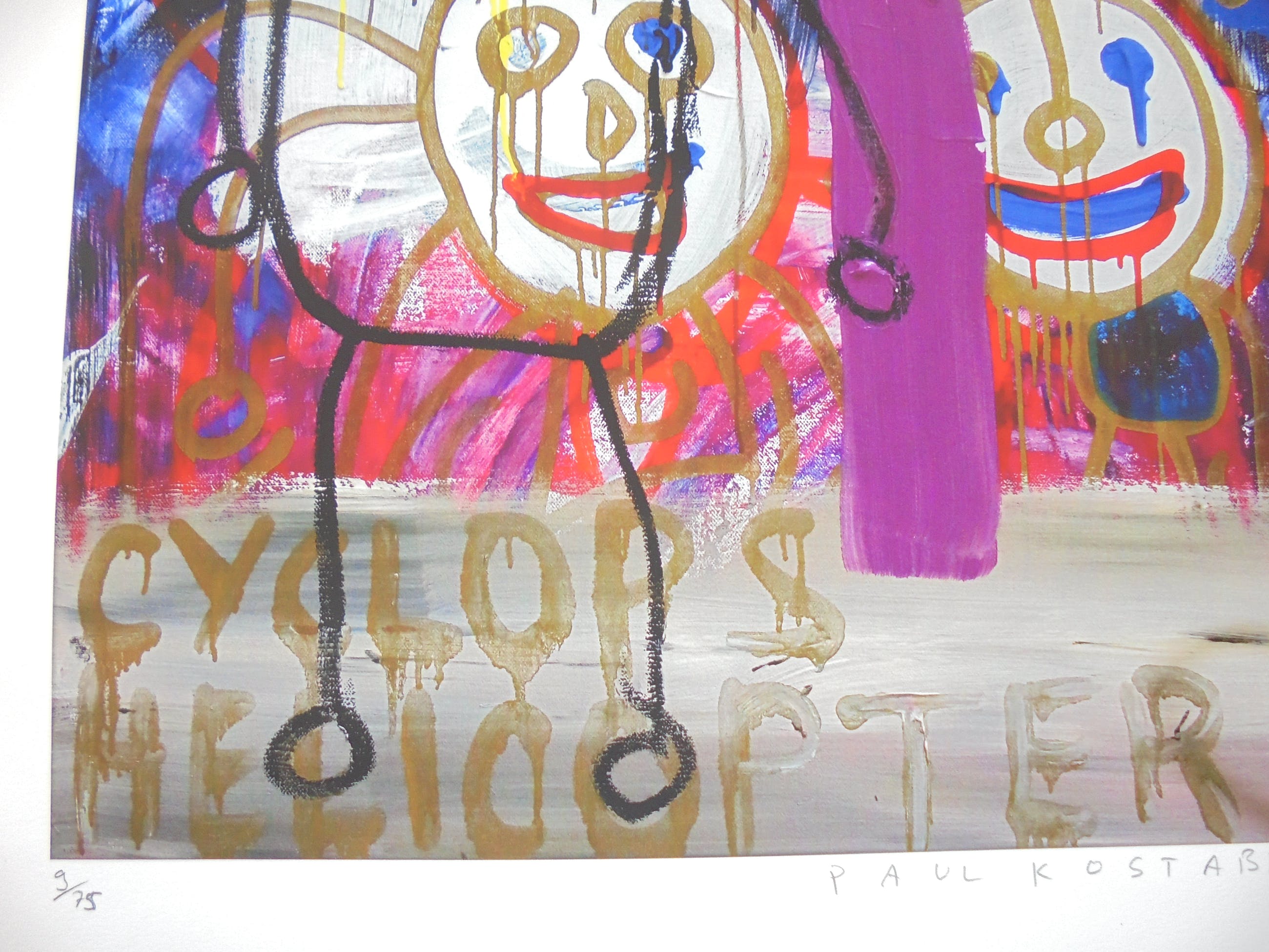 Artiest : Paul Indrek Kostabi Titel: Cyclops Helicopter Editie: 9/75 Papierformaat: 60,5 cm x 50 cm Beeldformaat: 49,5 cm x 39,5 cm In zeer goede staat