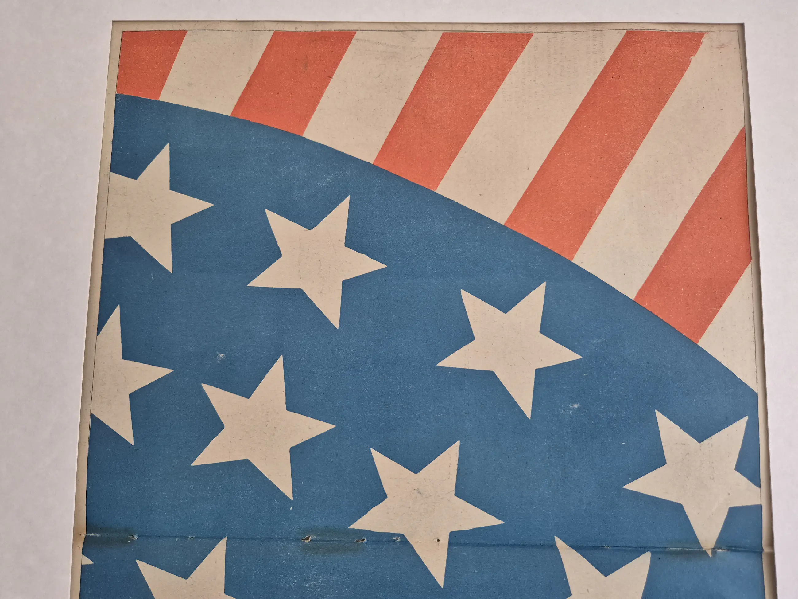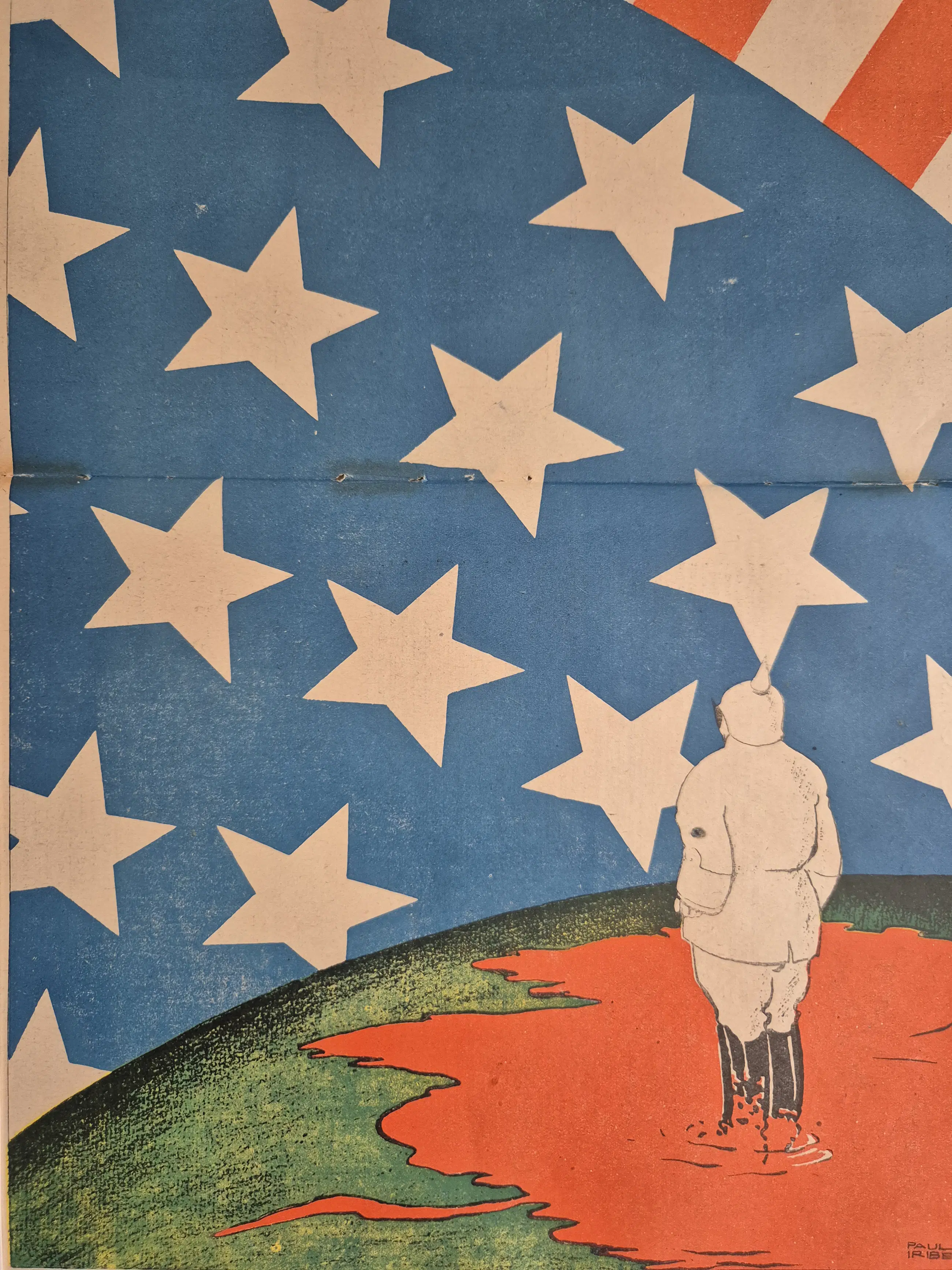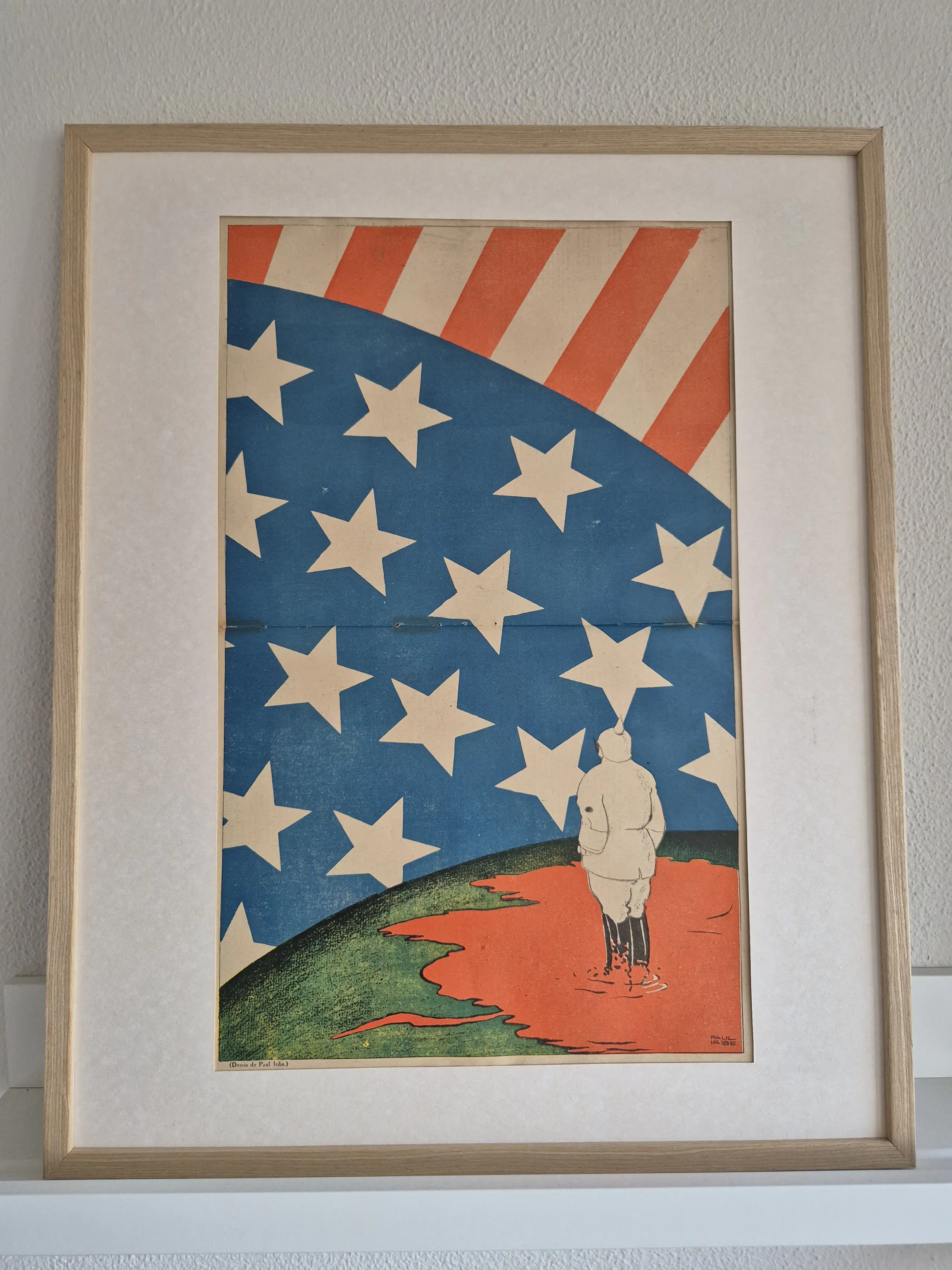 Deze litho is gemaakt door Paul Iribe, een van de meest invloedrijke vormgevers van de vroege 20e eeuw en een grondlegger van de Art Deco. In dit indrukwekkende beeld zie je een Duitse soldaat (herkenbaar aan de kenmerkende helm) die in een plas bloed staat, overschaduwd door de enorme sterren van de Amerikaanse vlag.