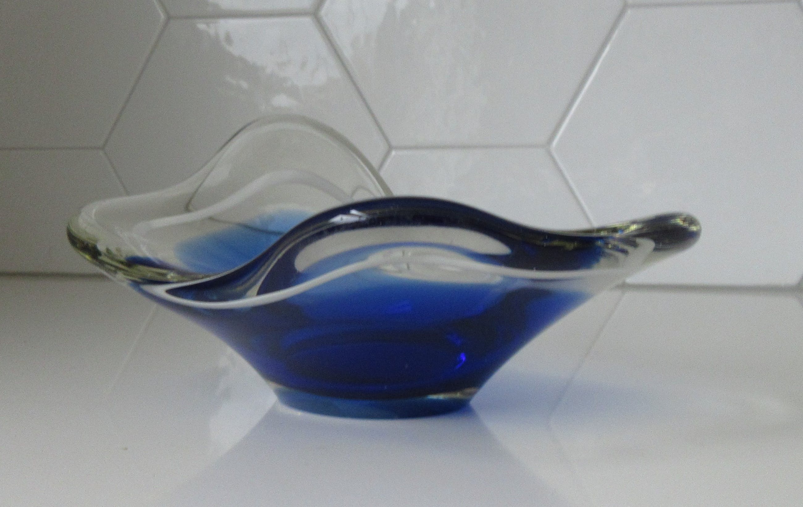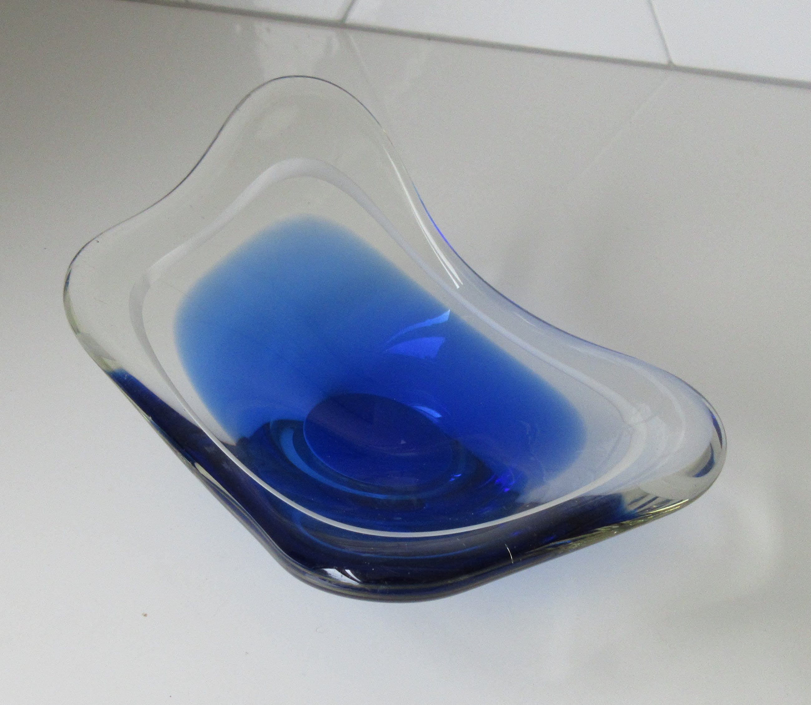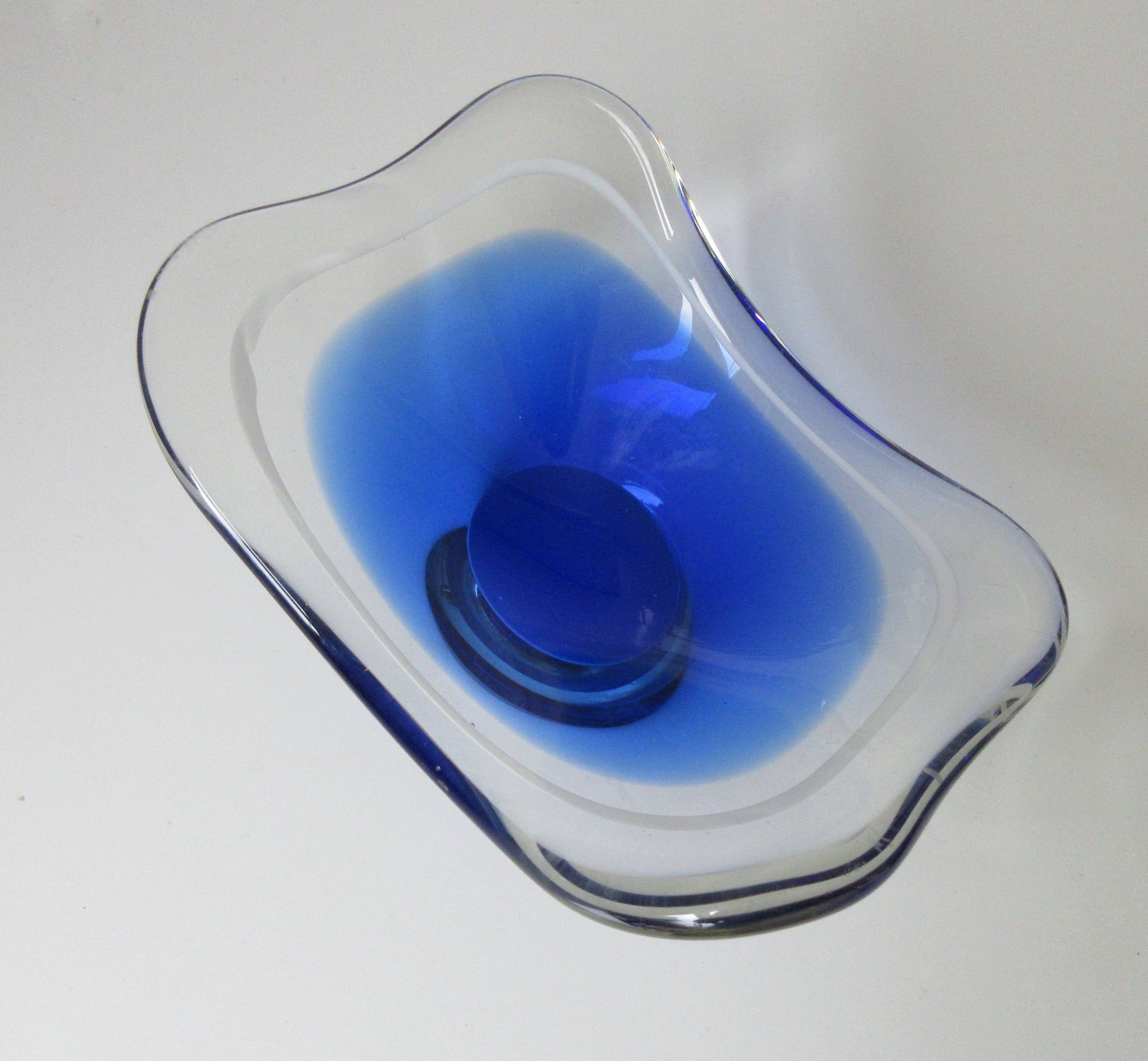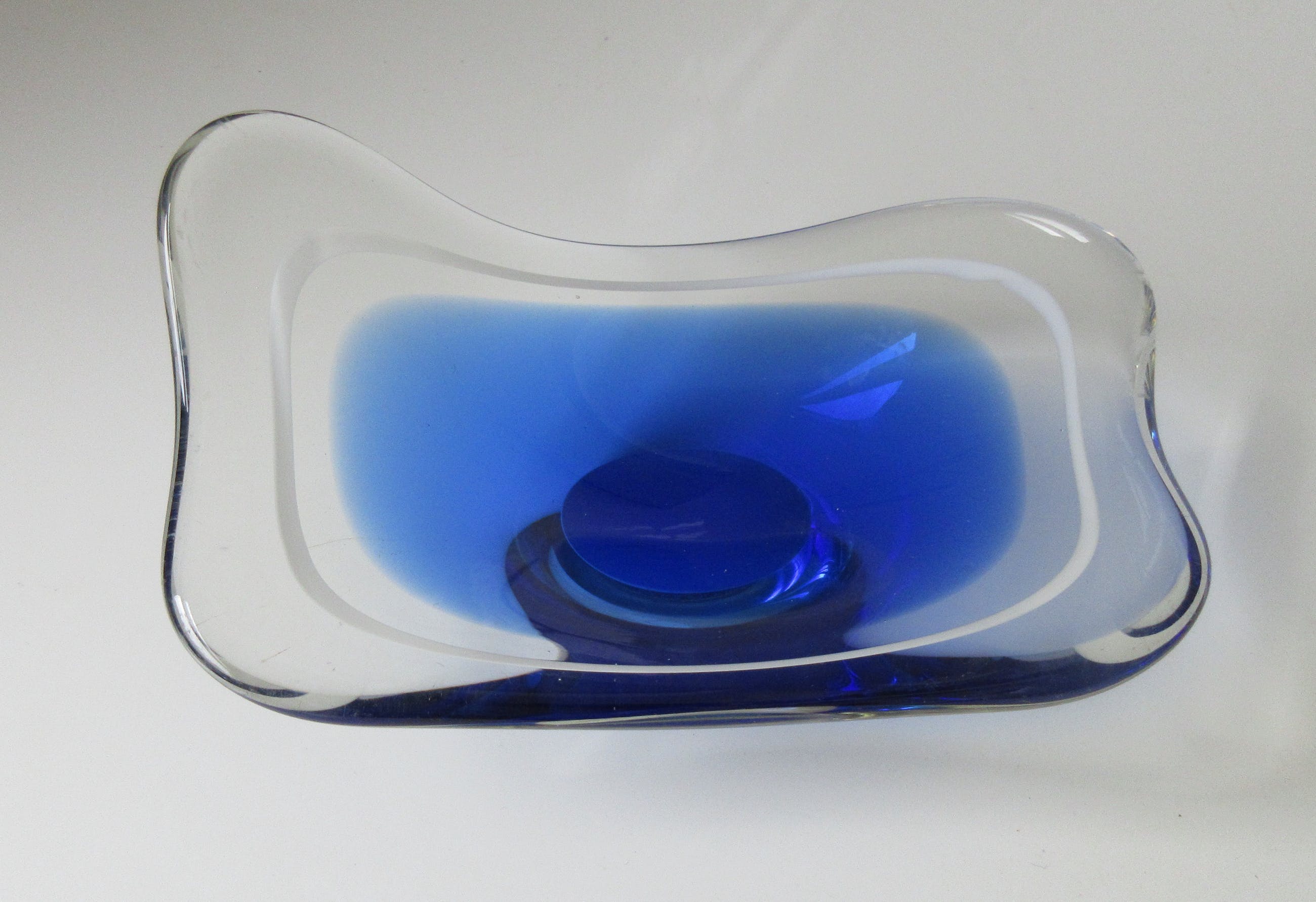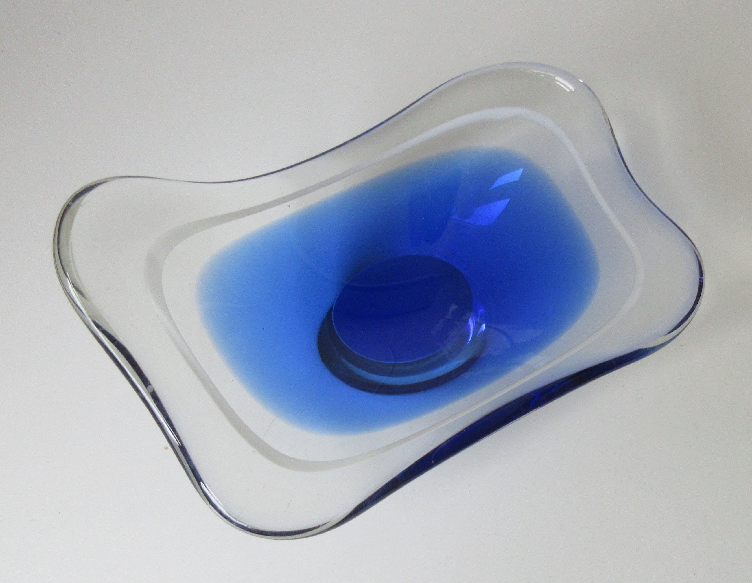 Mooie grote Coquille schaal in blauw en blank glas met witte binnenrand ontwerp Paul Kedelv voor Flygsfors. Zeldzaam stuk. In zeer goede conditie, alleen de voer heeft veel gebruikskrasjes. Gesigneerd met diamantpen Flygsfors, Kedelv en gedateerd '52.