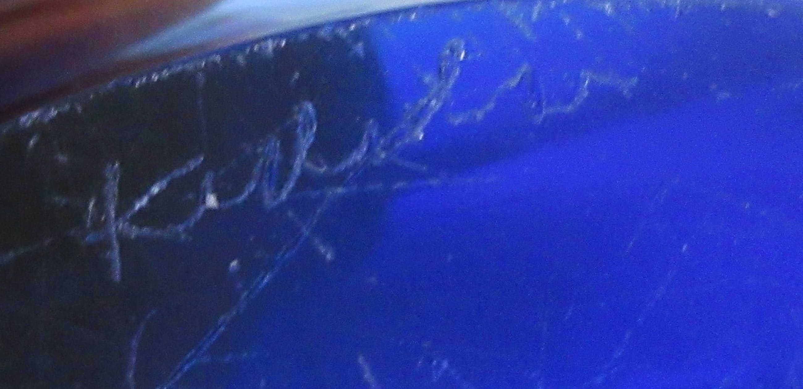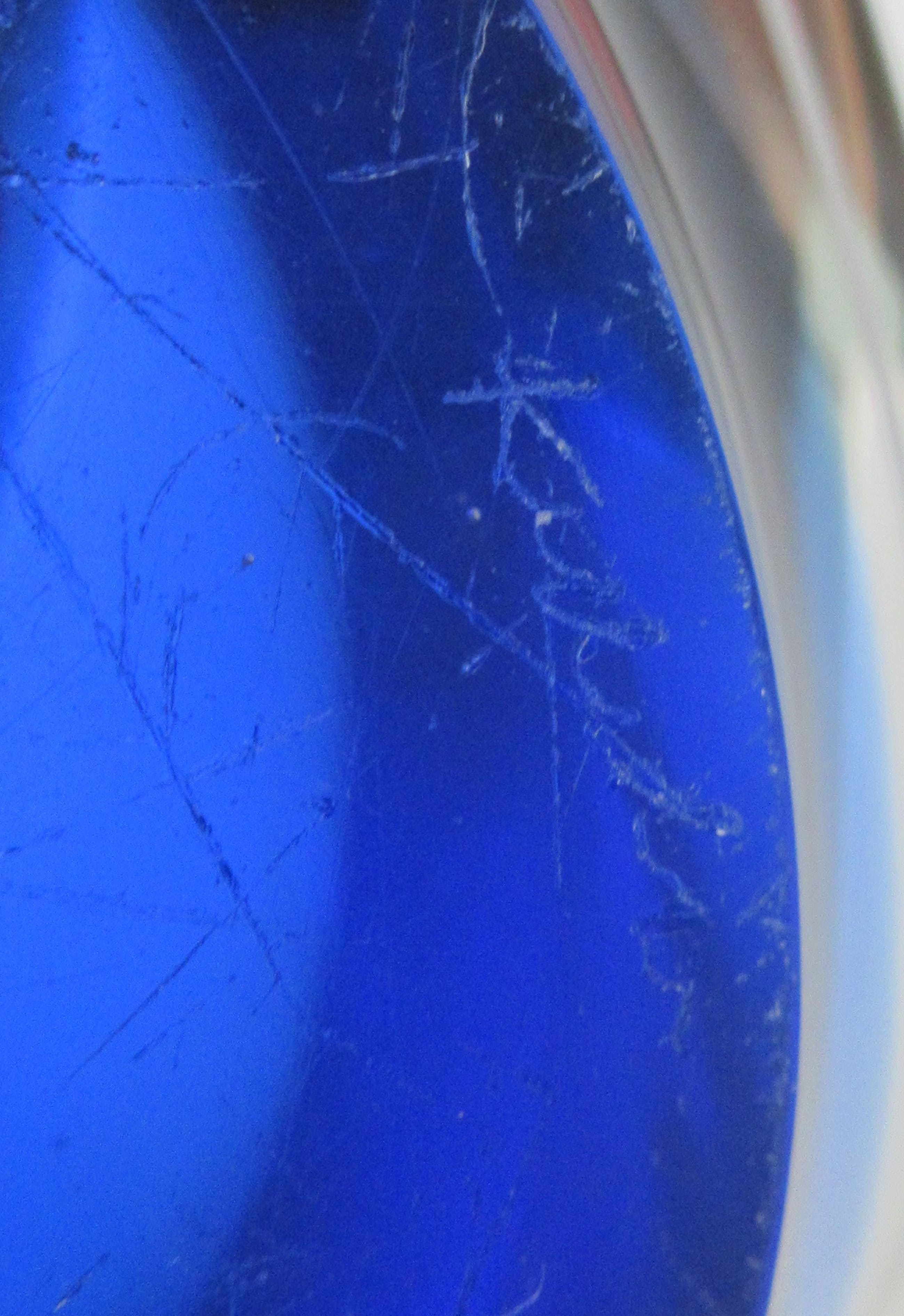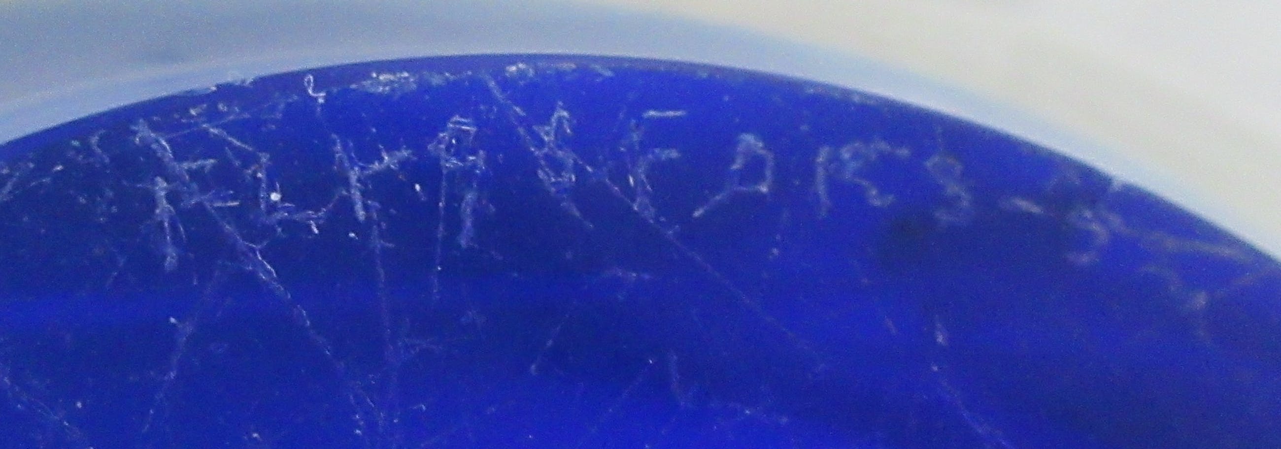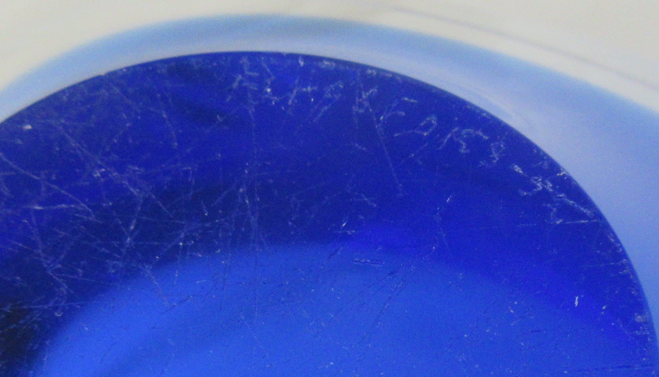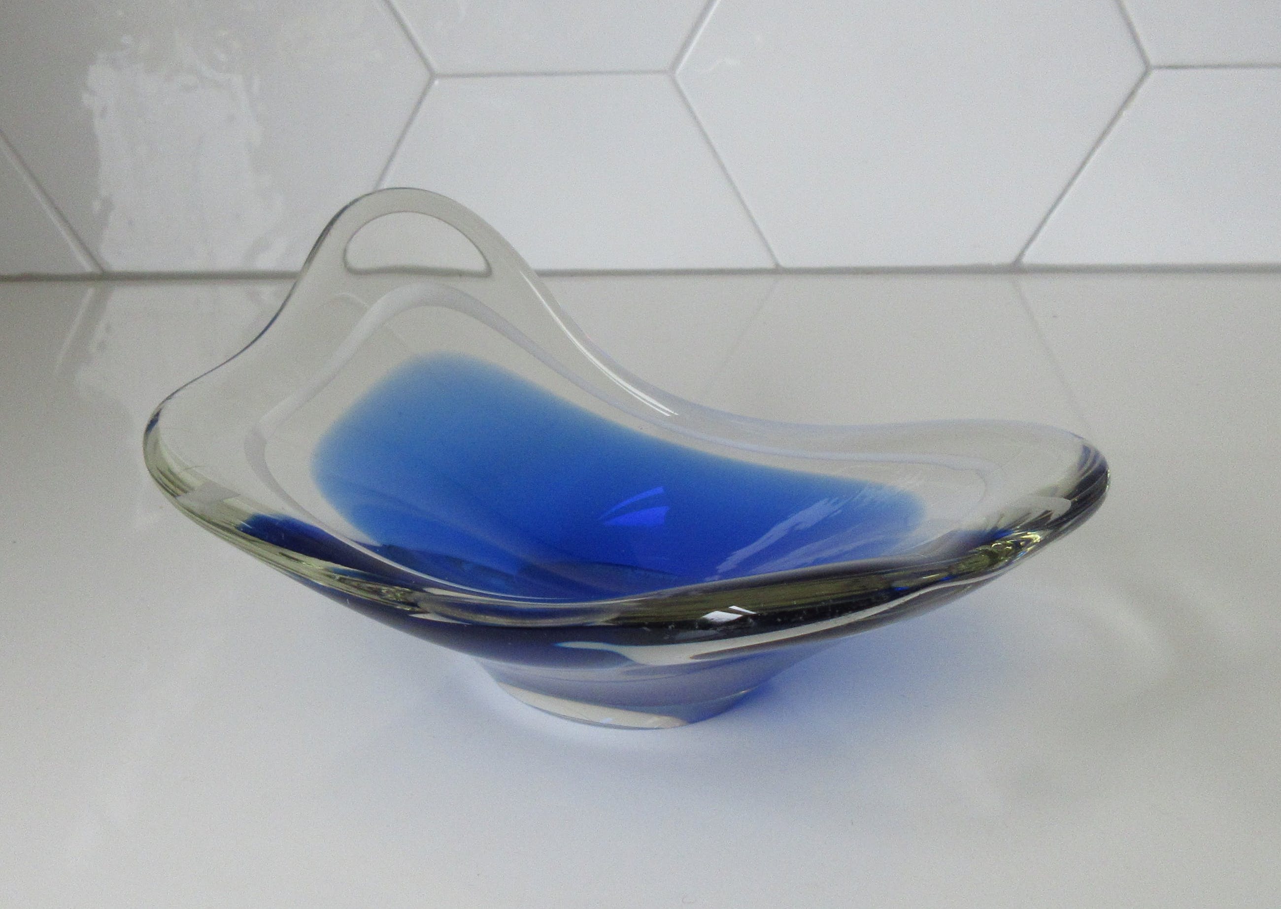 Mooie grote Coquille schaal in blauw en blank glas met witte binnenrand ontwerp Paul Kedelv voor Flygsfors. Zeldzaam stuk. In zeer goede conditie, alleen de voer heeft veel gebruikskrasjes. Gesigneerd met diamantpen Flygsfors, Kedelv en gedateerd '52.