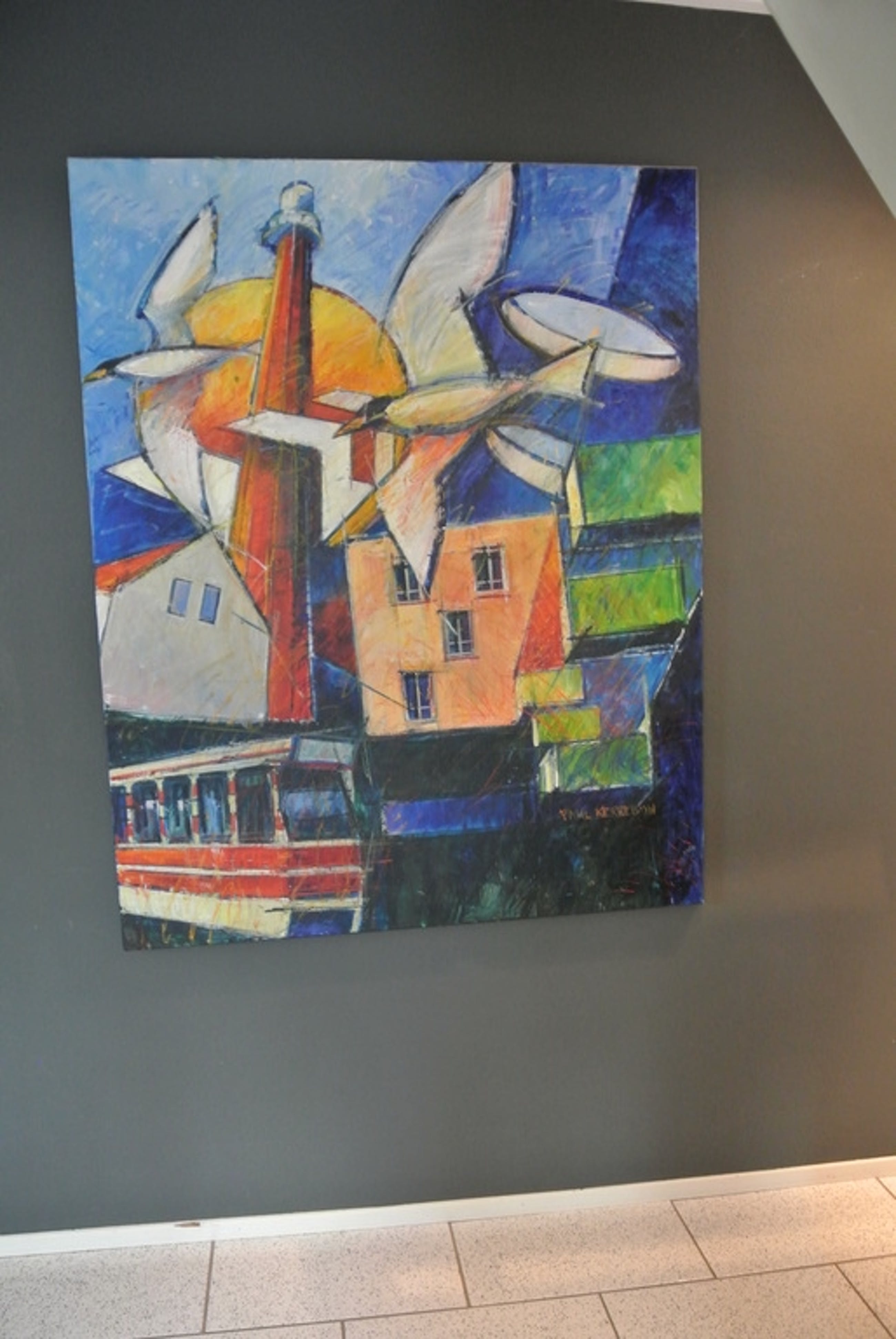 De afmeting is 1.50 mtr bij 1.20 mtr. in heldere kleuren herkenbare elementen van Den Haag en Scheveningen.