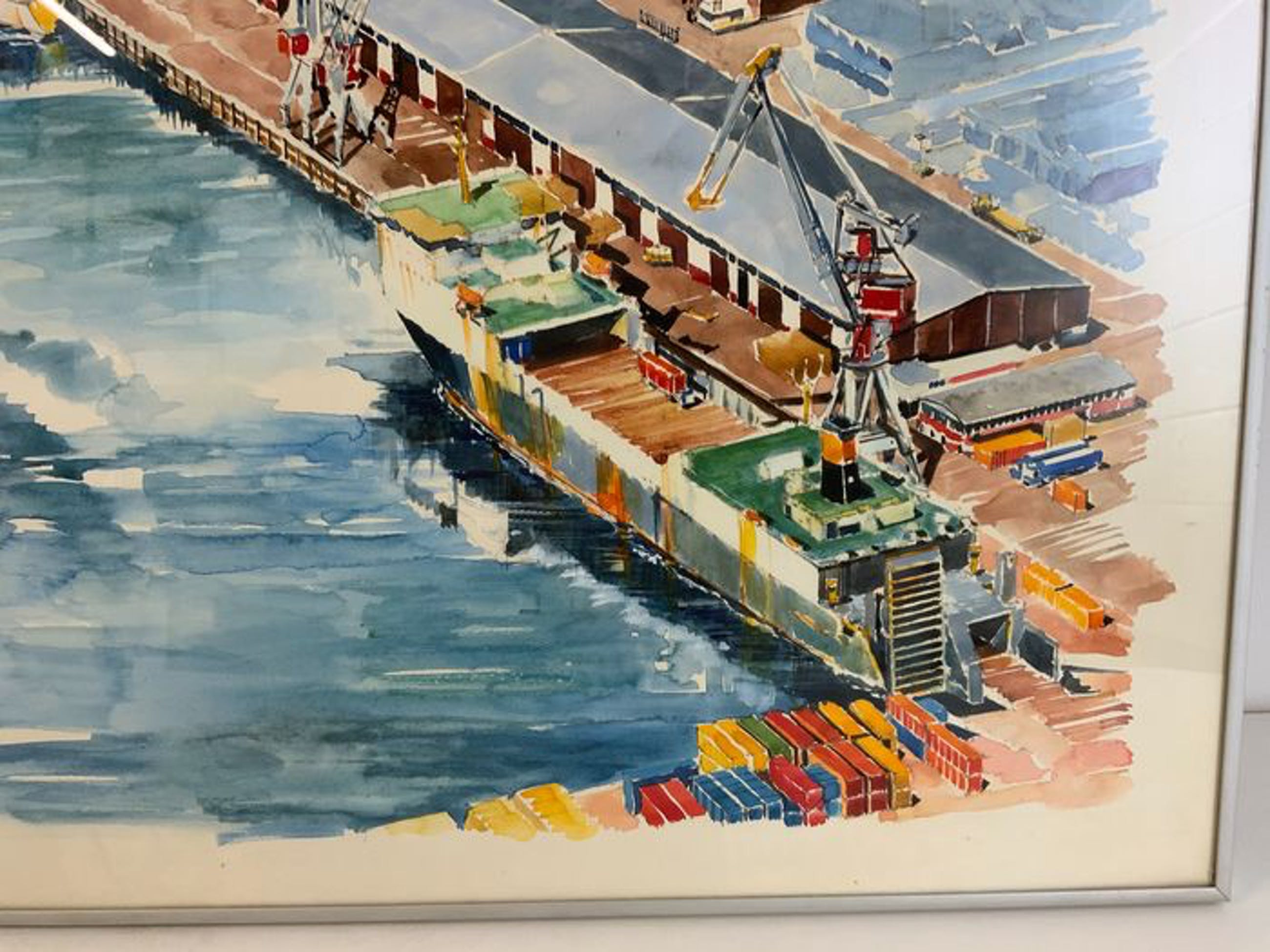 Het is een grote tekening/aquarel van een havenarm. Alle onderdelen zijn minutieus in kaart gebracht. Het is een mooi en kleurig werk.