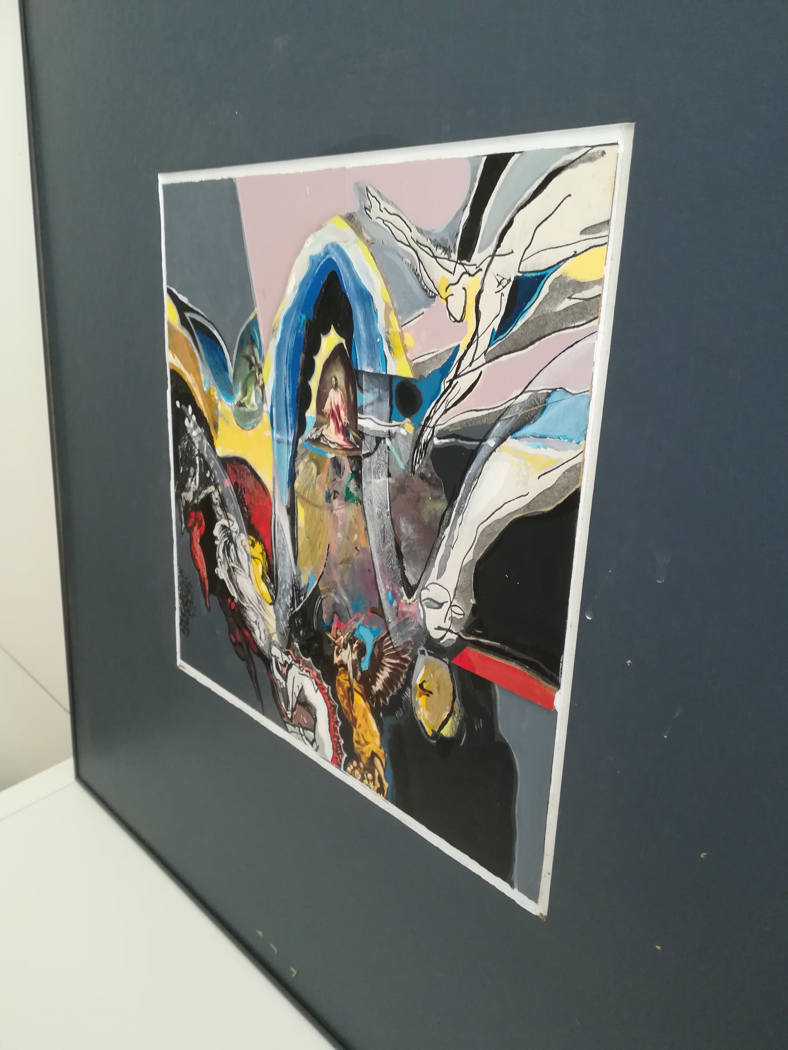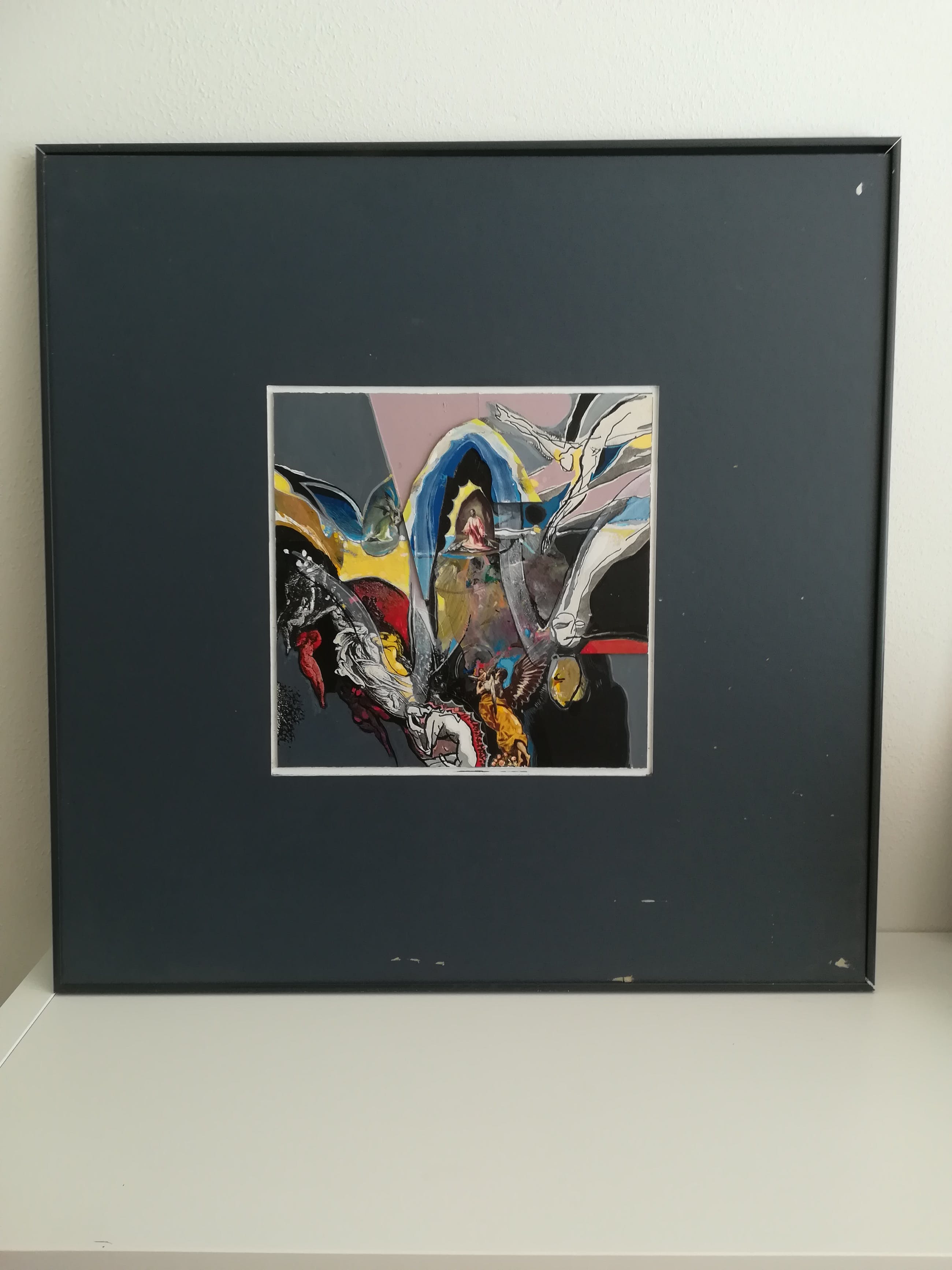 Deze collage zou een voorstudie kunnen zijn. Afmetingen: 32x32 cm, passe-partout 71x71 cm. Naam op achterzijde.