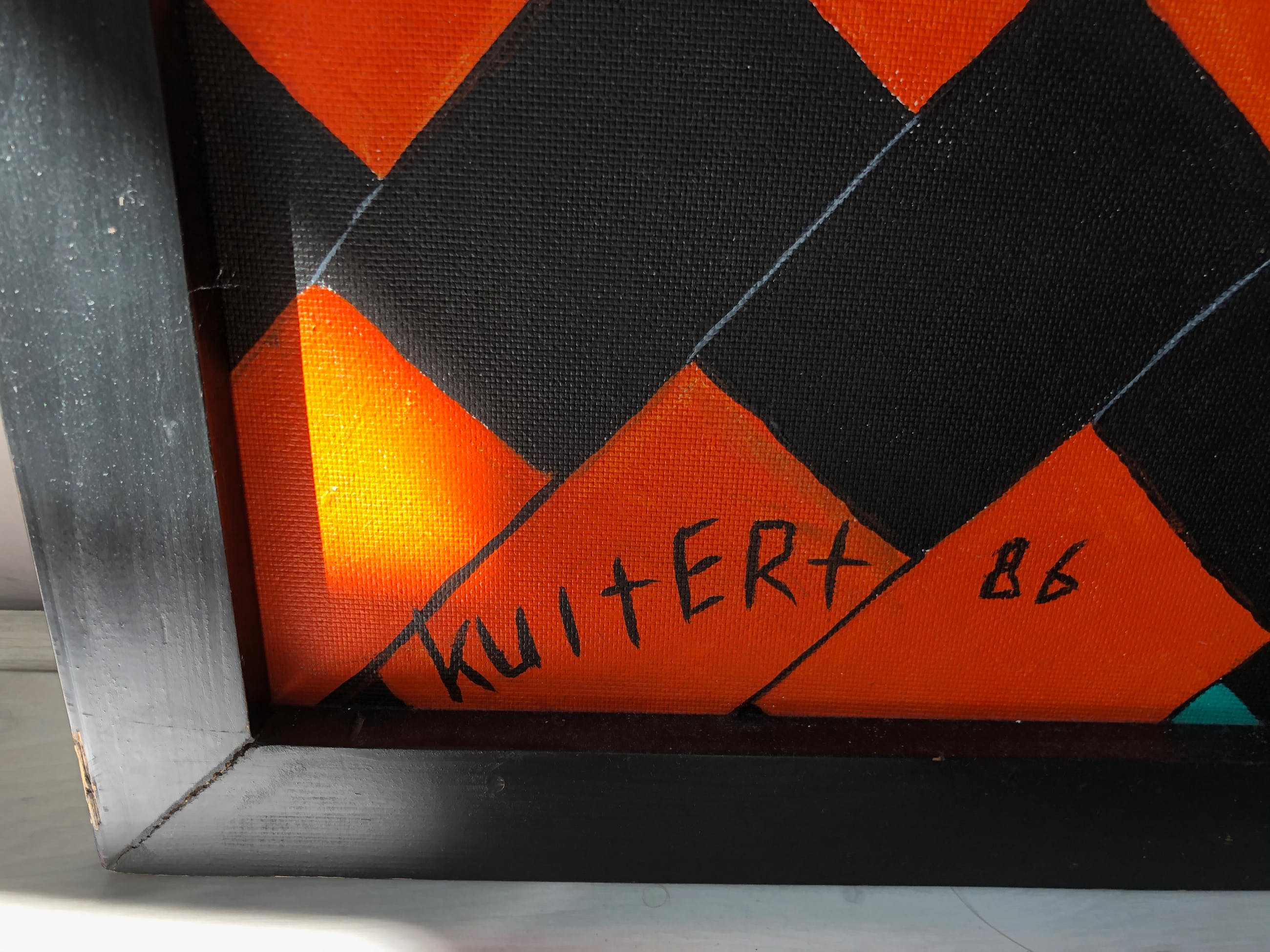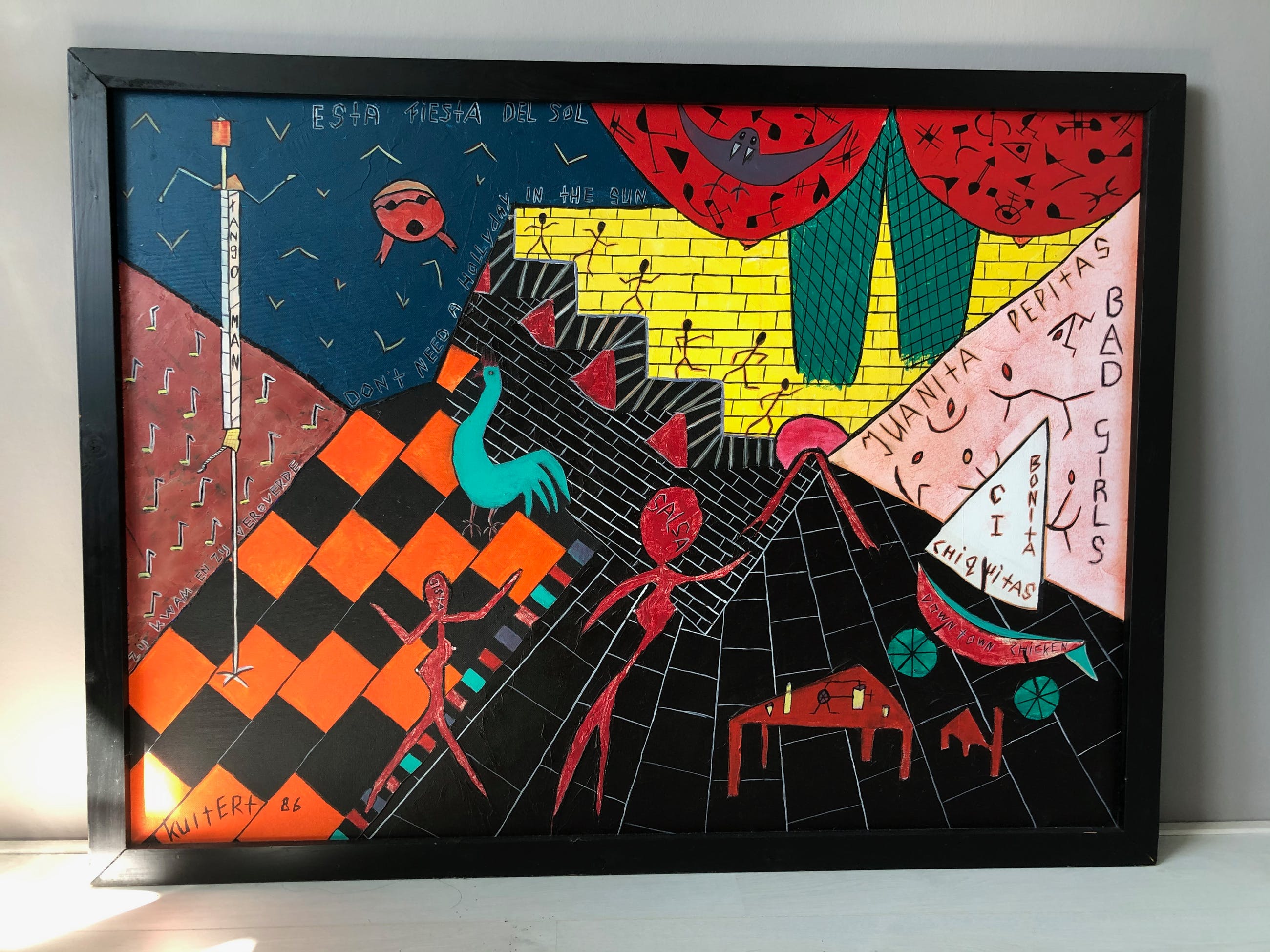 Origineel werk van Paul Louis Kuitert. Afbeelding met diverse dansende figuren en teksten in Engels en Spaans.