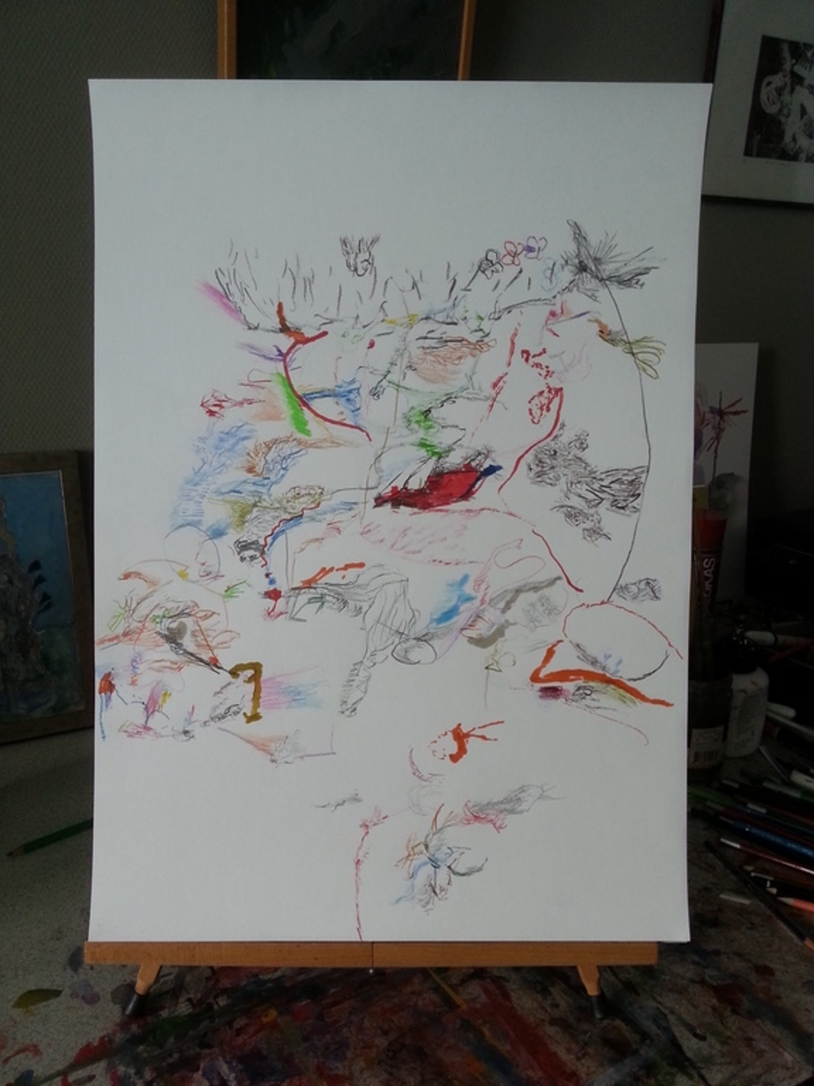 Materiaal: Acryl, Potlood, Grafiet, Pantone Letraset pen, viltstift op Schut 125 g/m PH Neutraal Zuurvrij Papier