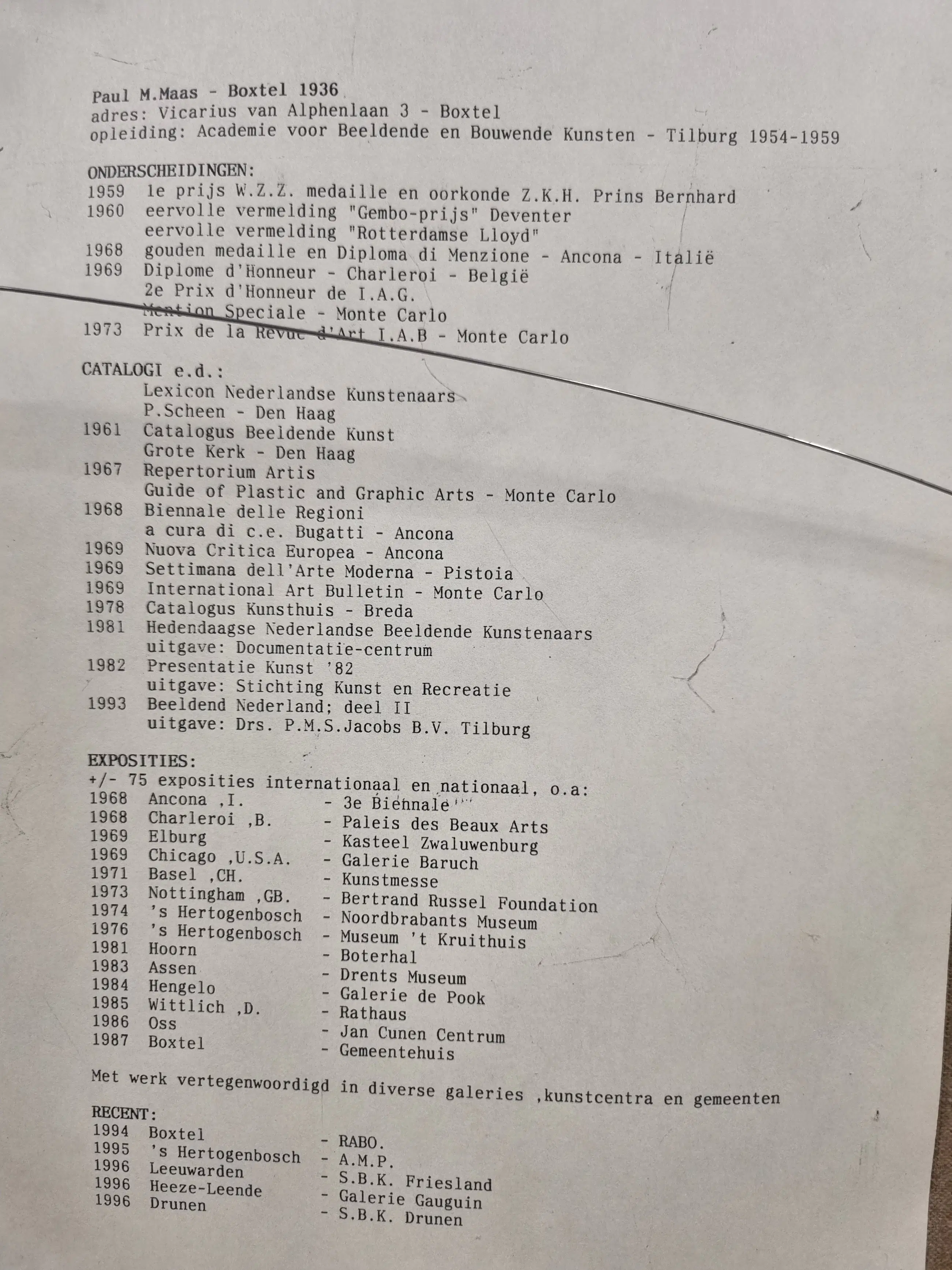 Paul Maas (1936-2021 Boxtel) was graficus en aquarellist, maar voornamelijk schilder. Zijn opleiding volgde hij aan de Academie voor Beeldende Kunsten in Tilburg. Hij was groot bewonderaar van zijn docent Nico Molenkamp. Hij heeft zijn werk als kunstenaar altijd gecombineerd met een baan als tekenleraar. Zijn werk is Lyrisch-abstract te noemen. Paul heeft een groot aantal onderscheidingen nationaal en internationaal ontvangen. Na de jaren 60 werd zijn stijl steeds abstracter. Grafiek en aquarelleren waren destijds zijn sterkste kanten, maar die weg zou hij niet kiezen. “Nee, schilderen met olieverf op doek trok me het meeste aan. Die andere technieken beheerste ik wel, daar zat niet genoeg spanning voor me in. Ik zocht juist de strijd, die uitdaging. Dat heb ik altijd nodig gehad.” Paul vertelt over zijn grote inspirator de Brabantse kunstschilder Nico Molenkamp, wiens werk hij altijd bijzonder respecteerde. “Dat was een van de besten; een autoriteit op dit gebied. Van hem heb ik echt ontzettend veel geleerd.”