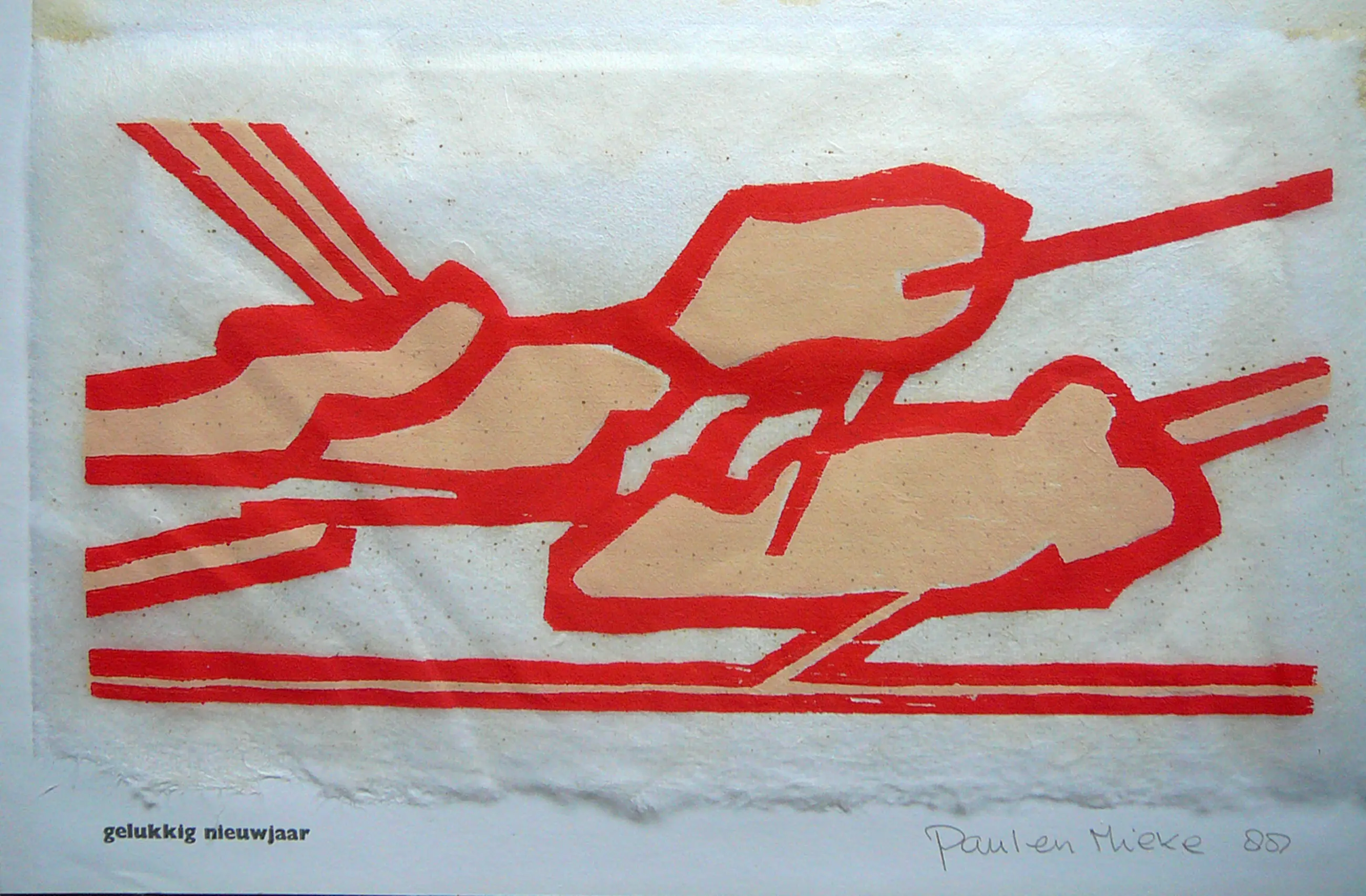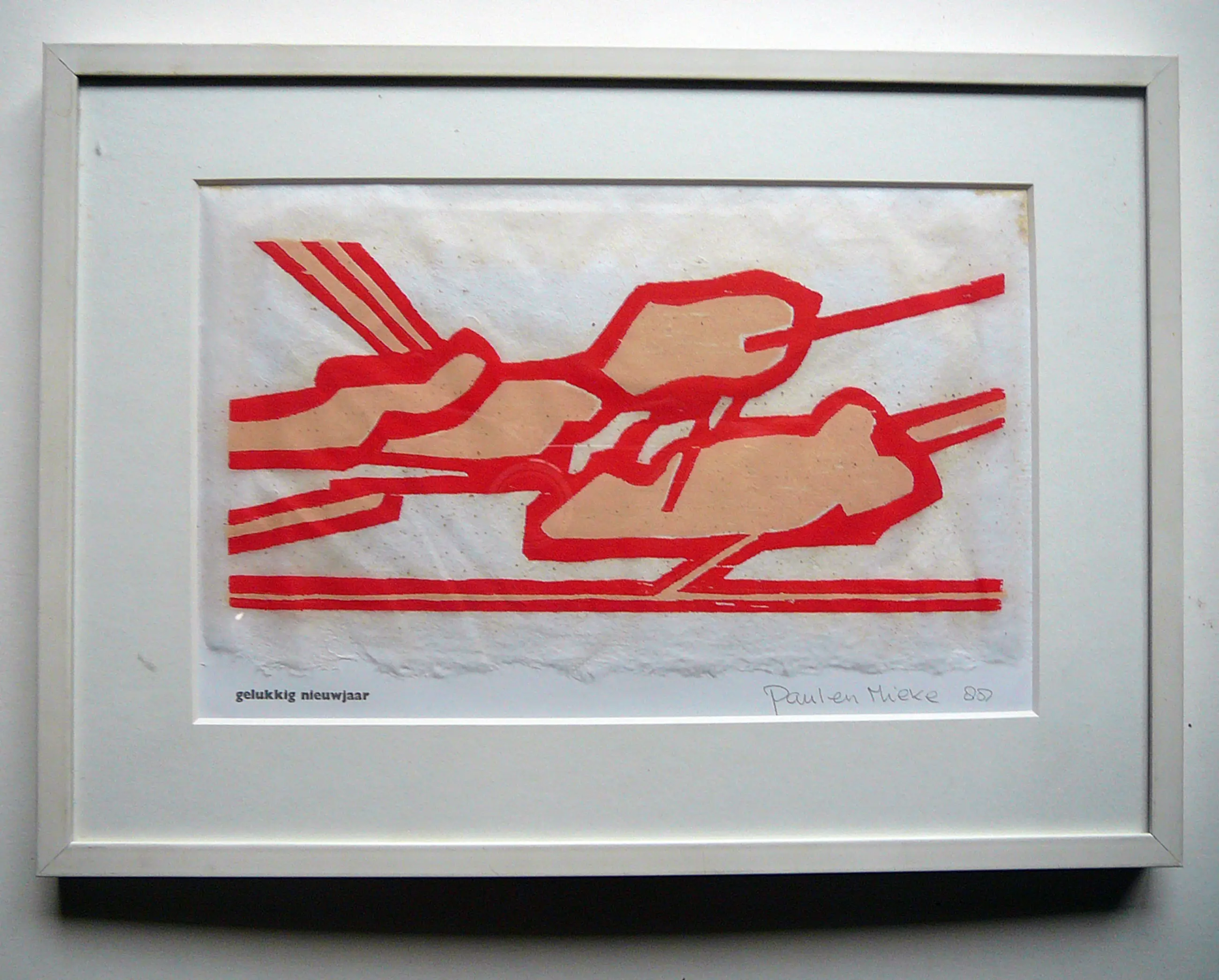 Houtsnede uit 1988 met de beste wensen van Paul Overhaus en Mieke gedrukt op flinterdun Japans papier in een oplage van 350 ex.
