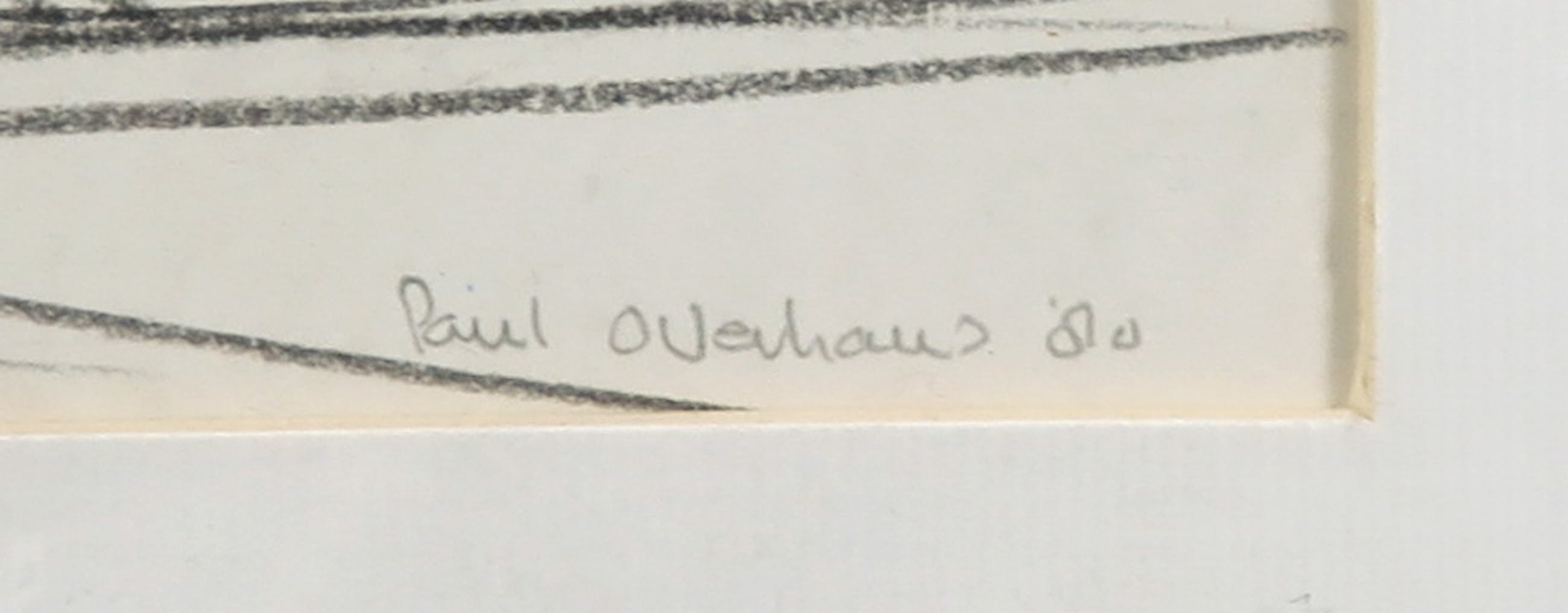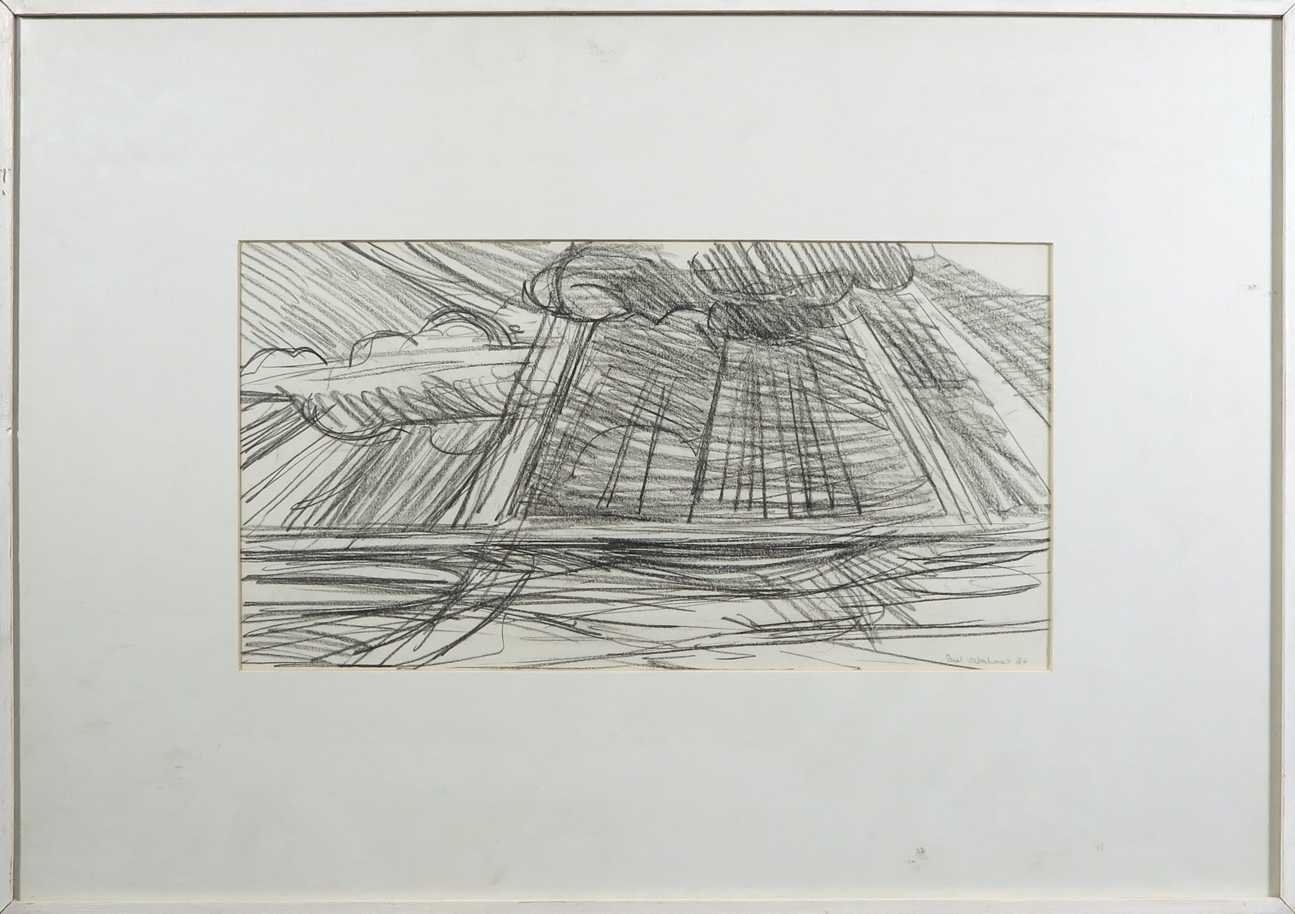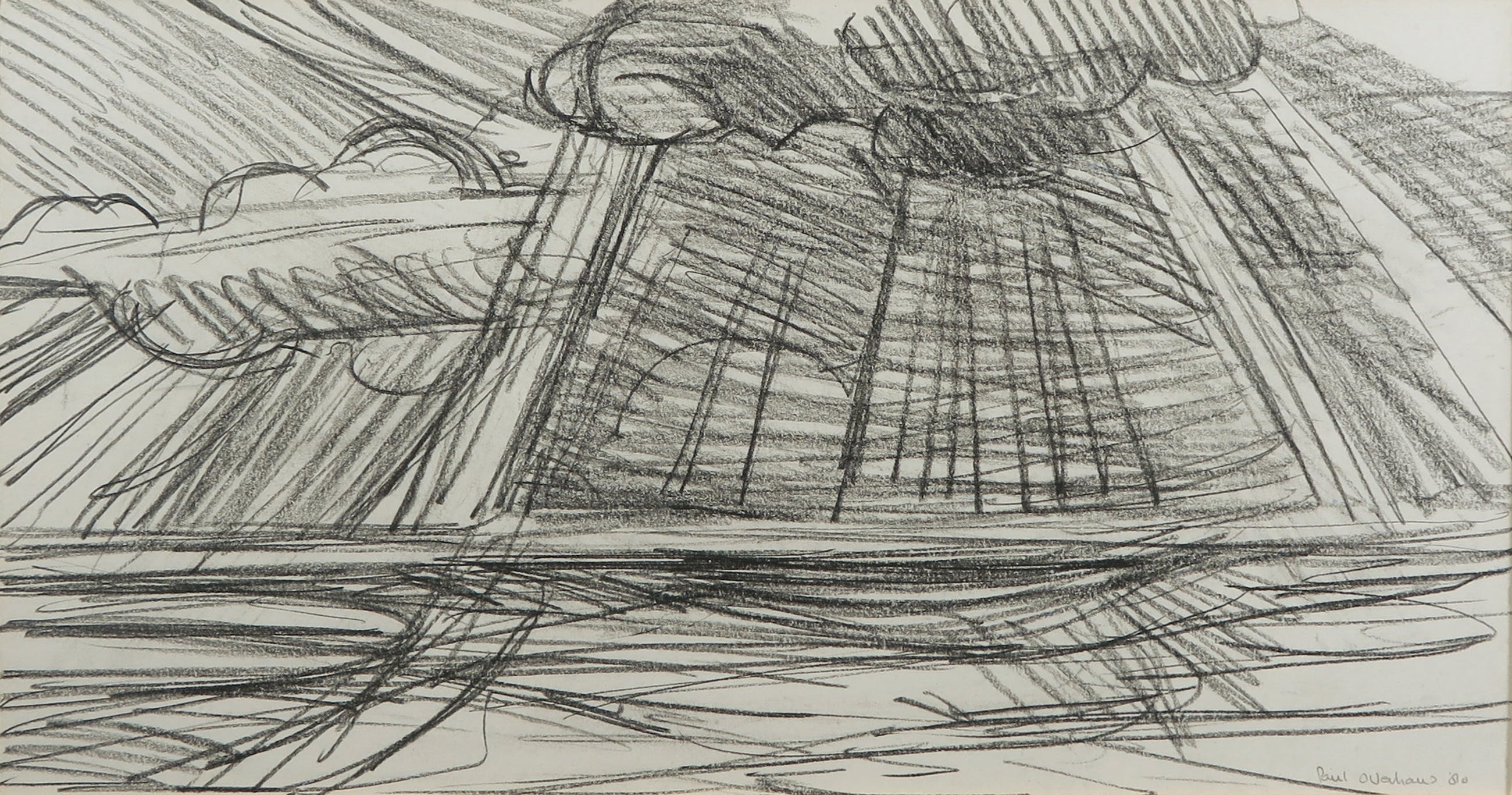 Vlot en krachtige houtskooltekening van een geabstraheerd zeegezicht met imposante wolkpartij en zonneharpen van Paul Overhaus.