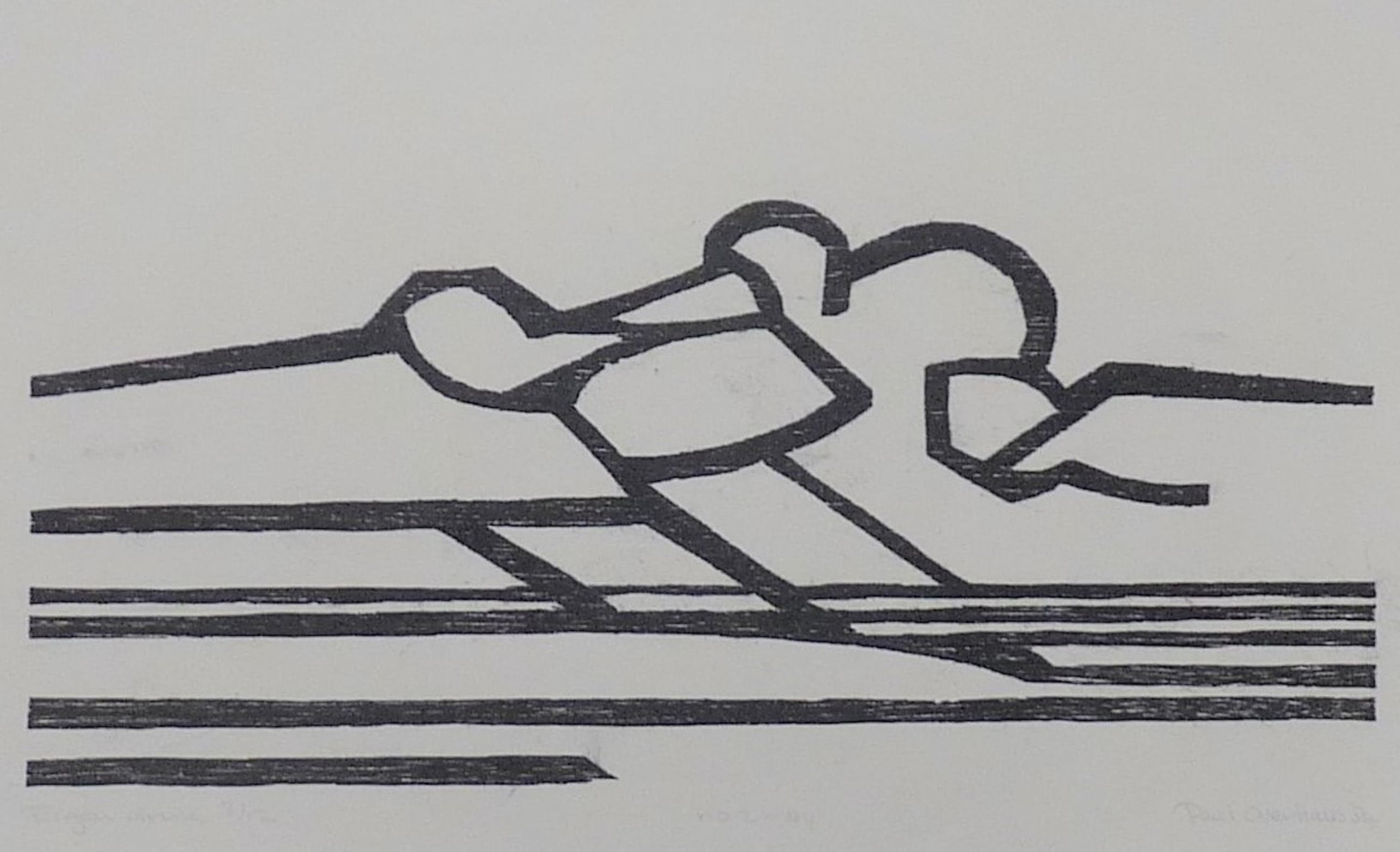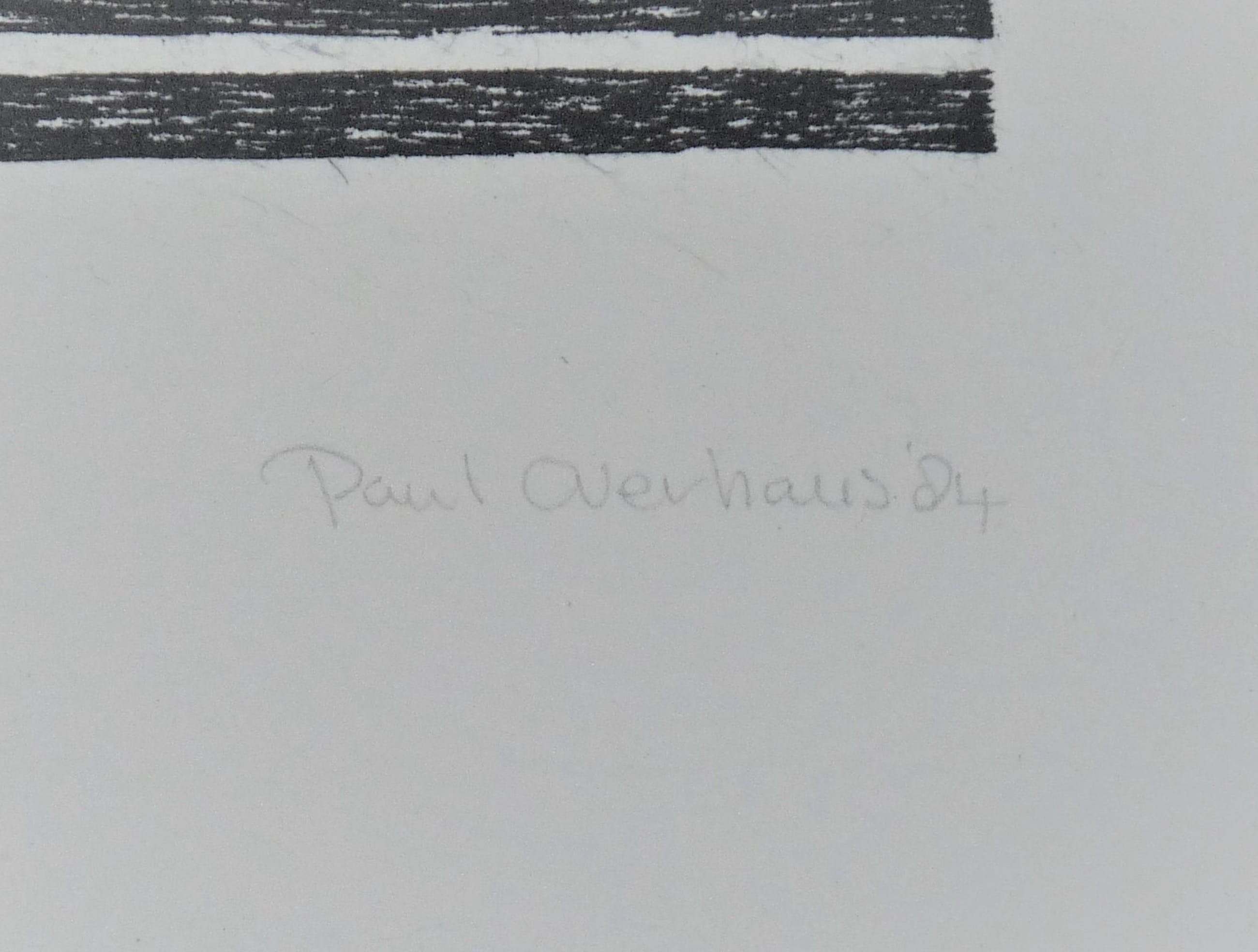 * Fraaie houtsnede op dun japans papier op stevig papier verlijmd. Uitstekend verlijmd door de kunstenaar of laten doen. * Druk in klein oplage van slechts 12 exemplaren. Genummerd en gesigneerd. In potlood van links naar rechts: Eigen druk 3/12 - no.2 - 84 - Paul Overhaus '84