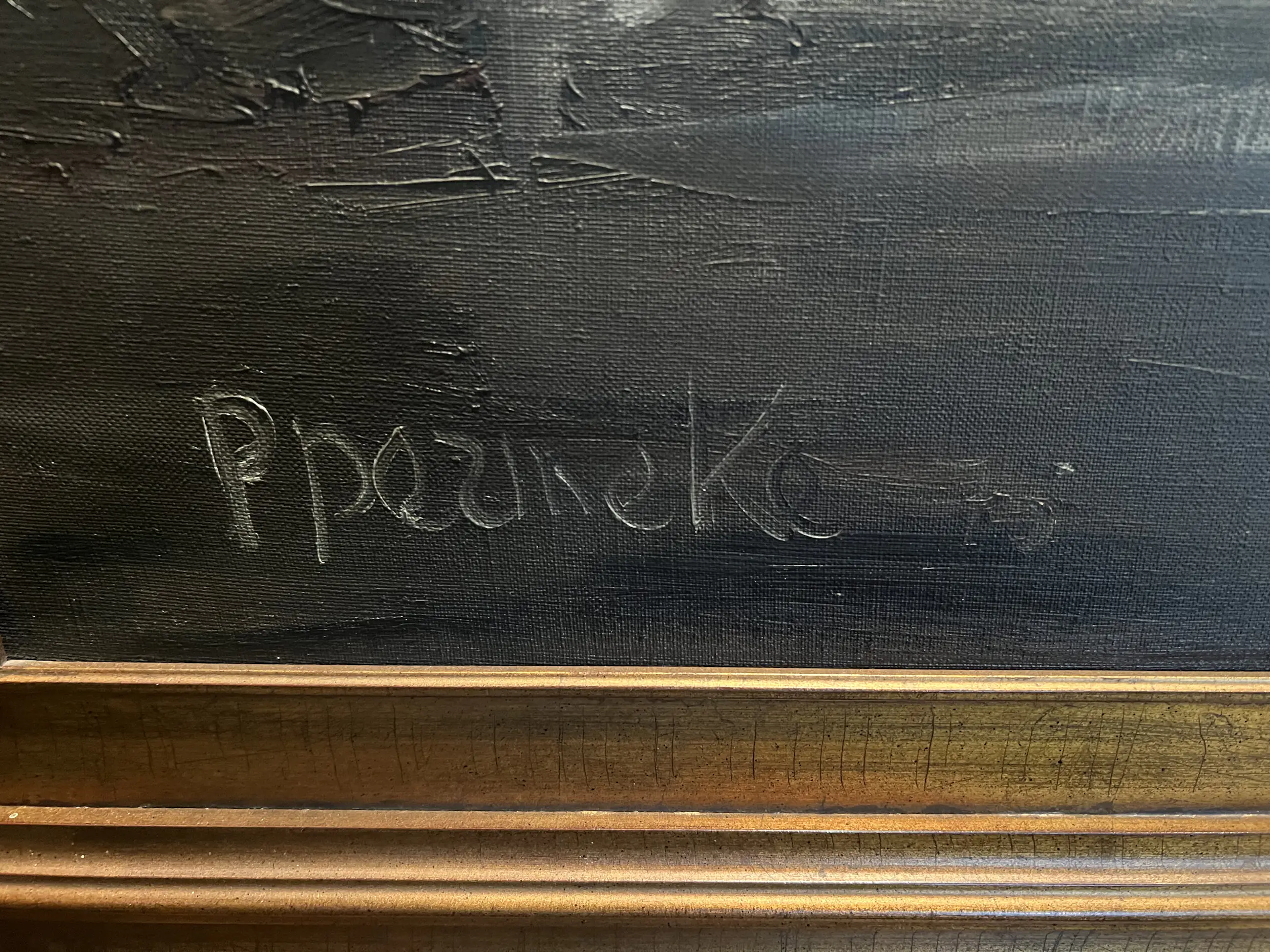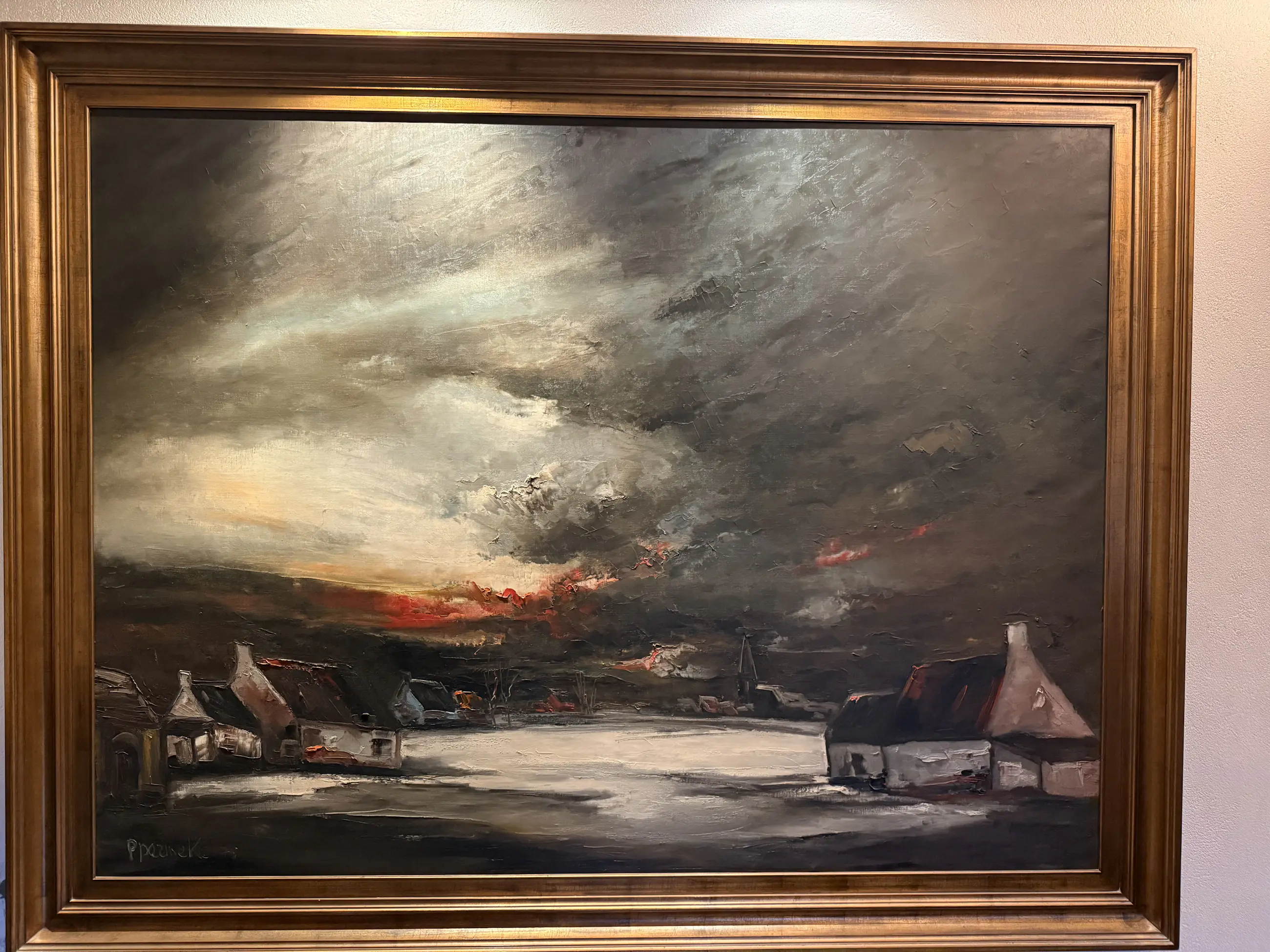 Indrukwekkend, grootschalig winterlandschap met laag dorpsgezicht onder een dramatische lucht, uitgevoerd in krachtige penseelstreken en een warm-contrasterend kleurenpalet. Het werk toont Paul Permeke’s kenmerkende expressieve visie op het Vlaamse landschap, ruig, geladen en poëtisch - ingelijst