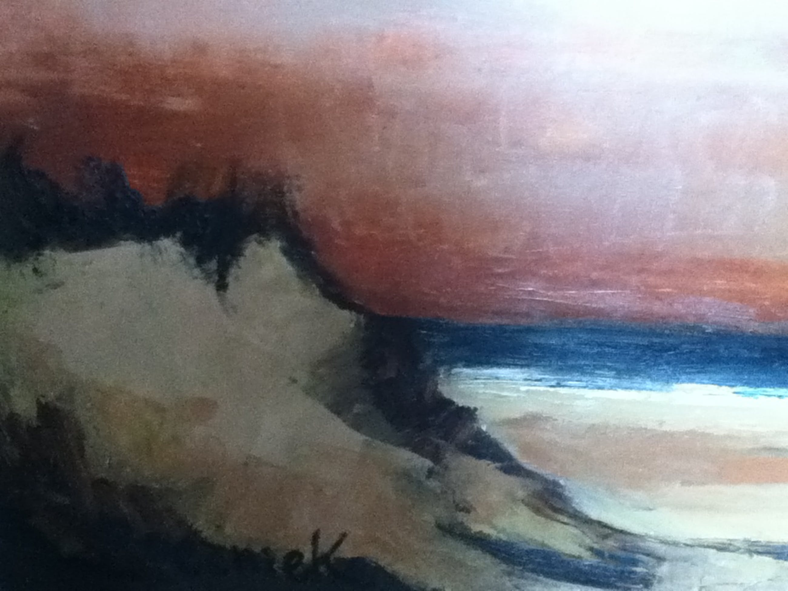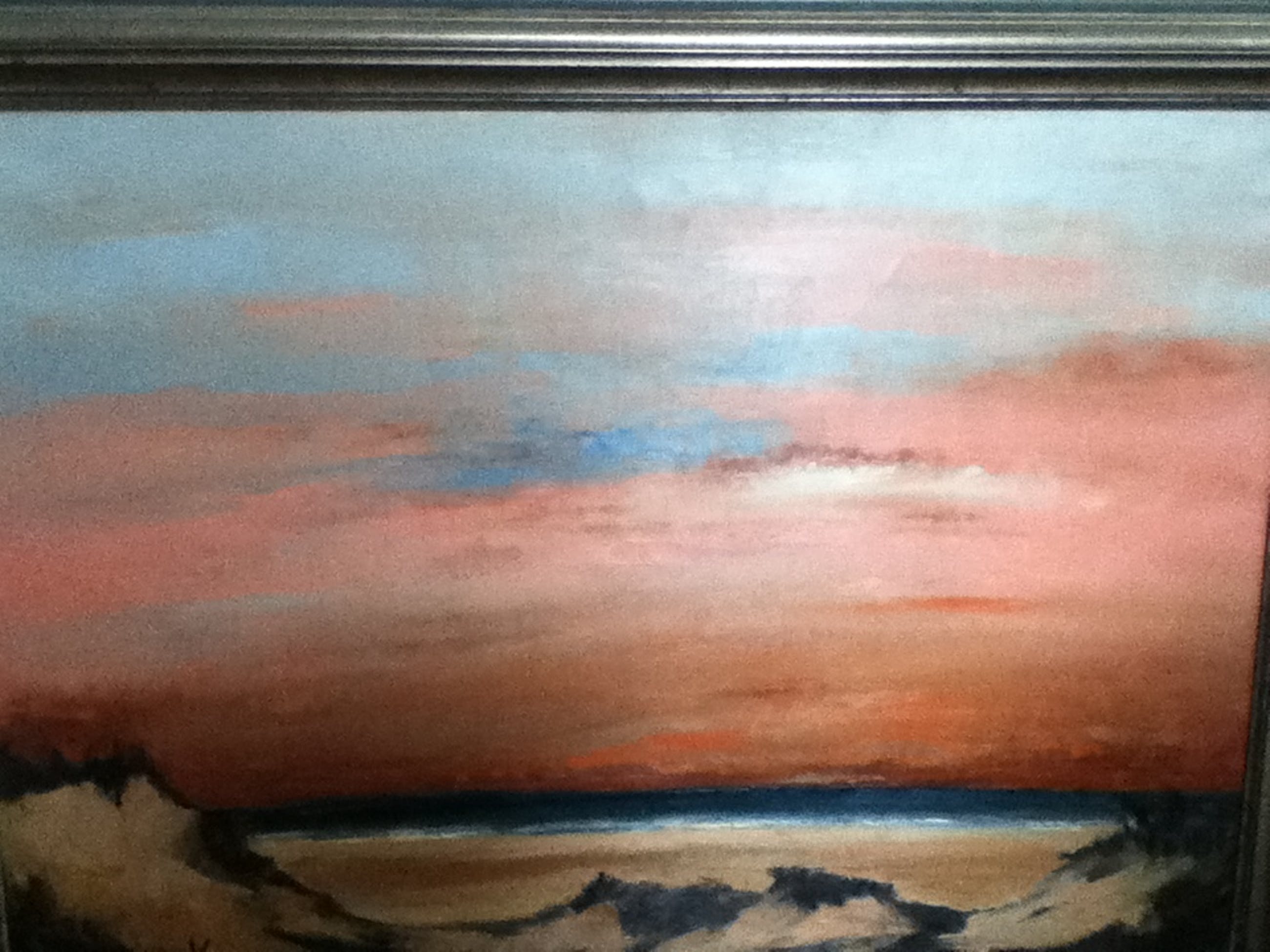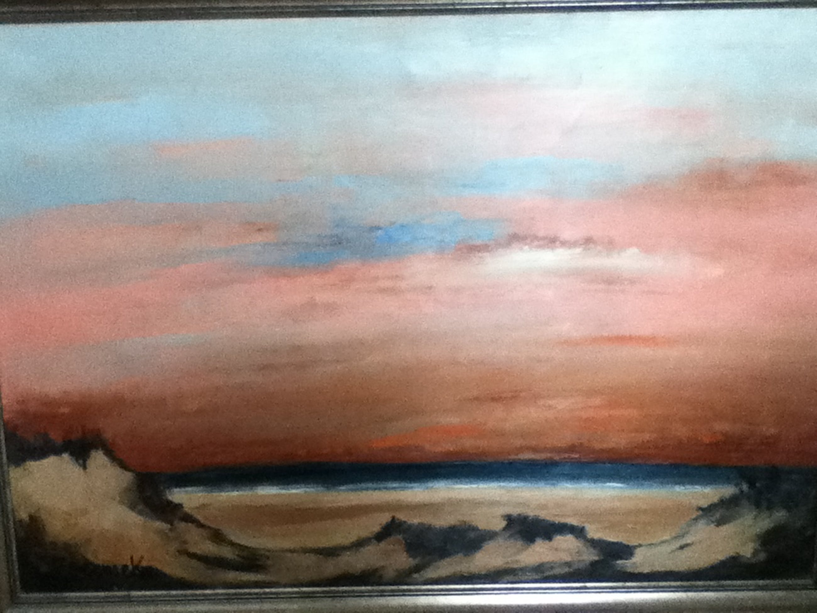 Prachtige zonsondergang met speciaal kleurpalet. Krachtig expressief geschilderd. Zeer mooie kader die er gratis bij is. Koerierdienst is ook mogelijk.