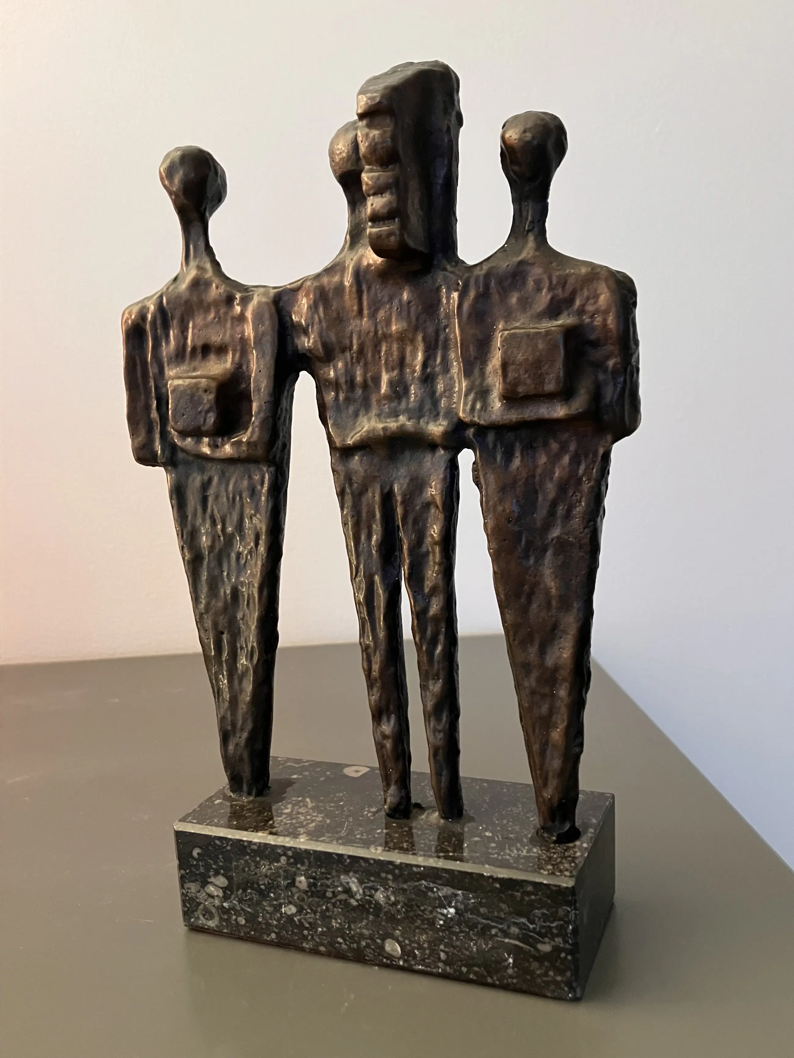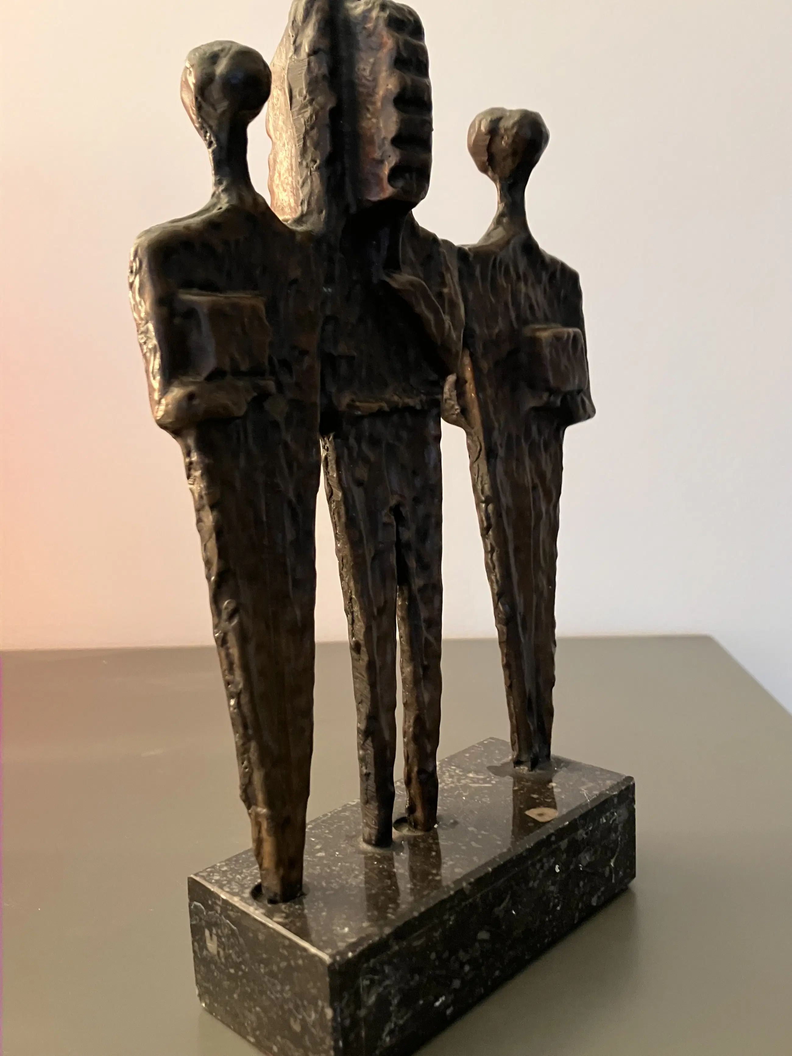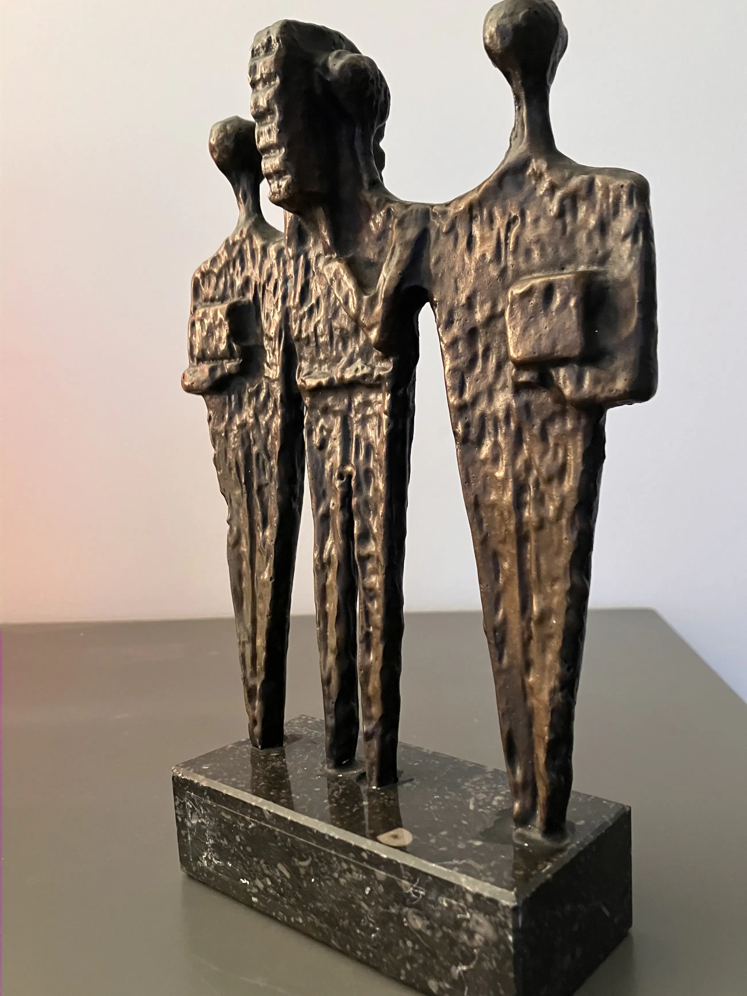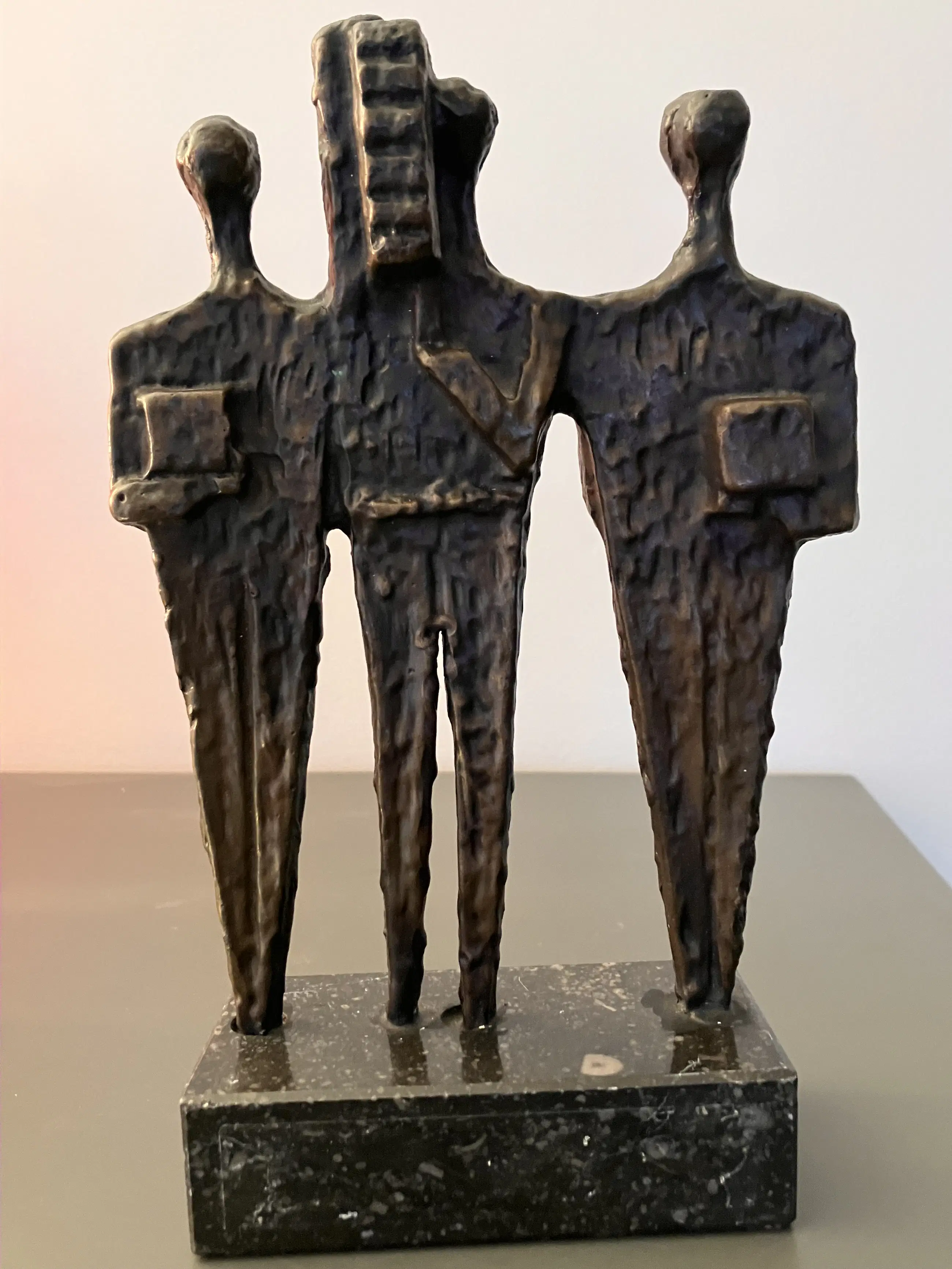 Een weinig voorkomend bronzen beeld van deze kunstenaar. Drie mannen dragen de bouwstenen aan om Samen te bouwen.