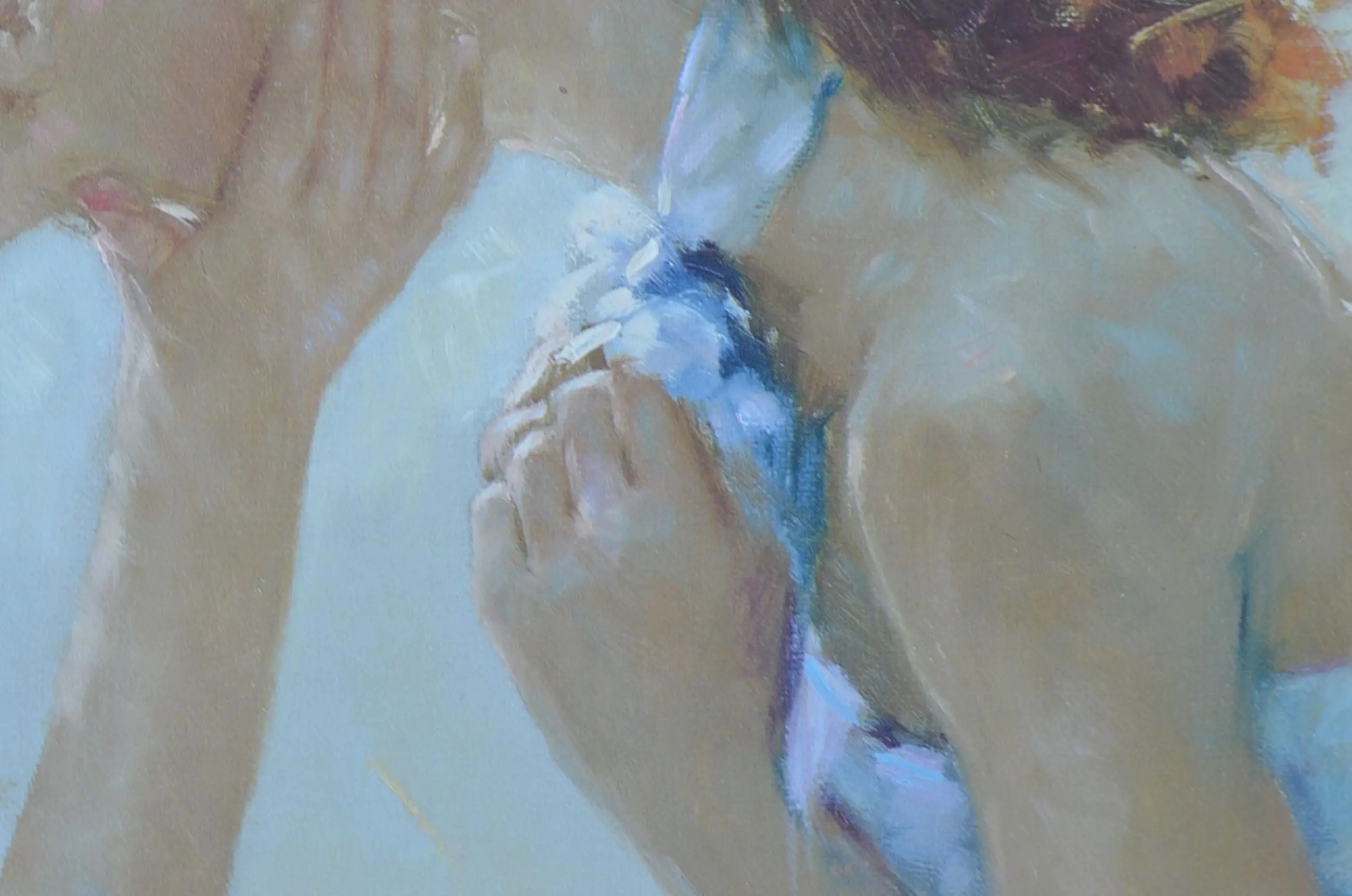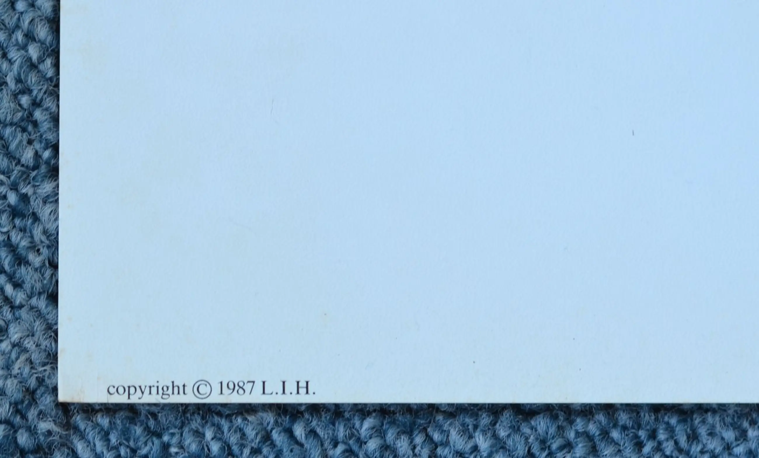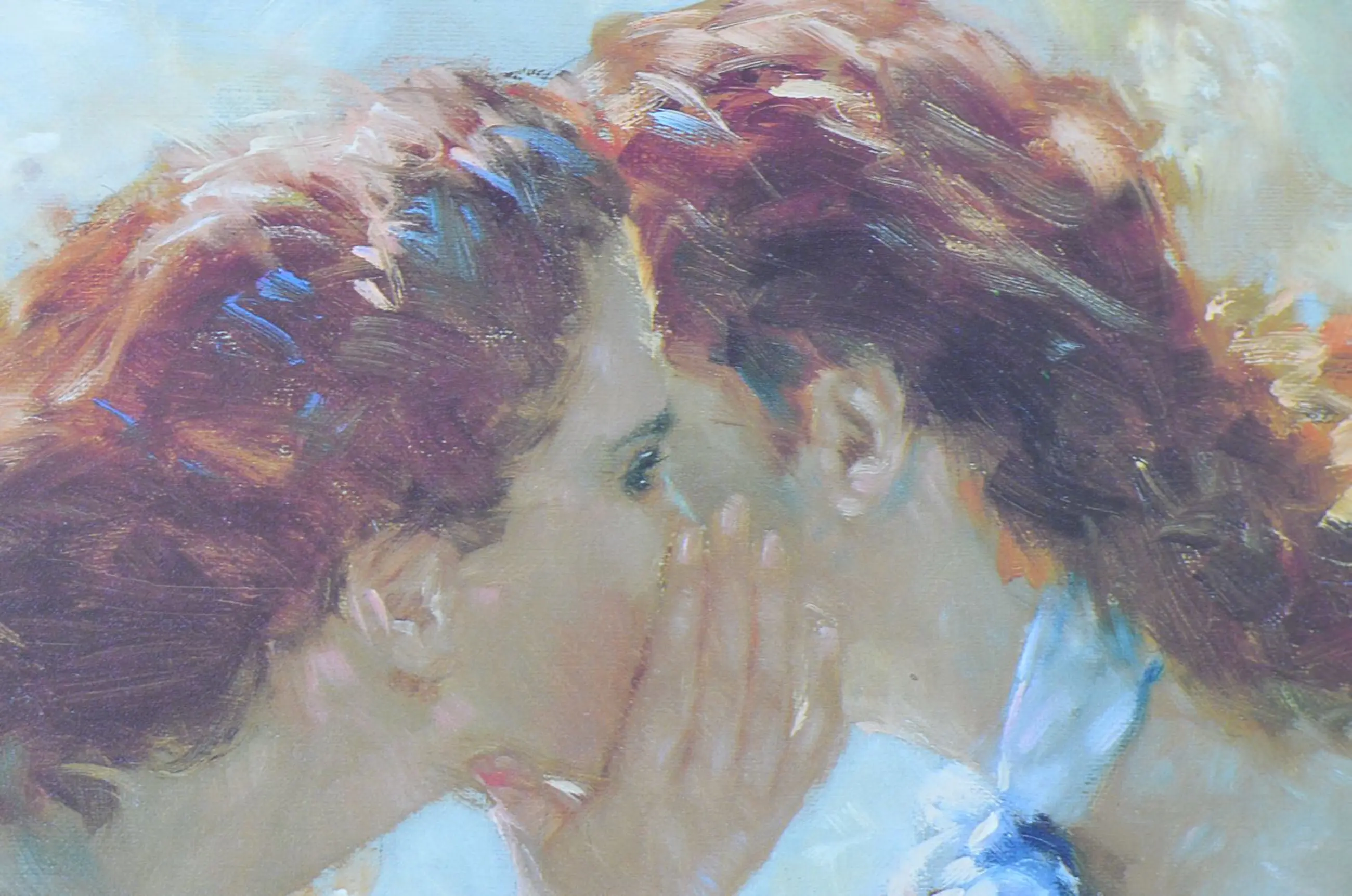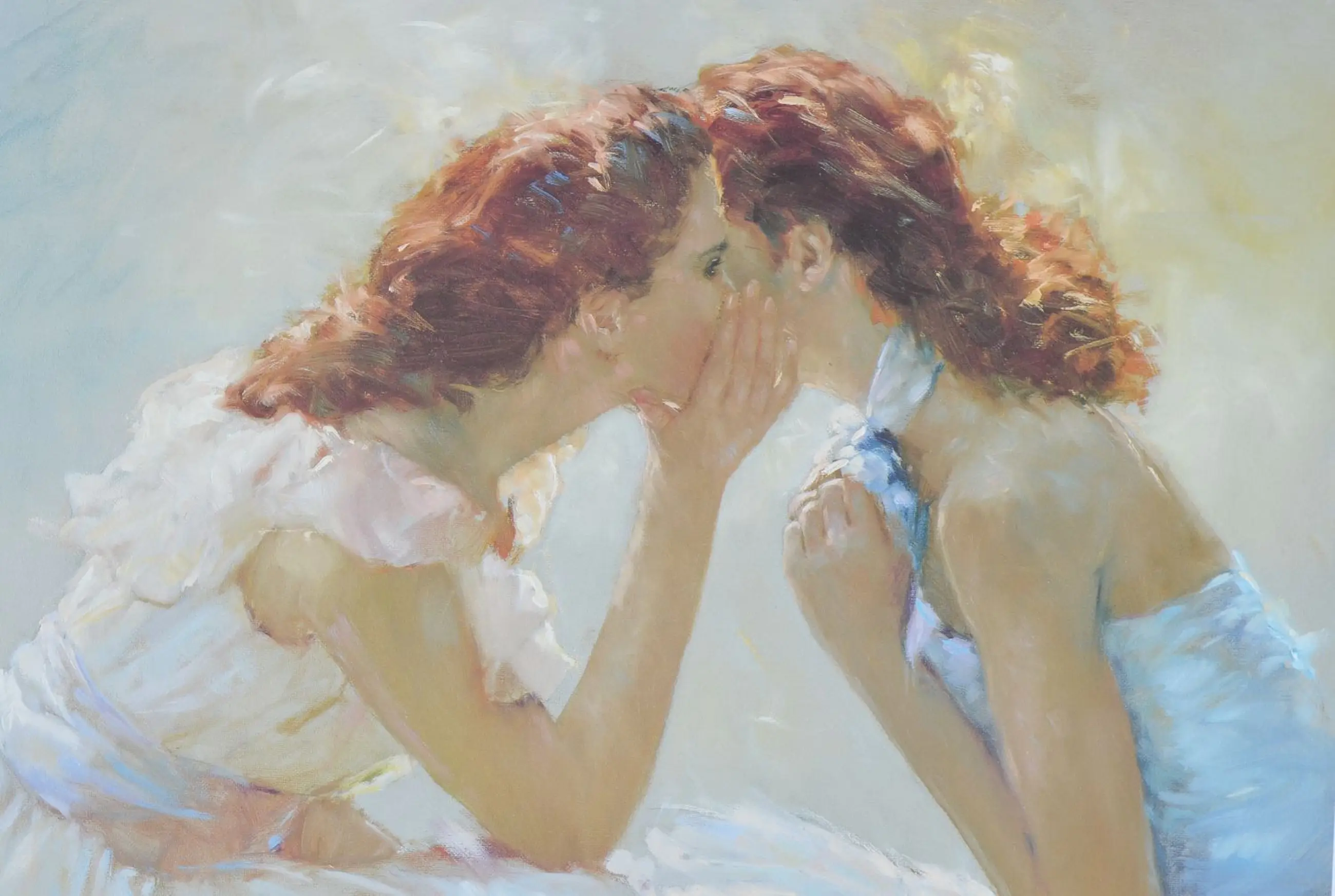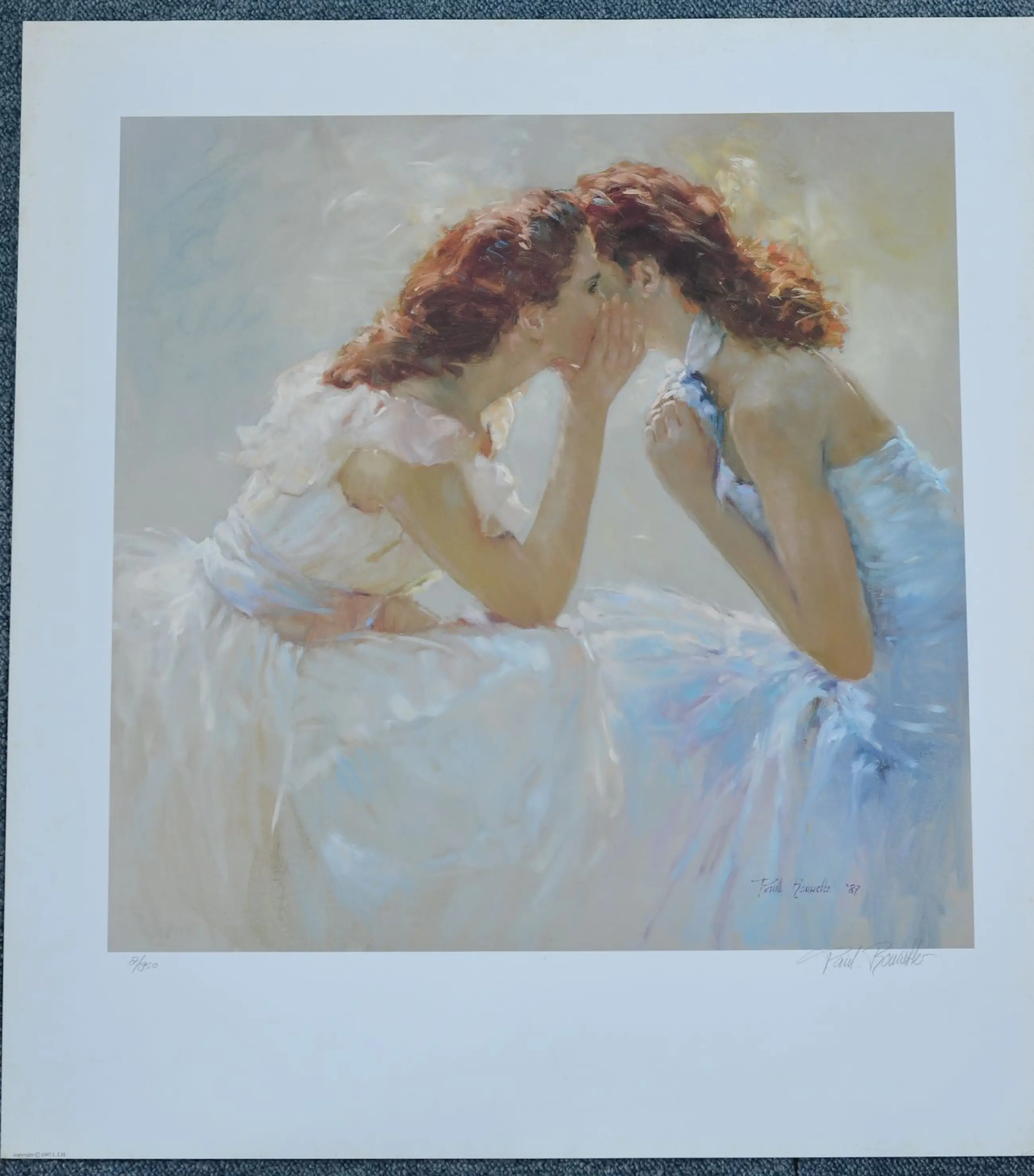 Een litho met twee jonge vrouwen die een geheim met elkaar delen. Het betreft versie 8/1950. Naar voorbeeld van een olieverf schilderij uit 1987. Copyright 1987 L.I.H.