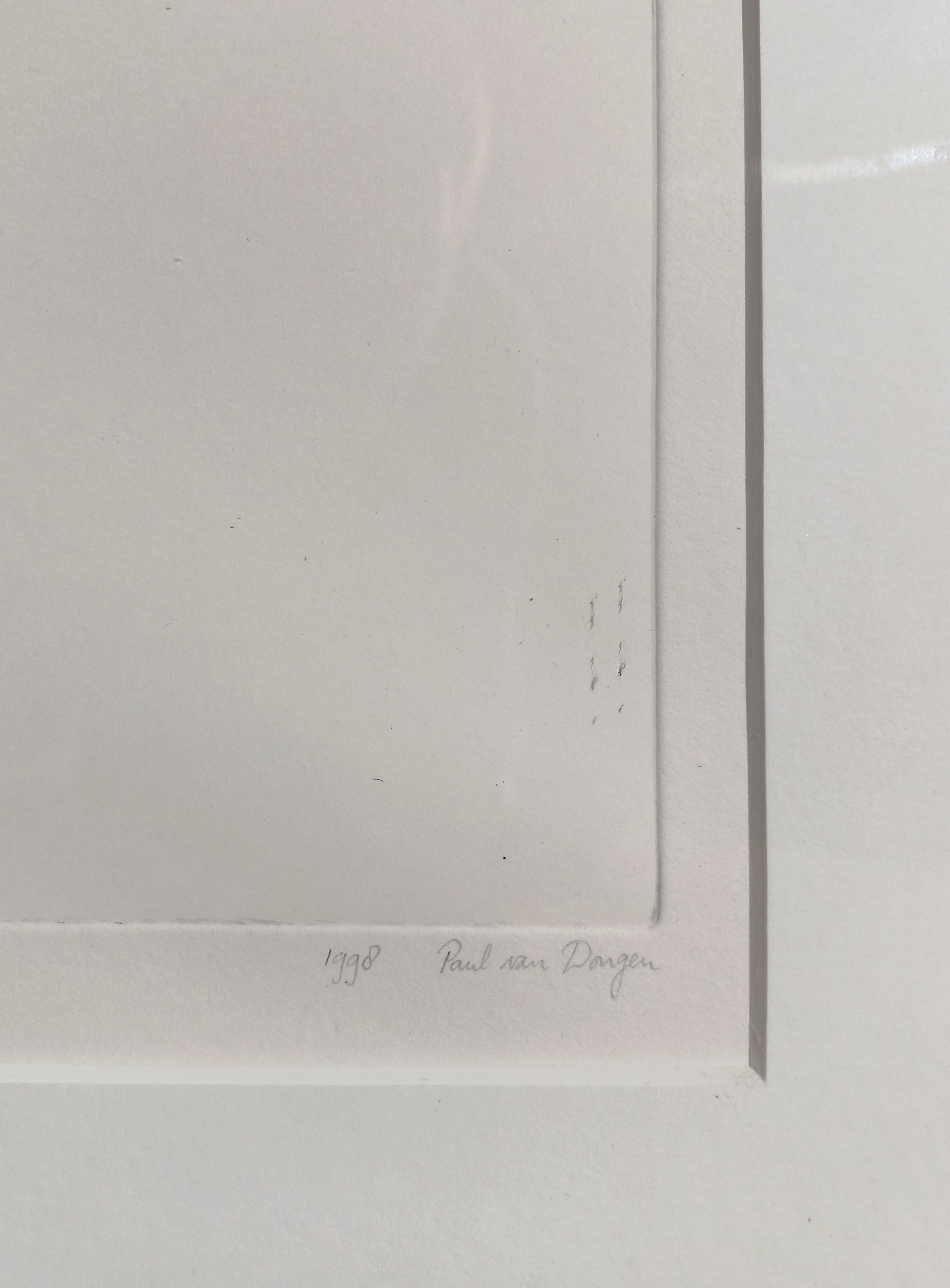 Zeer mooi, karakteristiek werk van Paul van Dongen. Ets op papier, met potlood gesigneerd, getiteld (zonder titel), gedateerd (1998) en genummerd (3/5). In strakke, houten lijst, achter glas en met smetteloos, zuurvrij passe-partout. Alles in zeer goede conditie.