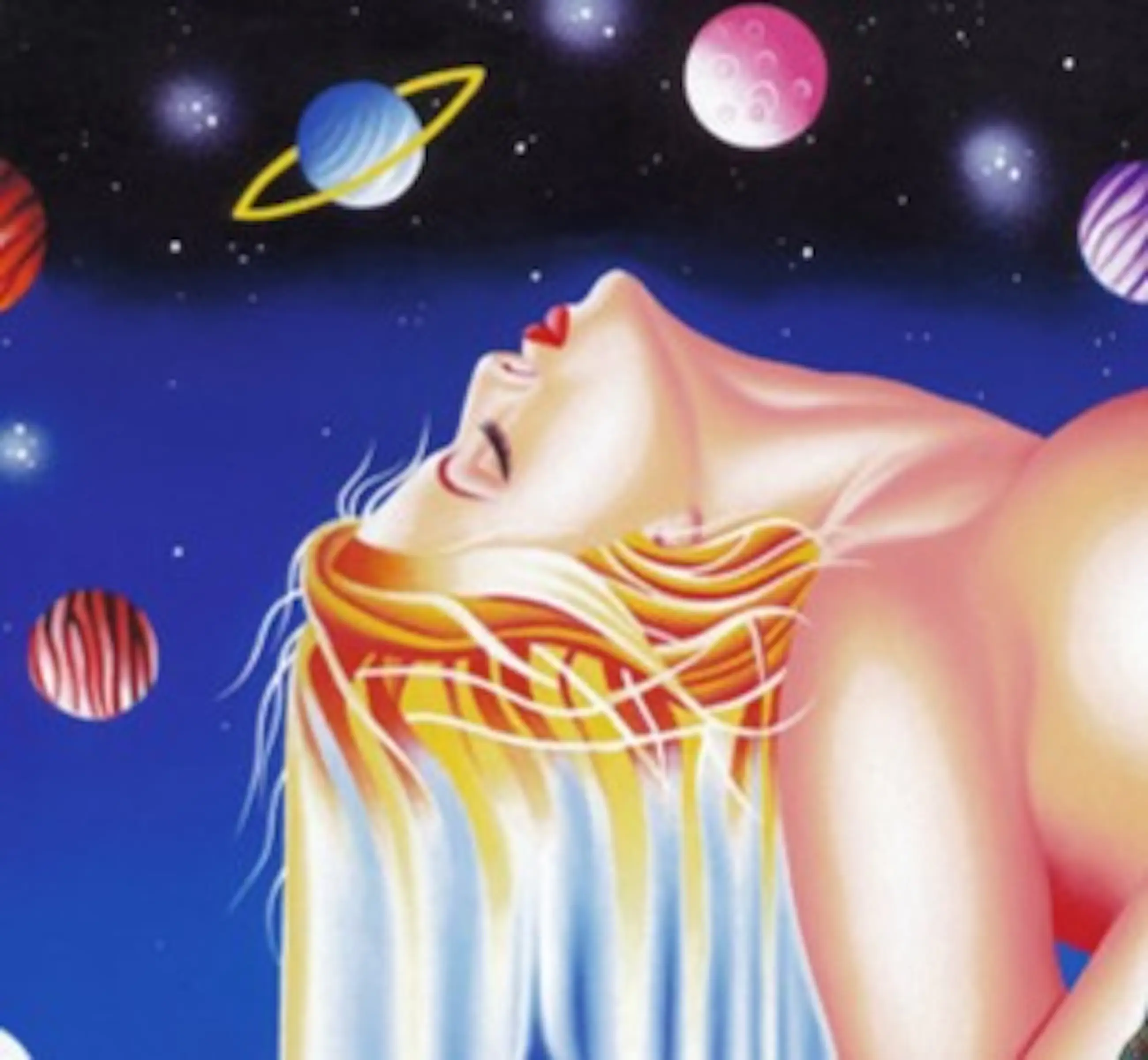 Vrouw in een surrealistisch landschap met planeten eromheen.