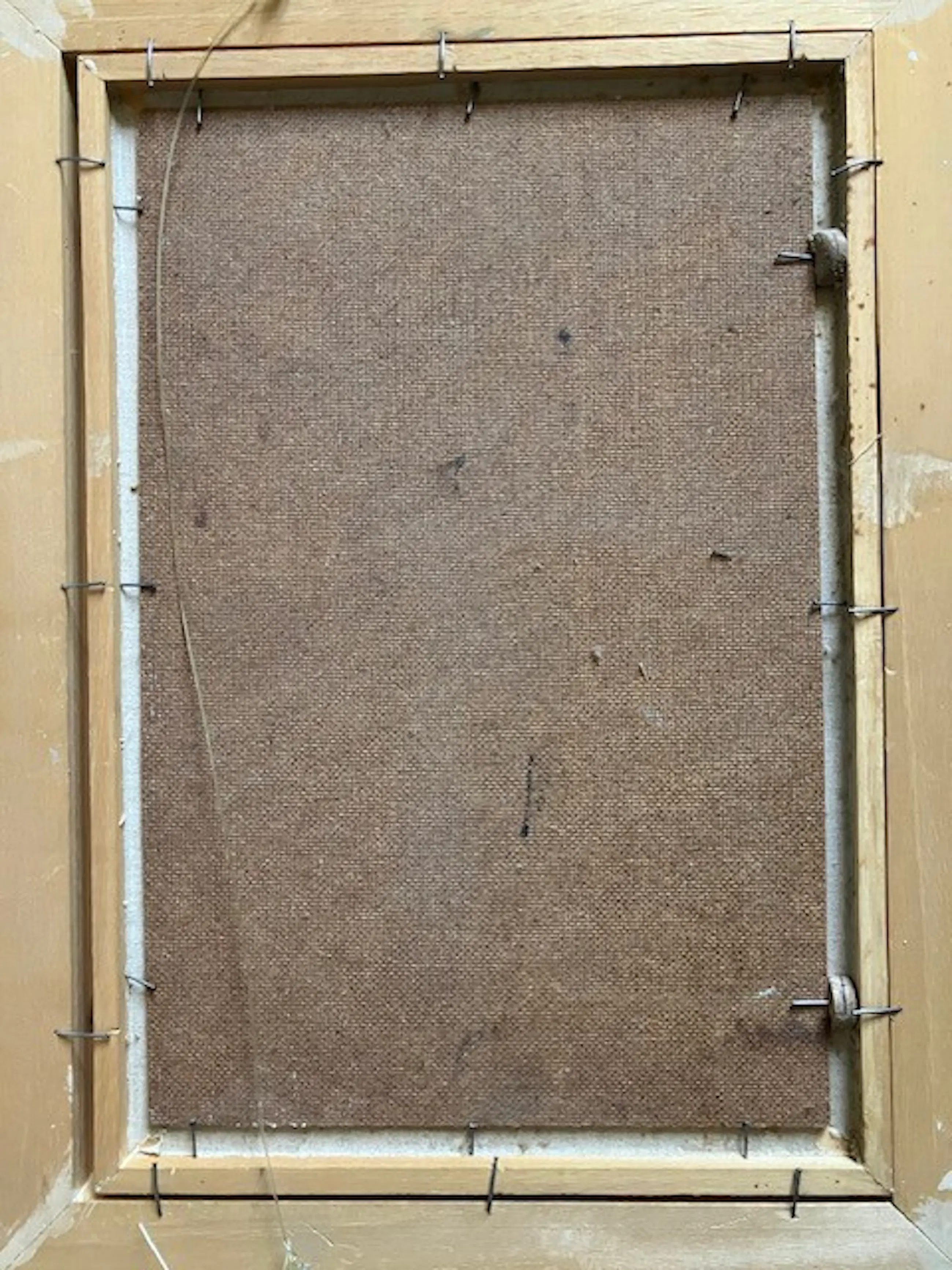het schilderij vertoon geen beschadigingen of verkleuringen, de lijst is heel dun geschilderd en vertoont wel kleine slijtplekjes, maar dit past goed bij de vlotte, gedempte stijl van het schilderij