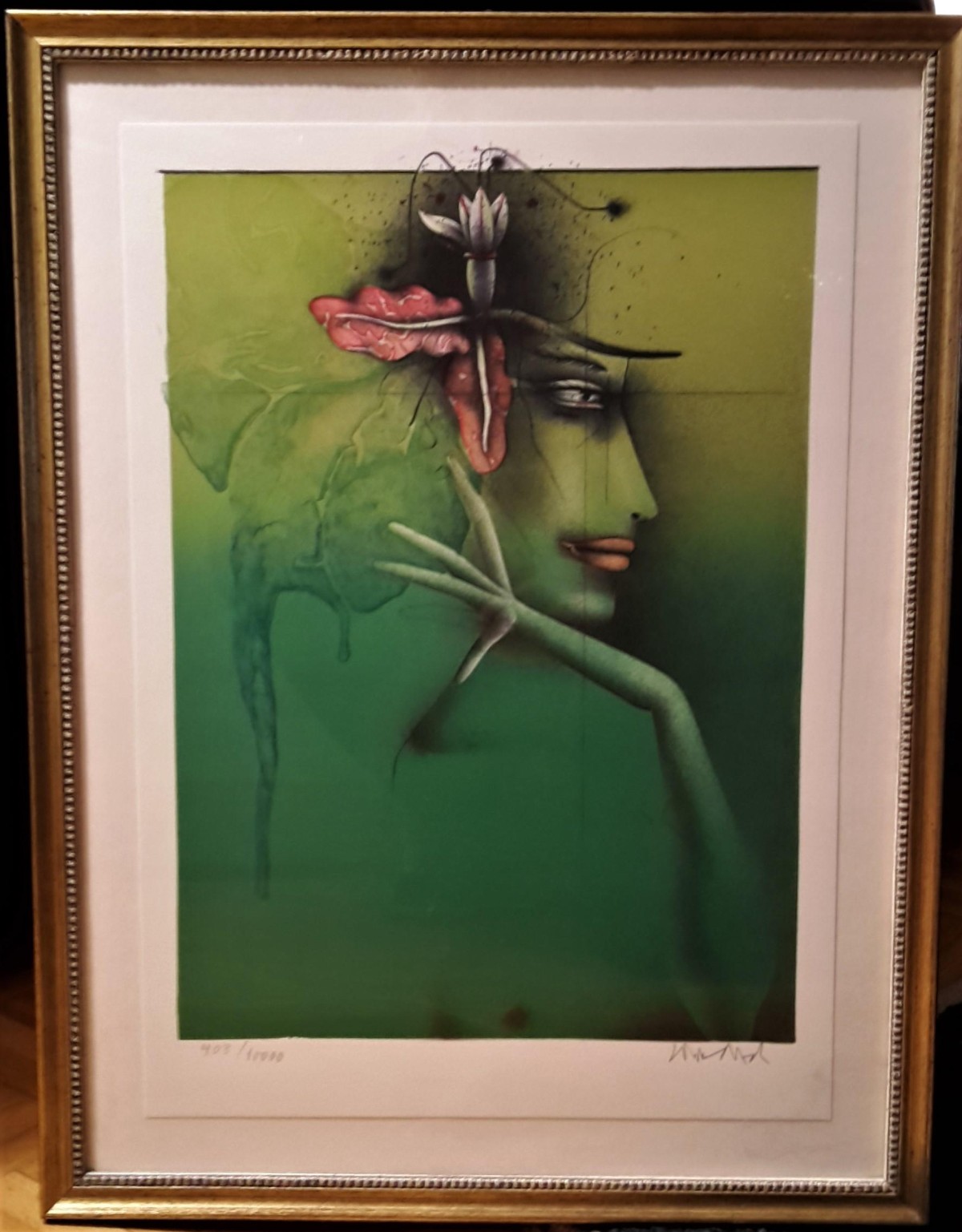 Handsignierte und nummerierte Farblithographie aus der Mappe "Die Kunst der Grafik", 1982, auf Arches-Bütten gedruckt.Die Gesamtauflage der Mappe betrug 10000 Stück, die vorliegnde Grafik wurde in 12 Farben und 4 Farbvarianten (hier grün) mit jeweils 2500 Stück gedruckt. Das Blatt hat die Nummer 403/10000, die Blattgröße ist42x30cm, die Motivgröße 36,5x26,5cm.Das Blatt ist in sehr gutem Zustand, kein Lichtrand etc. und wurde aufwendig in antik Optik hinter Glas gerahmt. Die Kosten für Verpackung und Versand betragen in Deutschland 8,50€. Bezahlung per Überweisung oder bar bei Abholung.