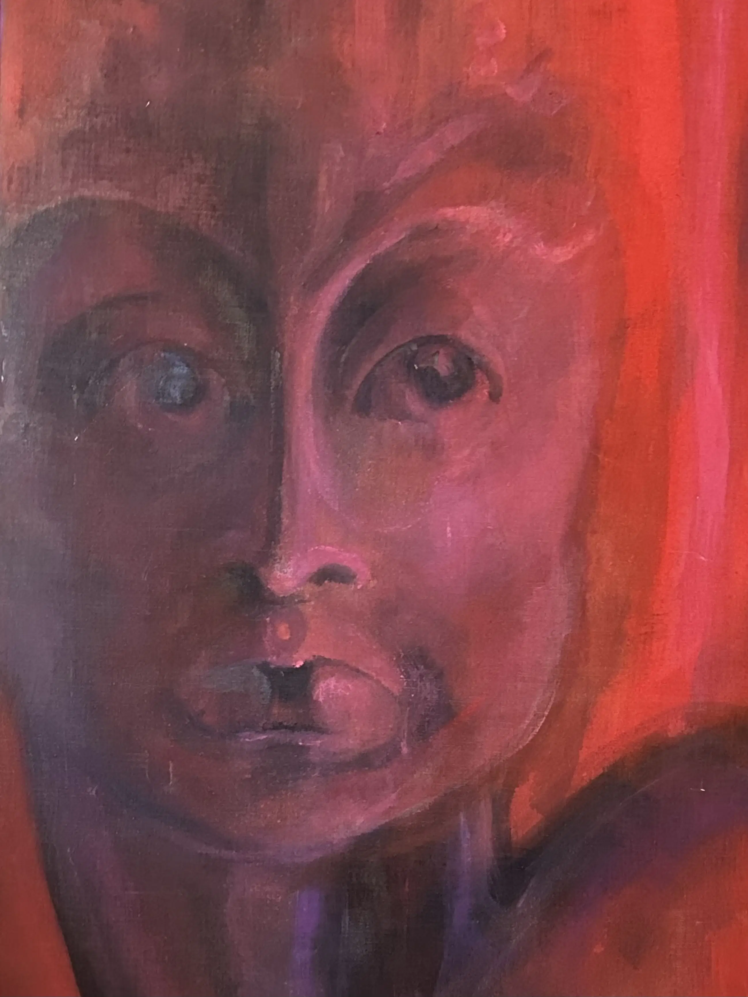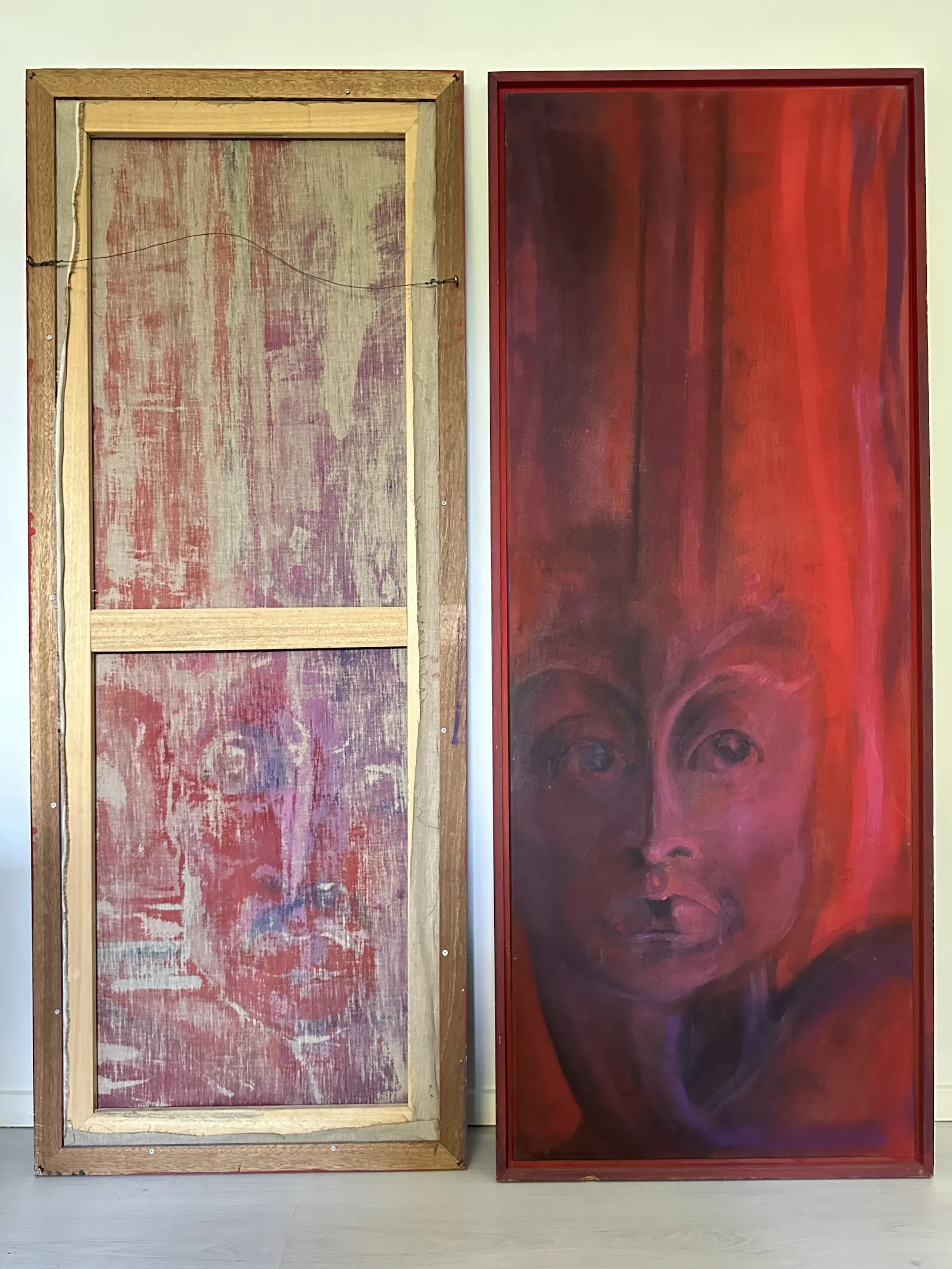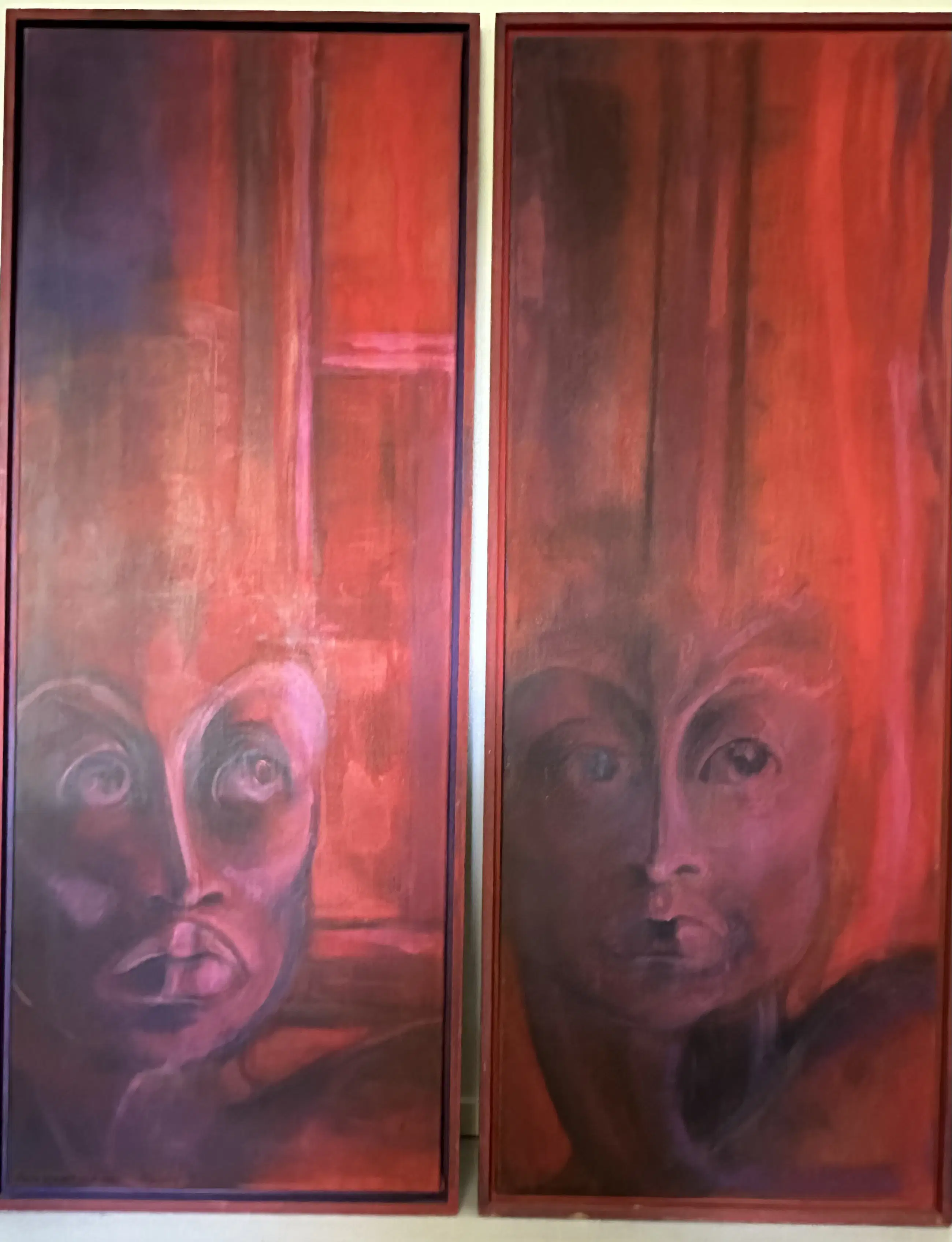 Intrigerend dubbel schilderij in mooie dieprode en paarse tinten. Per stuk al van flink formaat, als tweeluik wandvullend! (Circa 150x166cm)
