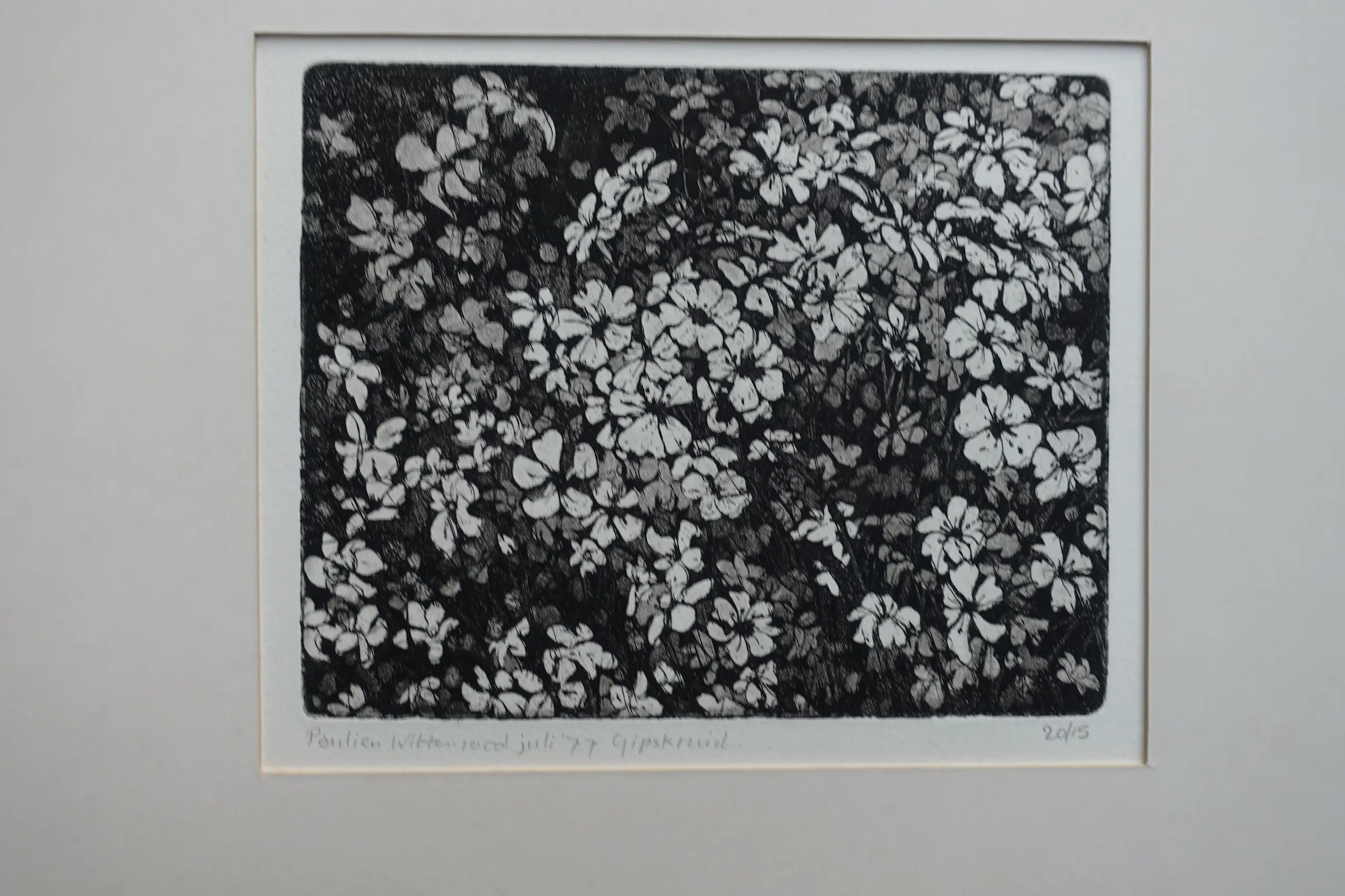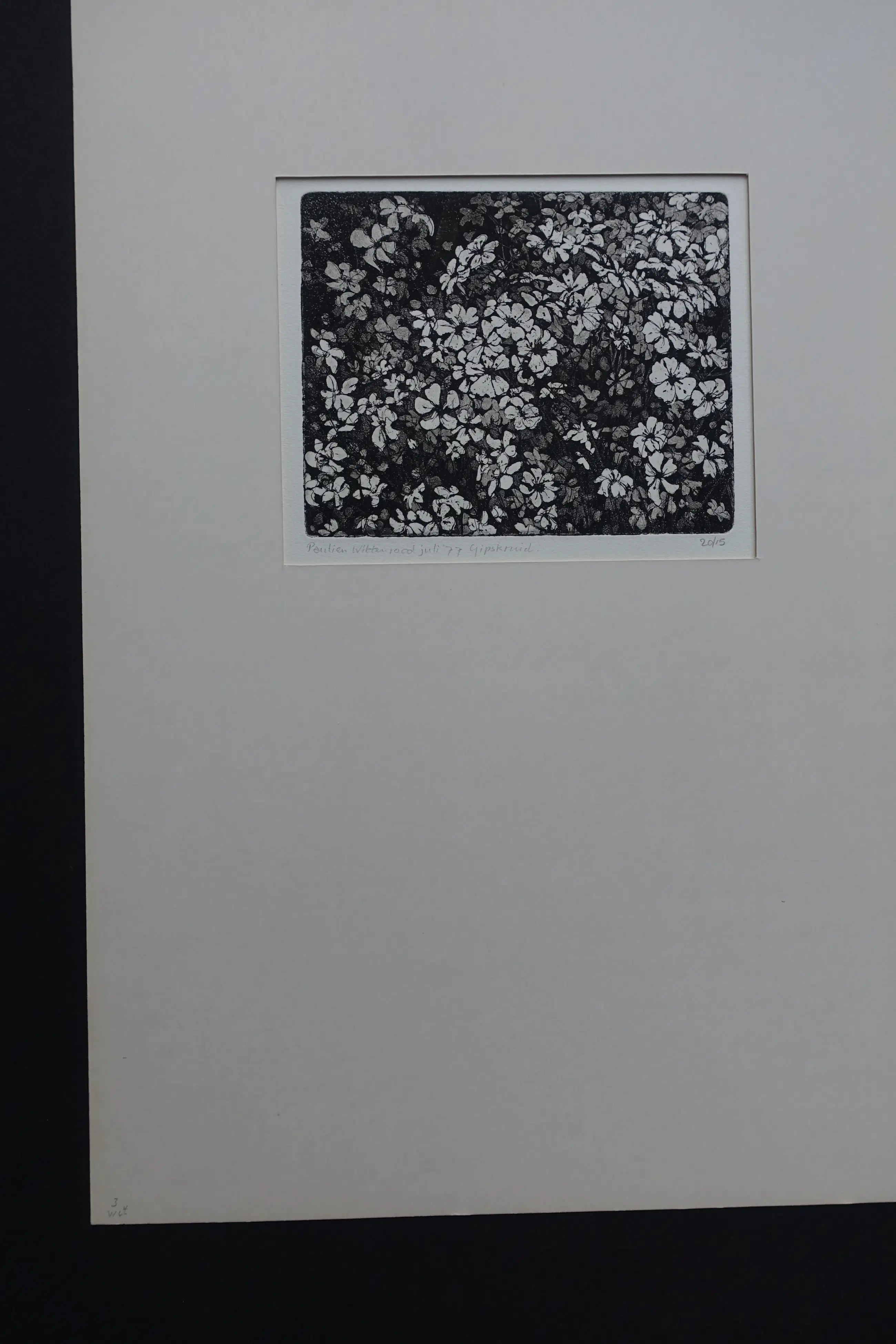 Deze grafische impressie van gipskruid dateert van juli 1977. Los opgenomen in passe-partout. Gesigneerd , gedateerd en betiteld met potlood. Zeer goede conditie.