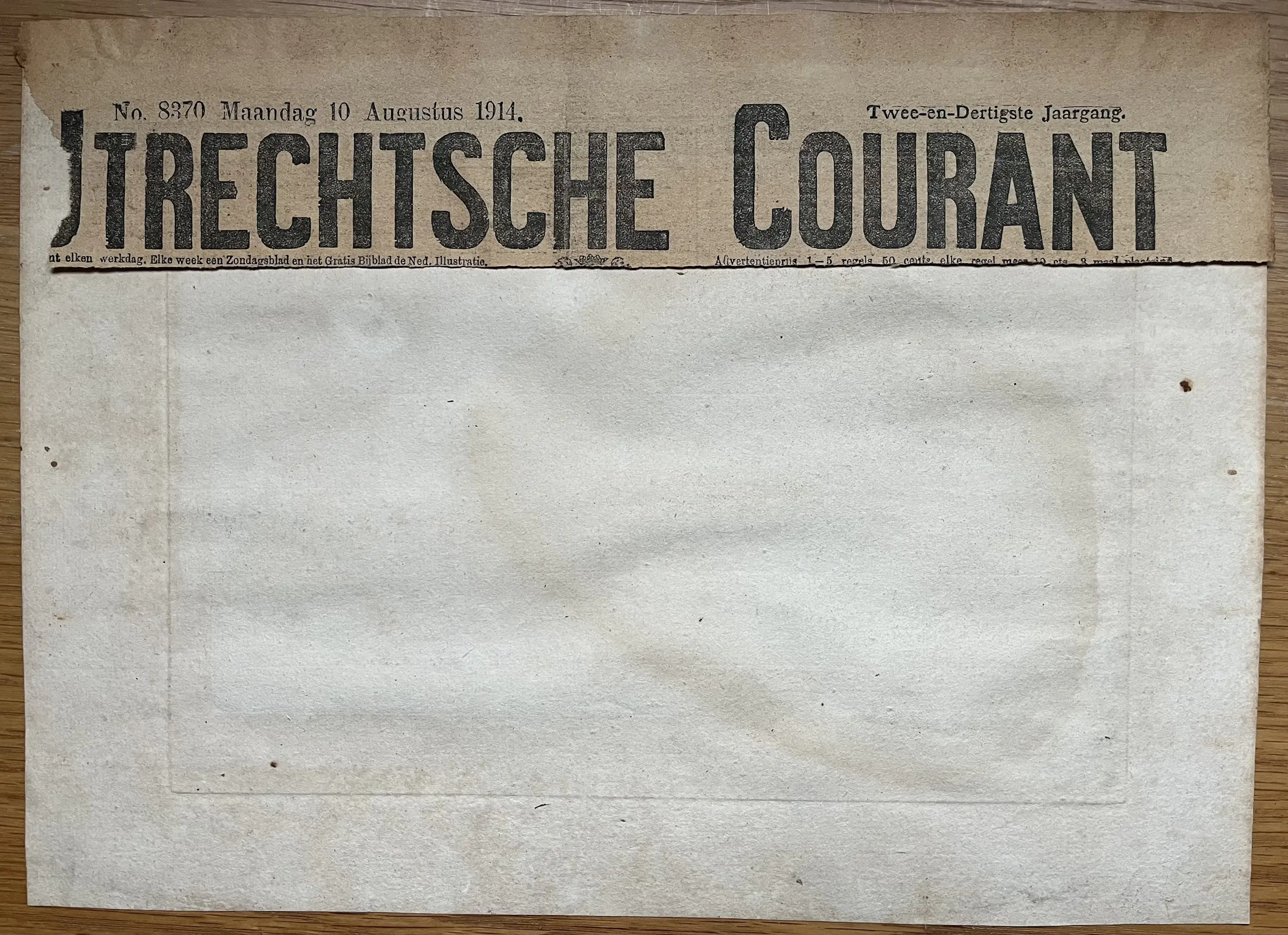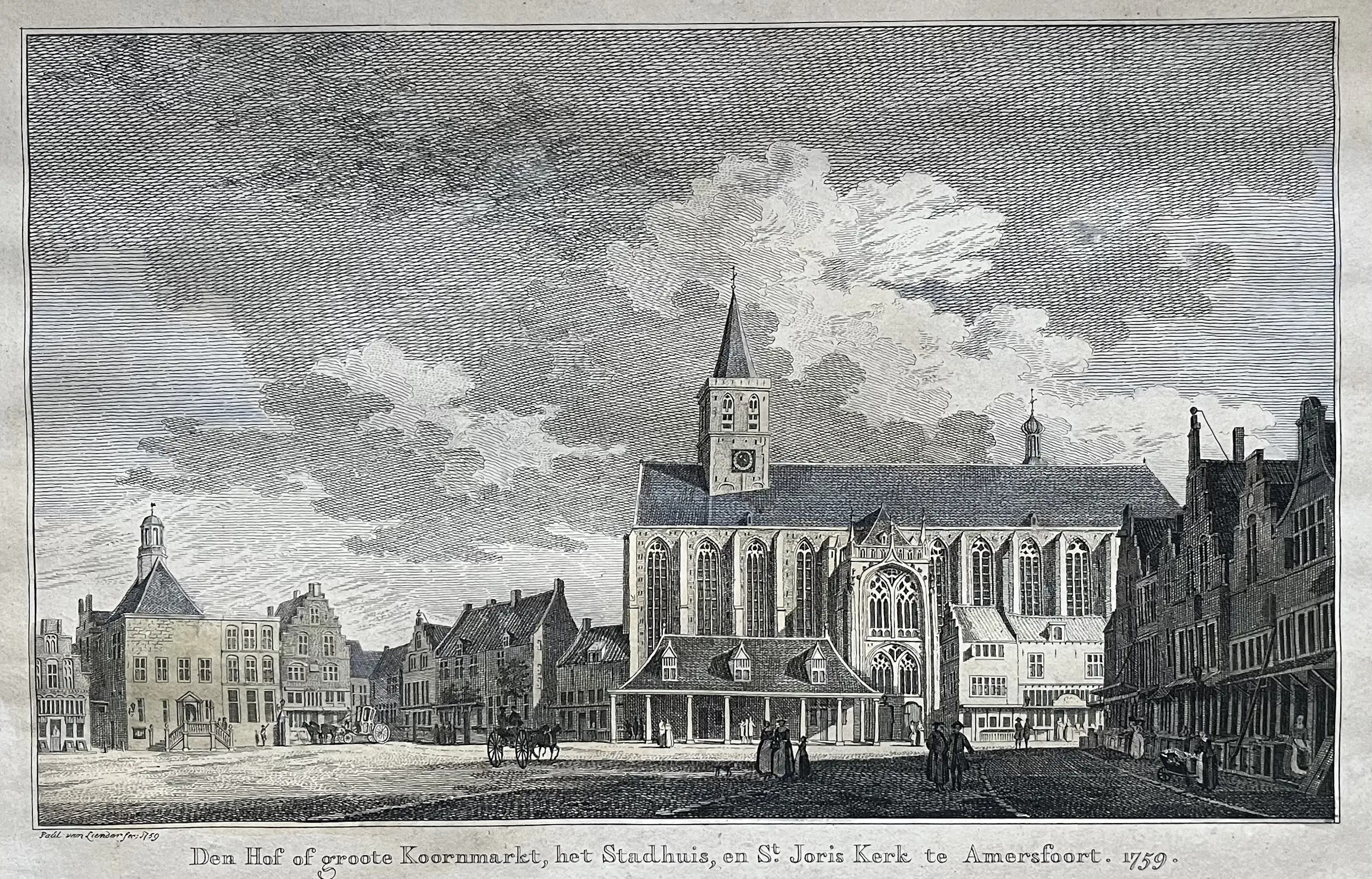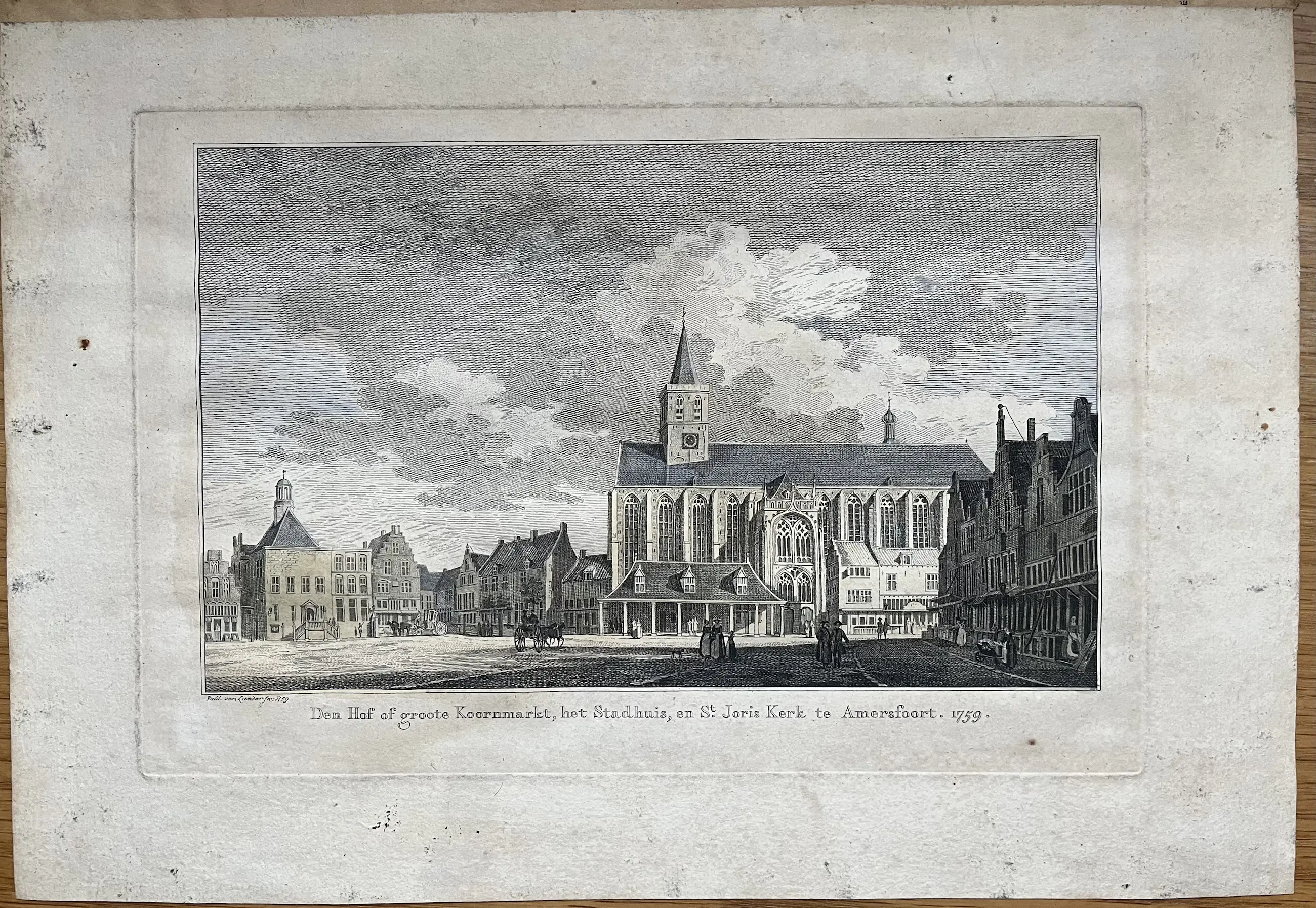 Oude ets van Paulus van Liender. Volledige titel: Den Hof of groote Koornmarkt, het Stadhuis, en St Joris Kerk te Amersfoort. 1759. Met aquarel opgehoogd. In redelijke staat. Komt uit oude lijst. Eerder ingelijst met krant uit 1914.