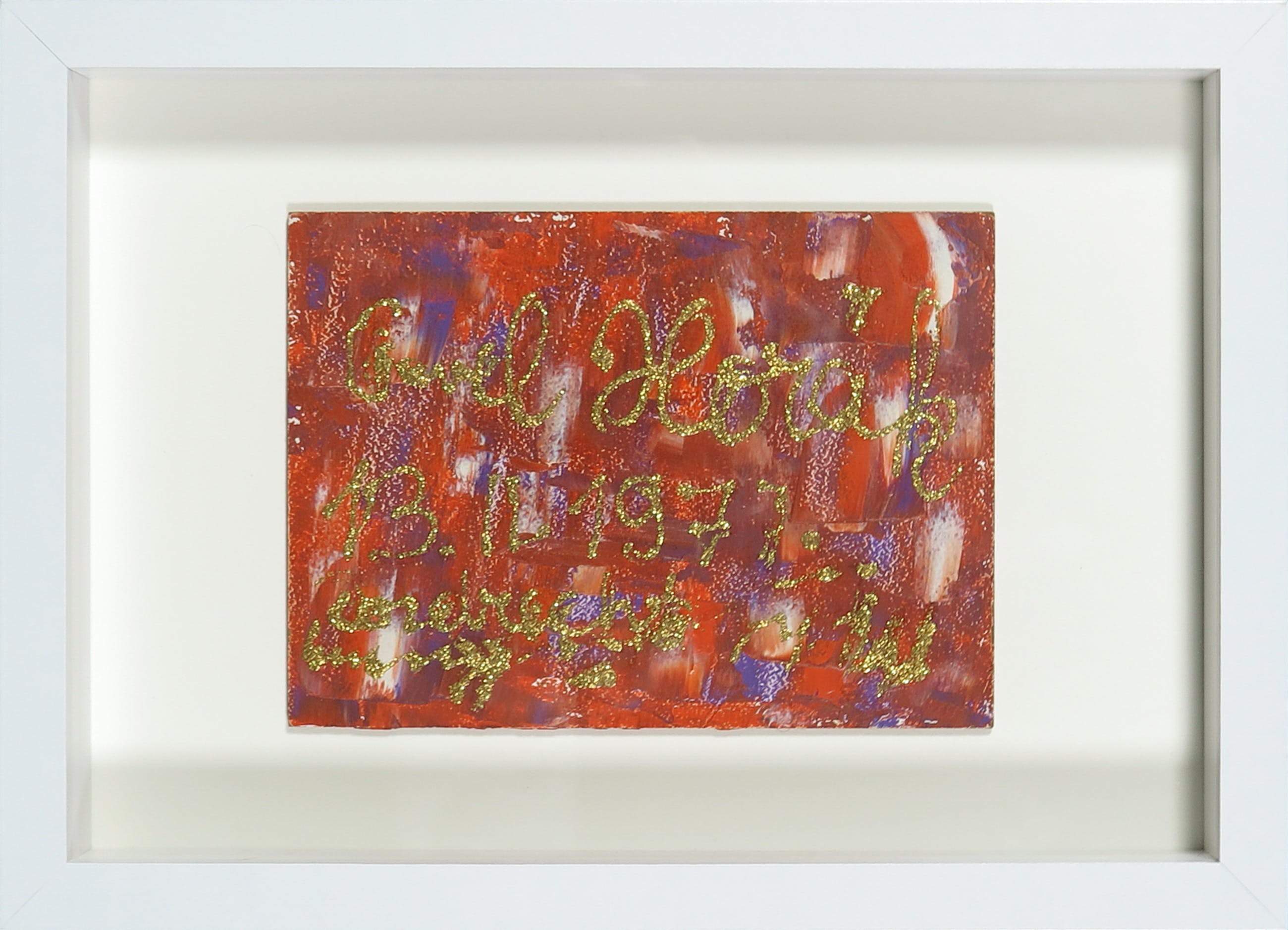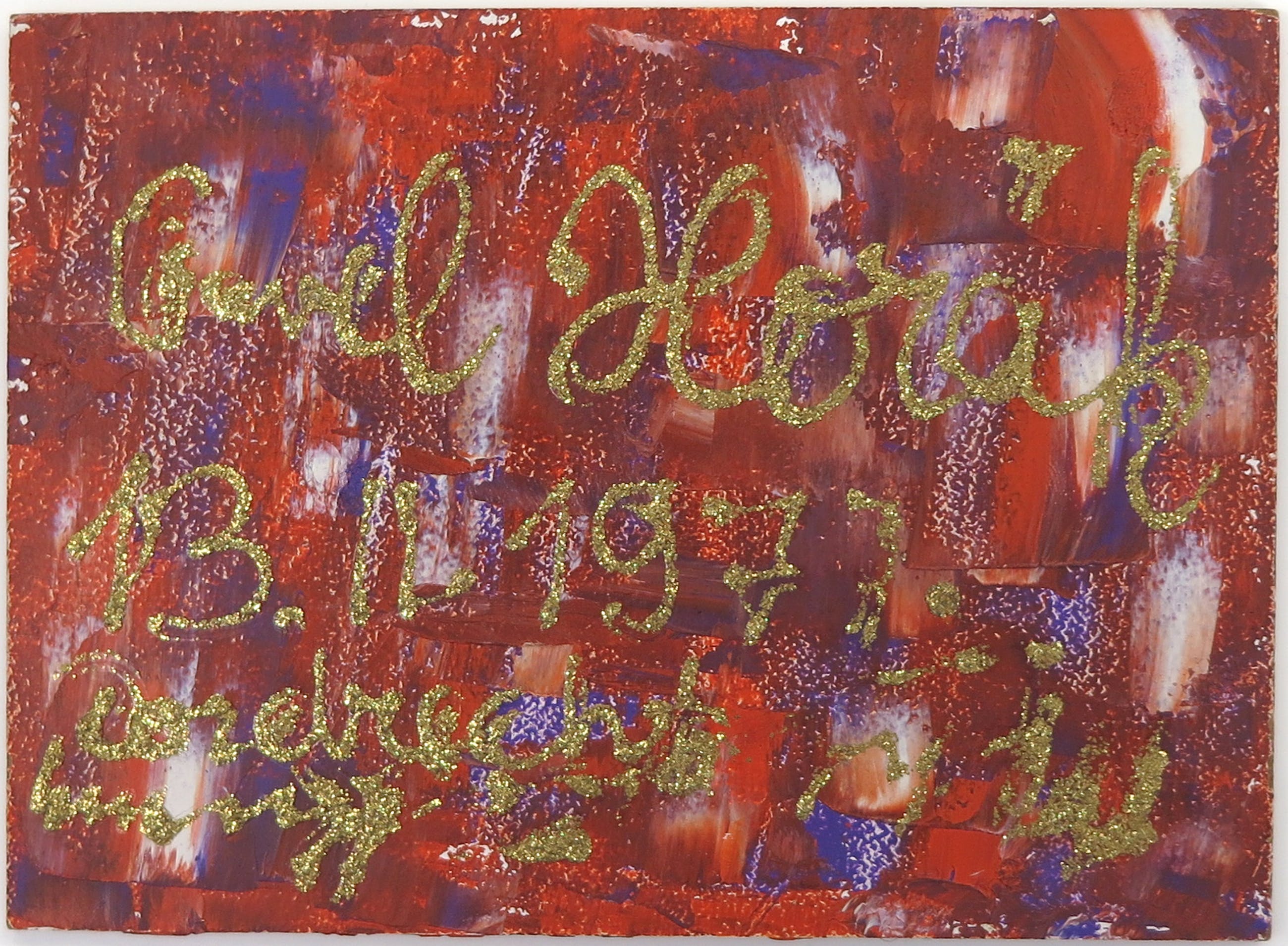 Bijzondere kerstgroet door Pavel Horak, uit 1977, uitgevoerd in olie- en glitterverf op paneel.