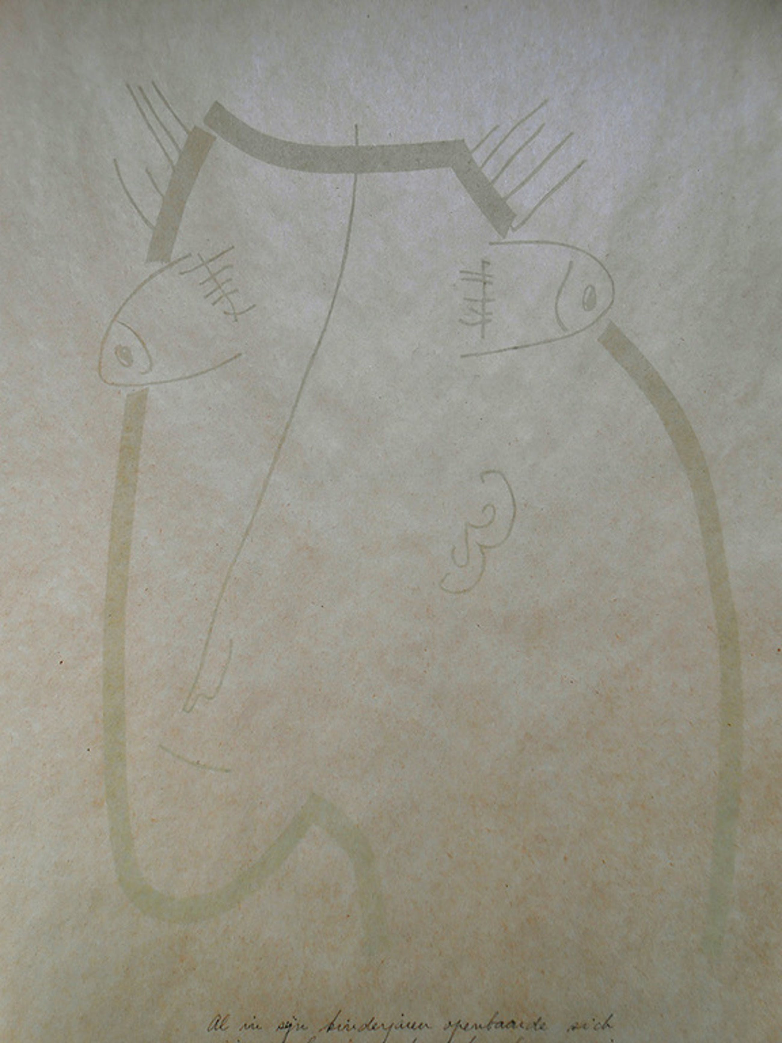 zeefdruk tekening lijkt vervaagd, papier is aan de onderkant gescheurd en gekreukt.