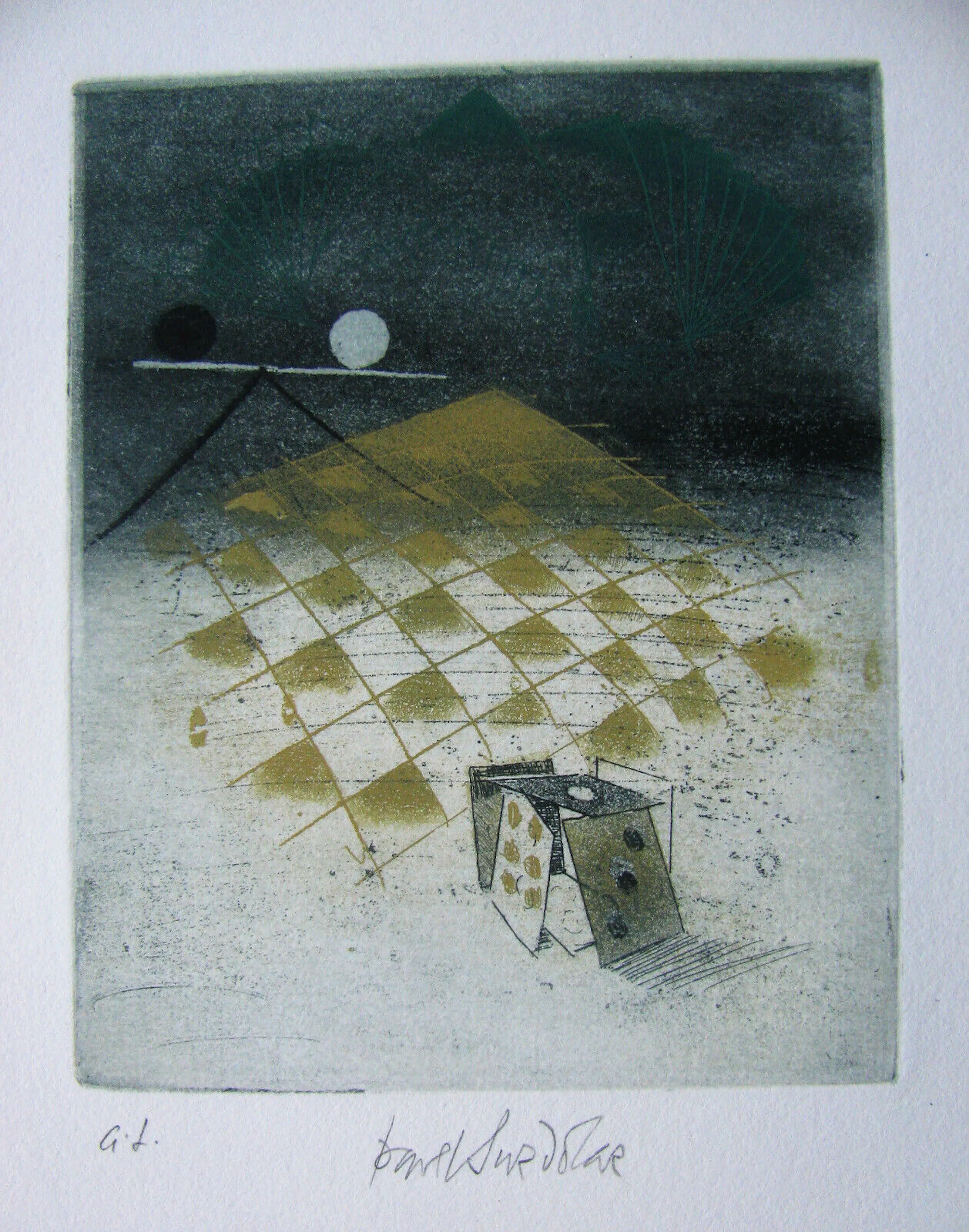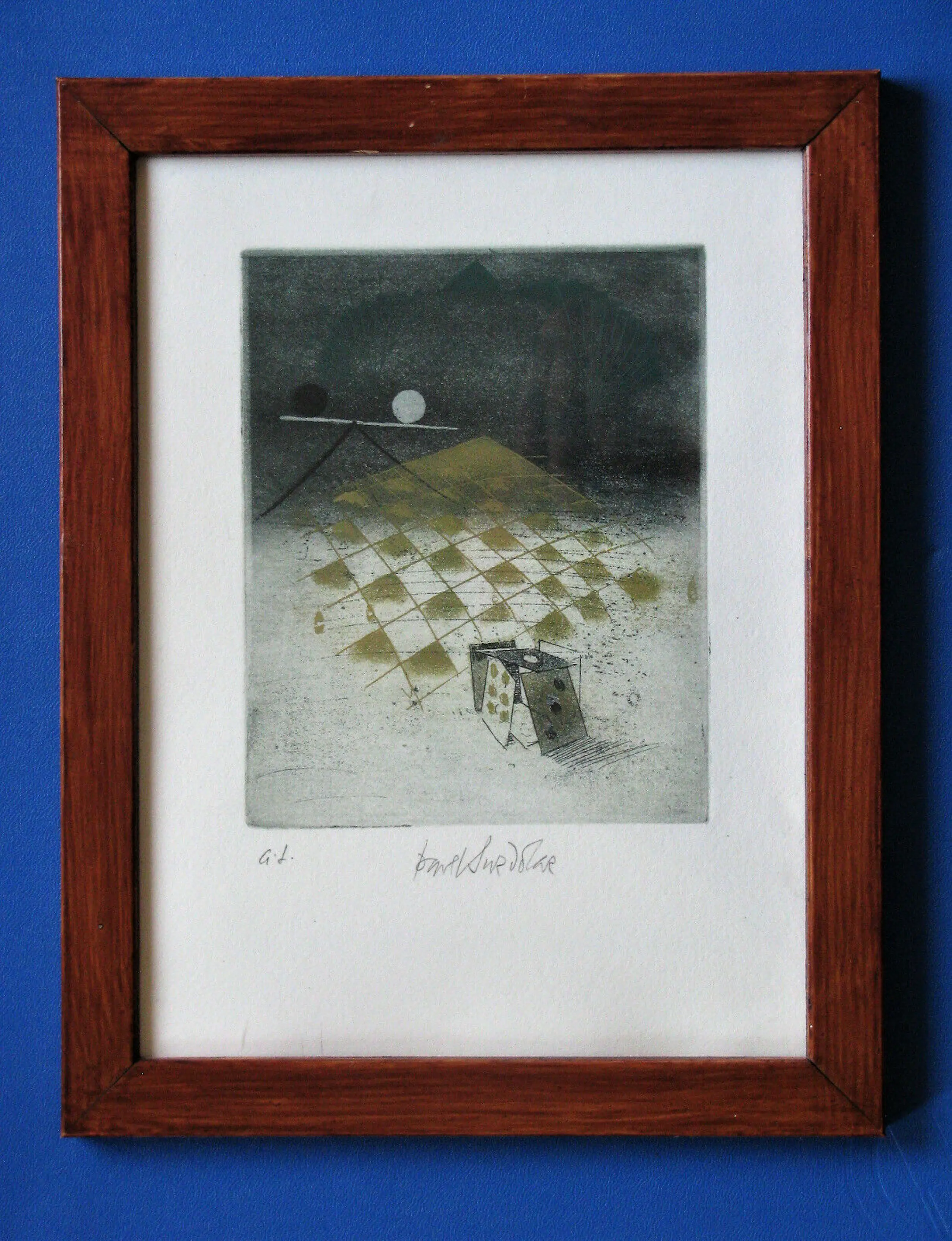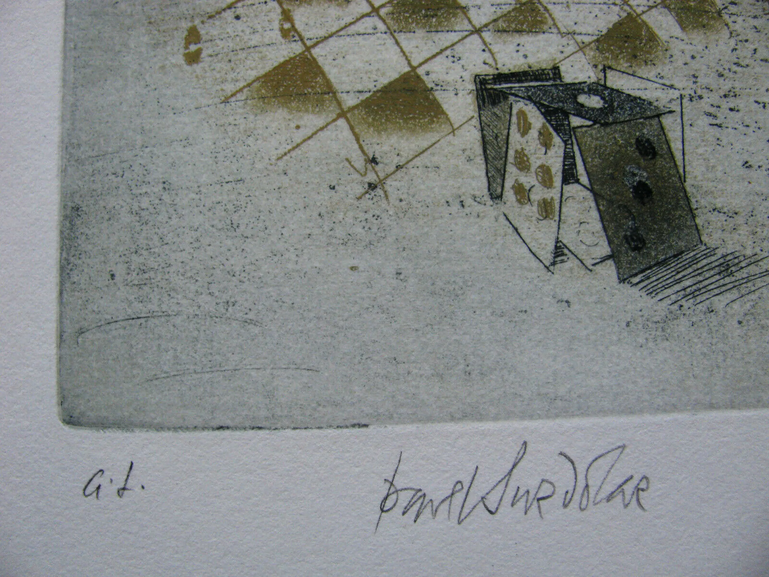 Kleurenets , 15 x 12 cm ( 24 x 18 cm het vel ) op geschept papier . Achter glas en houten lijst, 27 x 21 cm Gesigneerd met potlood. Zeer zeldzame , zeer kleine oplage . Beste staat.