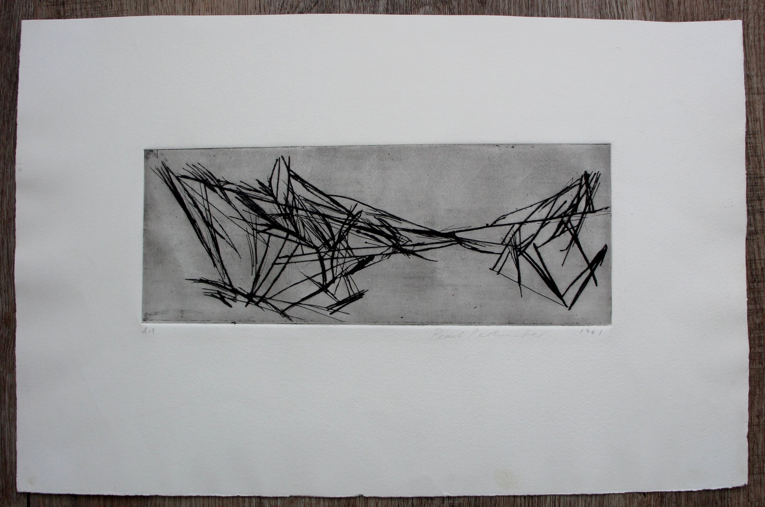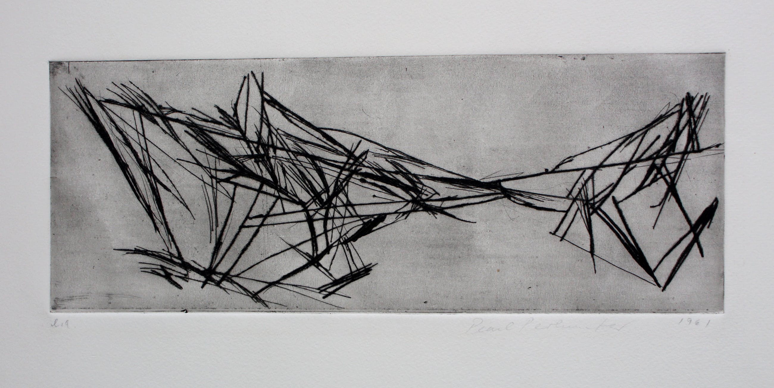 Abstracte ets van Pearl Perlmuter. Jaar: 1961. Nummer: E.A. Afmetingen voorstelling: H12,5 x b33 cm. Het werk is rechtsonder, met potlood, gesigneerd door de kunstenares. De authenticiteit van het aangeboden werk wordt volledig gegarandeerd. Een certificaat van echtheid kan, op aanvraag worden gemaild.