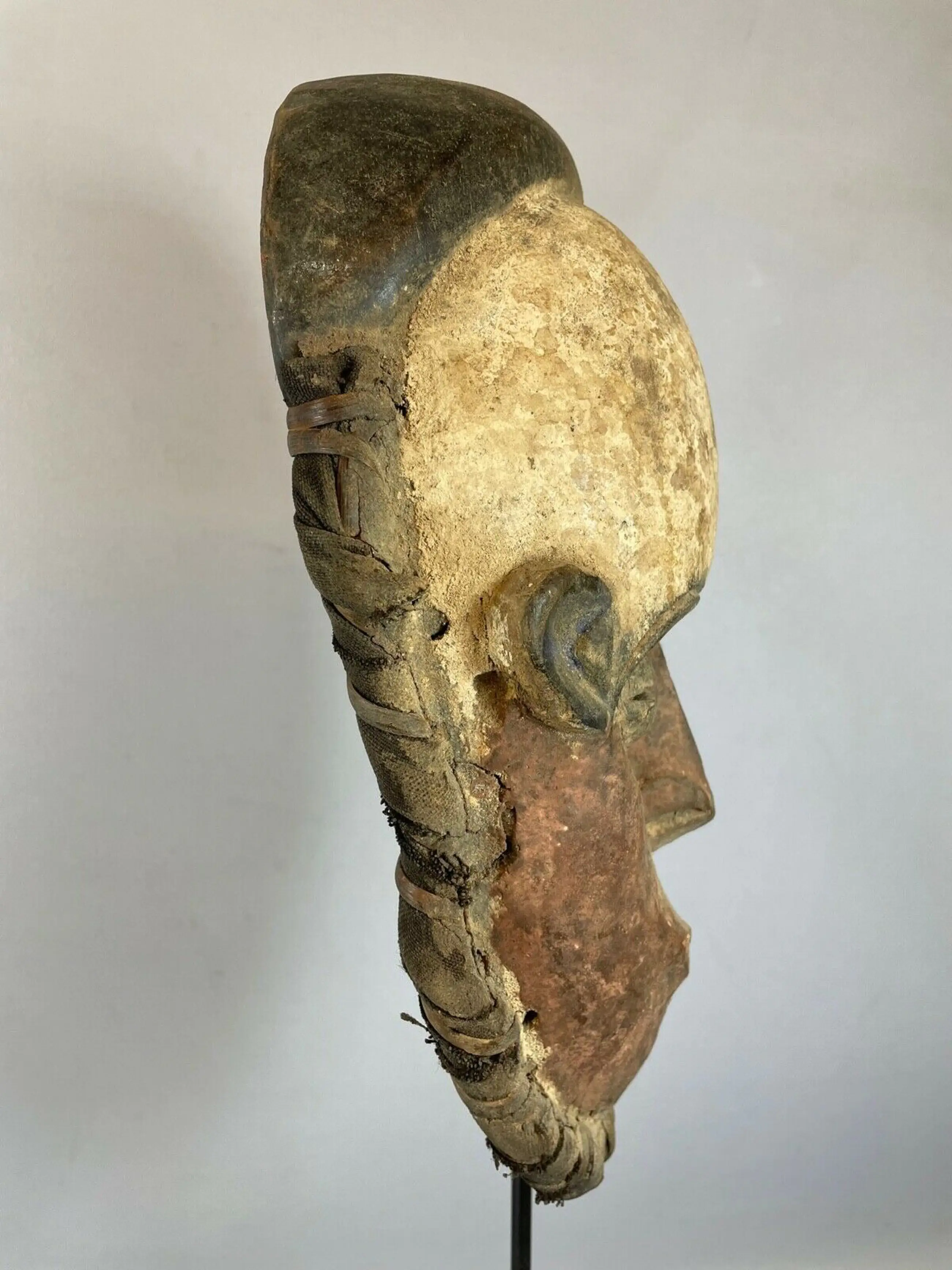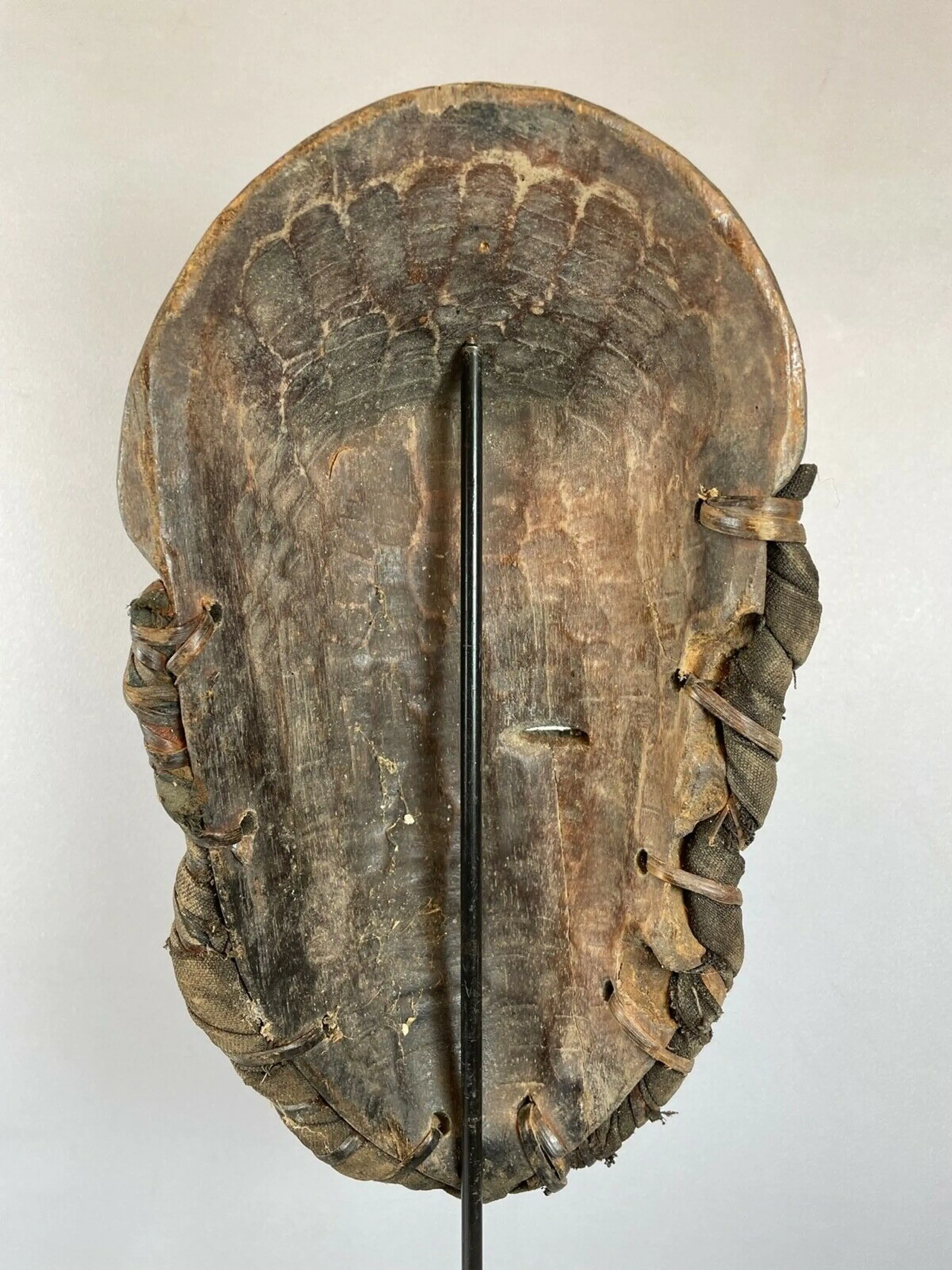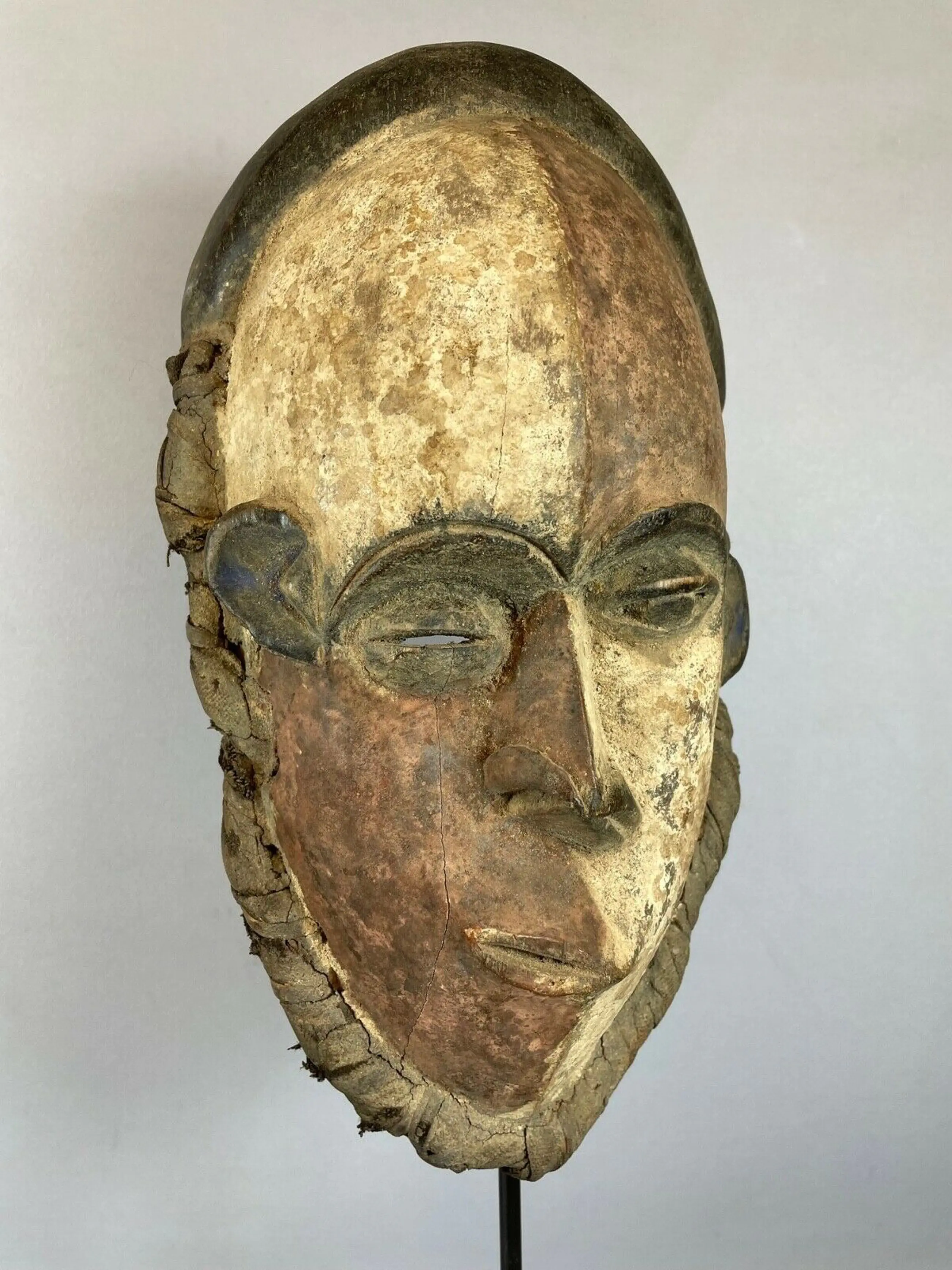 The 500,000 Pende people are mainly farmers who produce millet, maize, plantain, and peanuts. The women do the majority of the farm work and are wholly responsible for selling goods in the community markets. The men help with the clearing of the fields and also contribute to the diet with occasional hunting and fishing in the numerous local rivers. The sculptor’s profession is transmitted from father to son. Mbuya, or sculptured wooden masks in the form of human or animal faces, were worn with prescribed costumes by graduates of the Mukanda initiation school in their coming-out rites. These masks represented a great variety of village characters, including a clown, or “chief of the dance floor,” and those whose behavior was admired or disapproved. The present mask symbolizes a particularly skillful dancer. Although the performance was entertaining, it taught moral lessons and reinforced Pende religious and political principals.