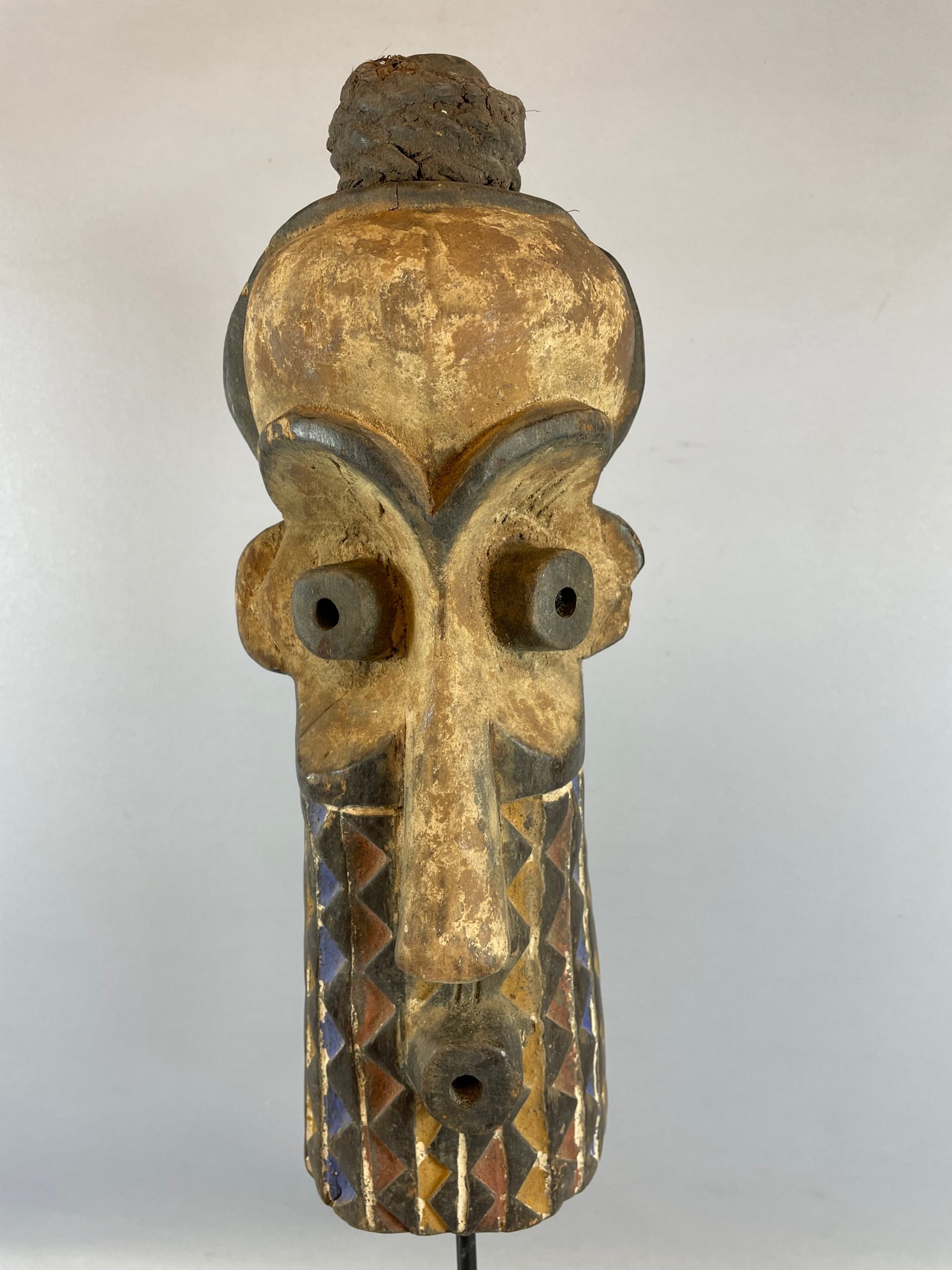 The 500,000 Pende people are mainly farmers who produce millet, maize, plantain, and peanuts. The women do the majority of the farm work and are wholly responsible for selling goods in the community markets. The men help with the clearing of the fields and also contribute to the diet with occasional hunting and fishing in the numerous local rivers. The sculptor’s profession is transmitted from father to son. Mbuya, or sculptured wooden masks in the form of human or animal faces, were worn with prescribed costumes by graduates of the Mukanda initiation school in their coming-out rites. These masks represented a great variety of village characters, including a clown, or “chief of the dance floor,” and those whose behavior was admired or disapproved. The present mask symbolizes a particularly skillful dancer. Although the performance was entertaining, it taught moral lessons and reinforced Pende religious and political principals.