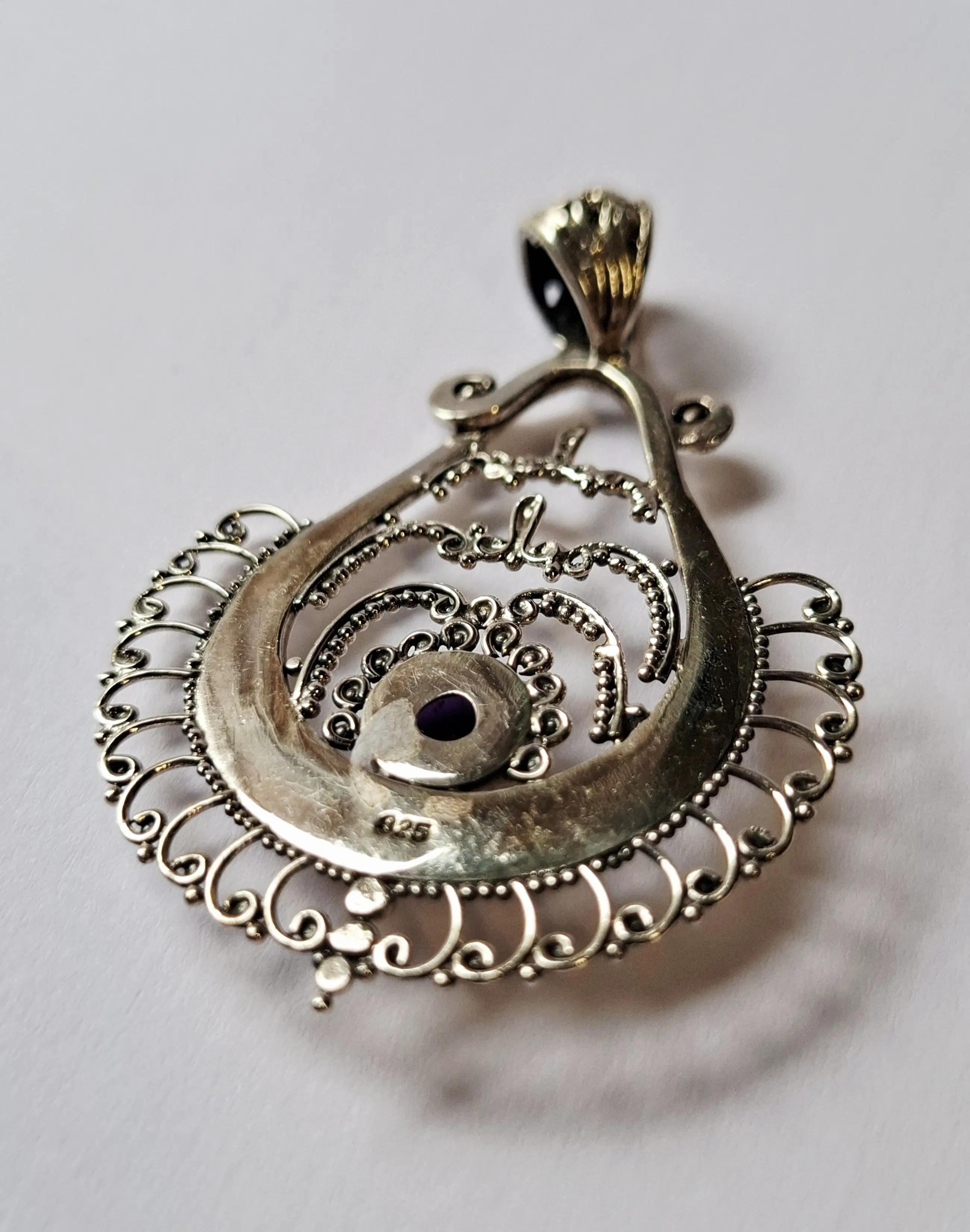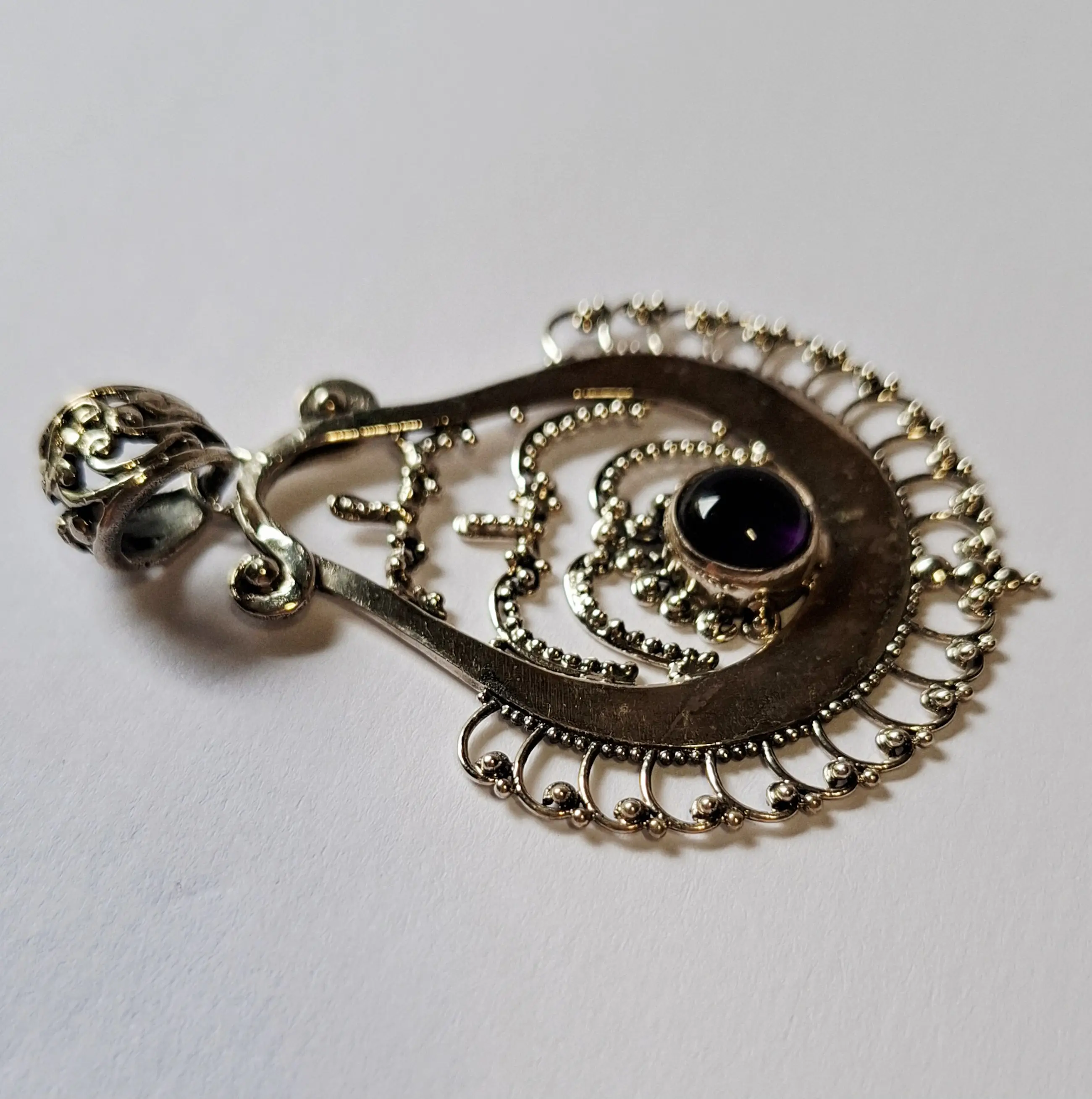Rijkelijk uitgesneden zilveren hanger ook Rijkelijk uitgesneden oog .een prachtige design hanger zeer zeldzaam circa 1970 .Amethist, een paarse edelsteen, staat bekend om zijn kalmerende, beschermende en spirituele werking. Het helpt bij het verminderen van stress, angst en slapeloosheid, en bevordert helderheid, concentratie en positieve gedachten.