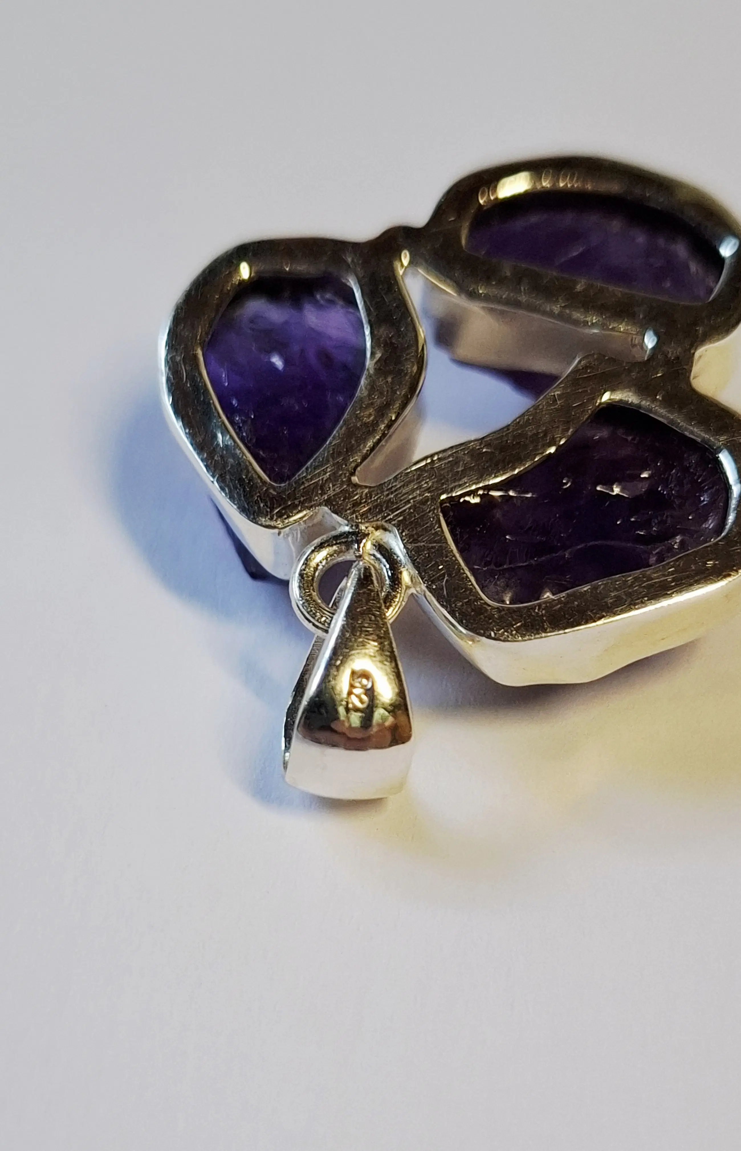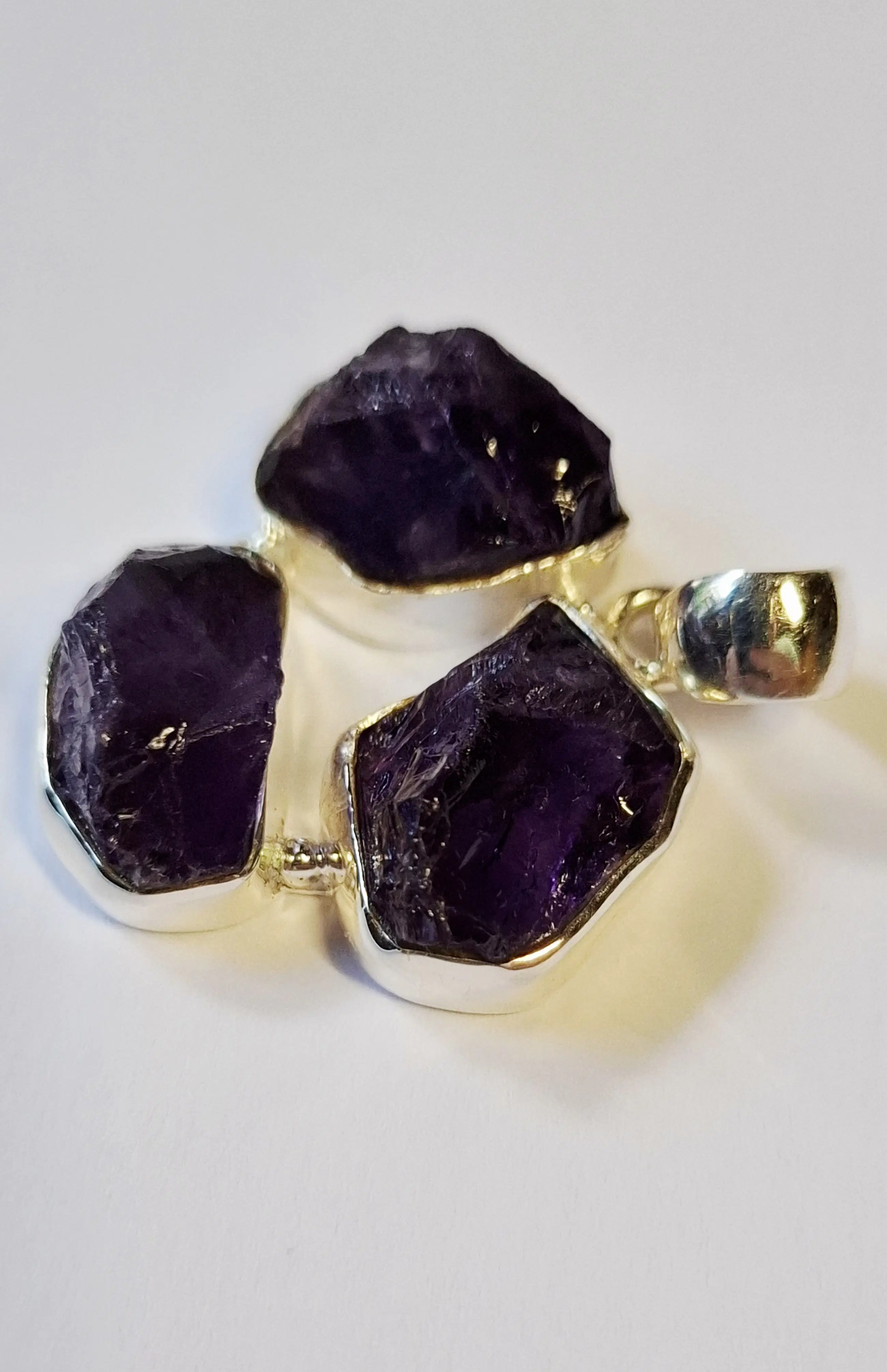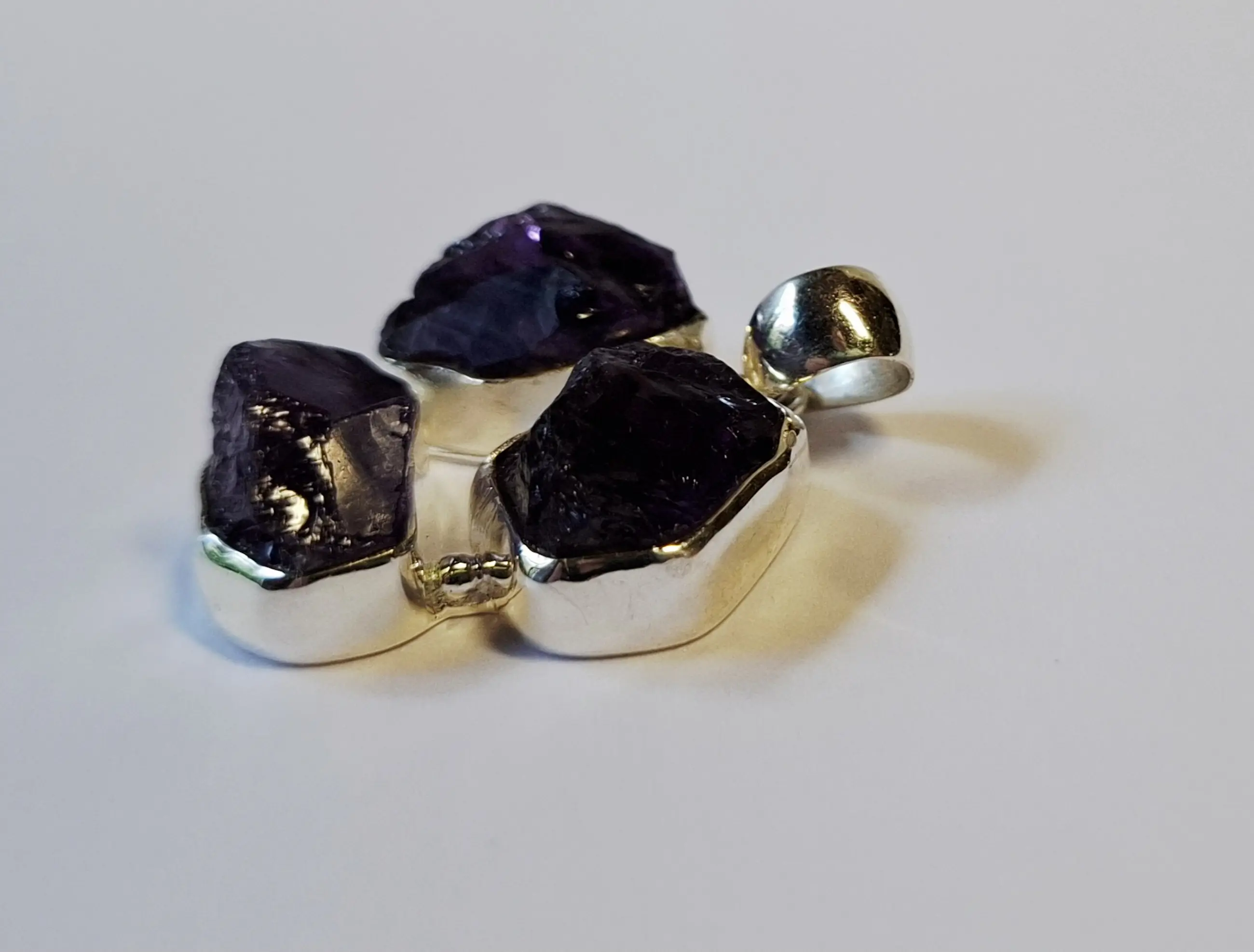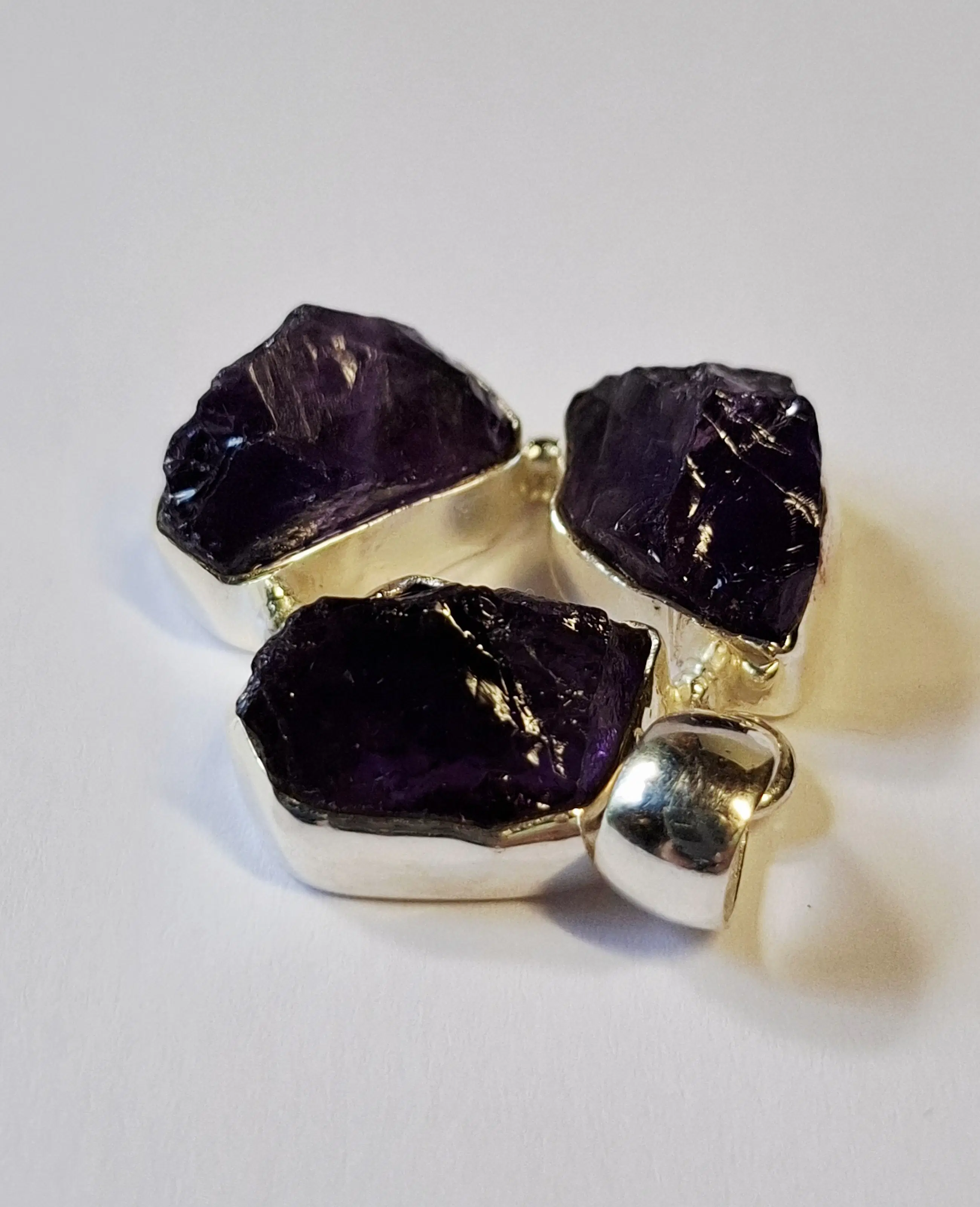 Zilveren hanger met zeldzame donker ruwe Amethist Breng de kracht en schoonheid van de natuur dichtbij met deze elegante zilveren hanger met een ruwe Amethist steen. Elk stuk is uniek, met een onbewerkte Amethist die zorgvuldig met de hand is geselecteerd en gezet in een minimalistische 925 sterling zilveren houder. Circa 1990 . Komt uit een prive Collectie Heeft altijd in een vitrine kastje gelegen eigenlijk is het nog nieuw voor een sieraad uit 1990 . Word goed verpakt en verzekerd verzonden met track en trace .