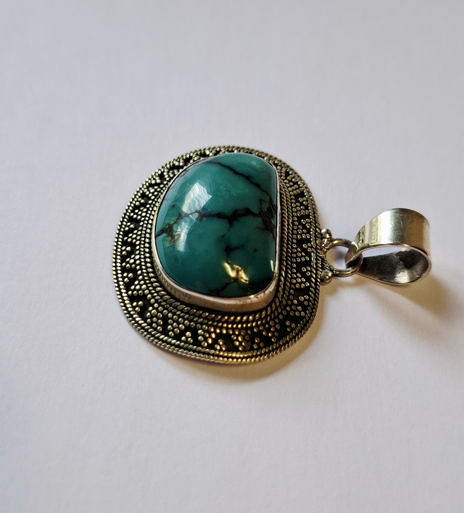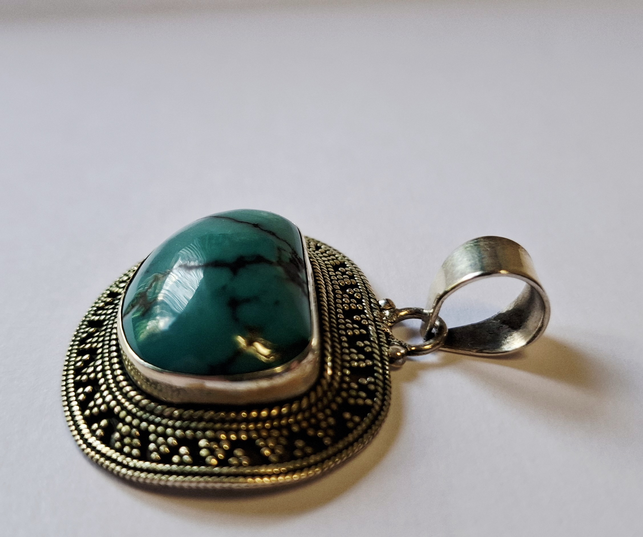 Mooie sierlijke zilveren hanger, met de hand gemaakt door de Native American zilversmeden van de Navajo 1950. De hanger is gezet met een prachtige turquoise, welke in het echt veel meer naar turquoisekleur neigt dan ik het op de foto krijg. Turkoois wordt geassocieerd met de lucht en het brengen van hemelenergie naar de aarde. Het staat bekend als een steen voor meesterlijke genezing, omdat men gelooft dat het genezingsproces erdoor wordt versneld. Turkoois kan ook eerlijke en heldere communicatie vanuit het hart bevorderen.