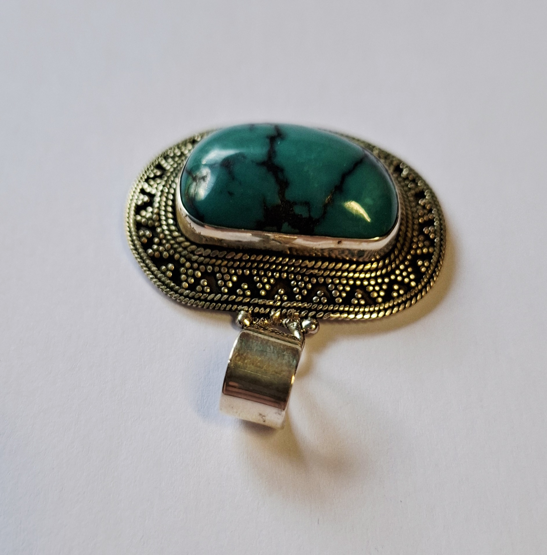 Turkoois komt voor in alle tinten blauw, van blauwgroen tot blauwgroen, en het zijn de natuurlijke variaties in turkoois die de steen aantrekkelijk maken. De kleur van turkoois in Indiaanse sieraden varieert van bruingroen tot helderblauw. Turkoois wordt gevonden in aders tussen lagen moedergesteente en kan in de matrix of adering iets van de invloed van het moedergesteente laten zien. De kleuren van de matrix variëren van blauw tot goudbruin tot zwart en soms met gouden spikkels. Veel mensen geven de voorkeur aan turkoois met matrix boven heldere stenen. Komt uit een prive Collectie Ennis nog nooit gedragen .meer dan 75 jaar oud . Eigelijk is het nog nieuw voor meer dan 75 jaar oude Navajo hanger.
