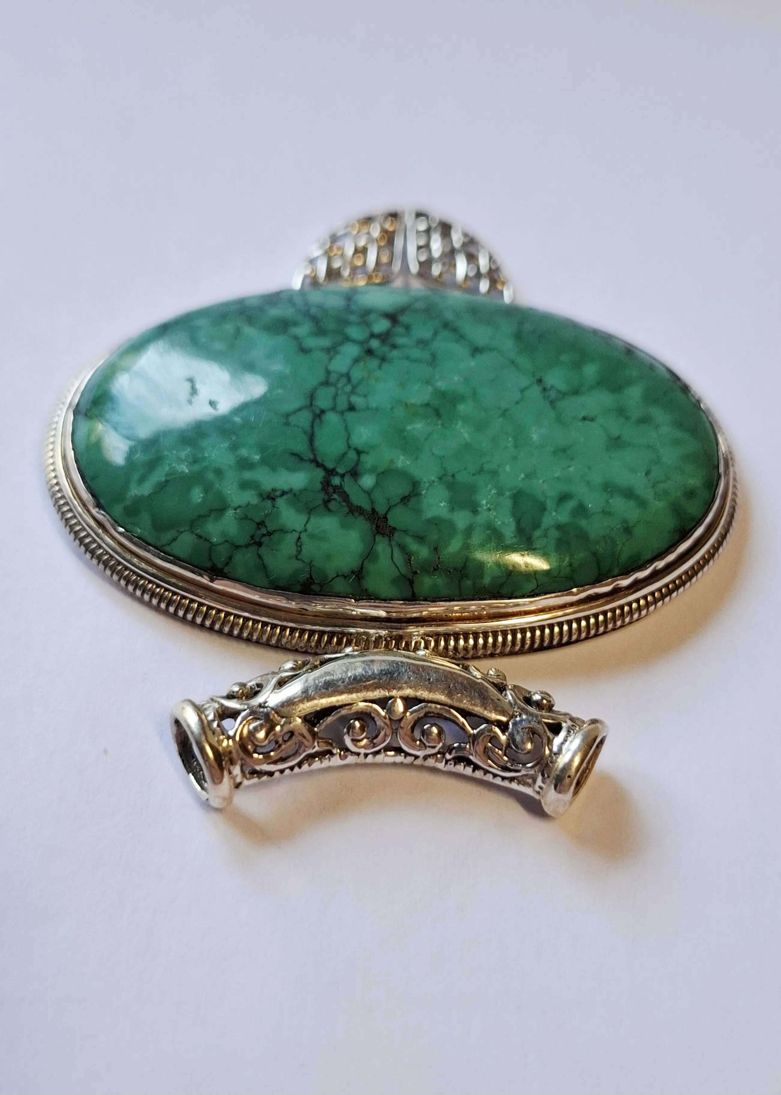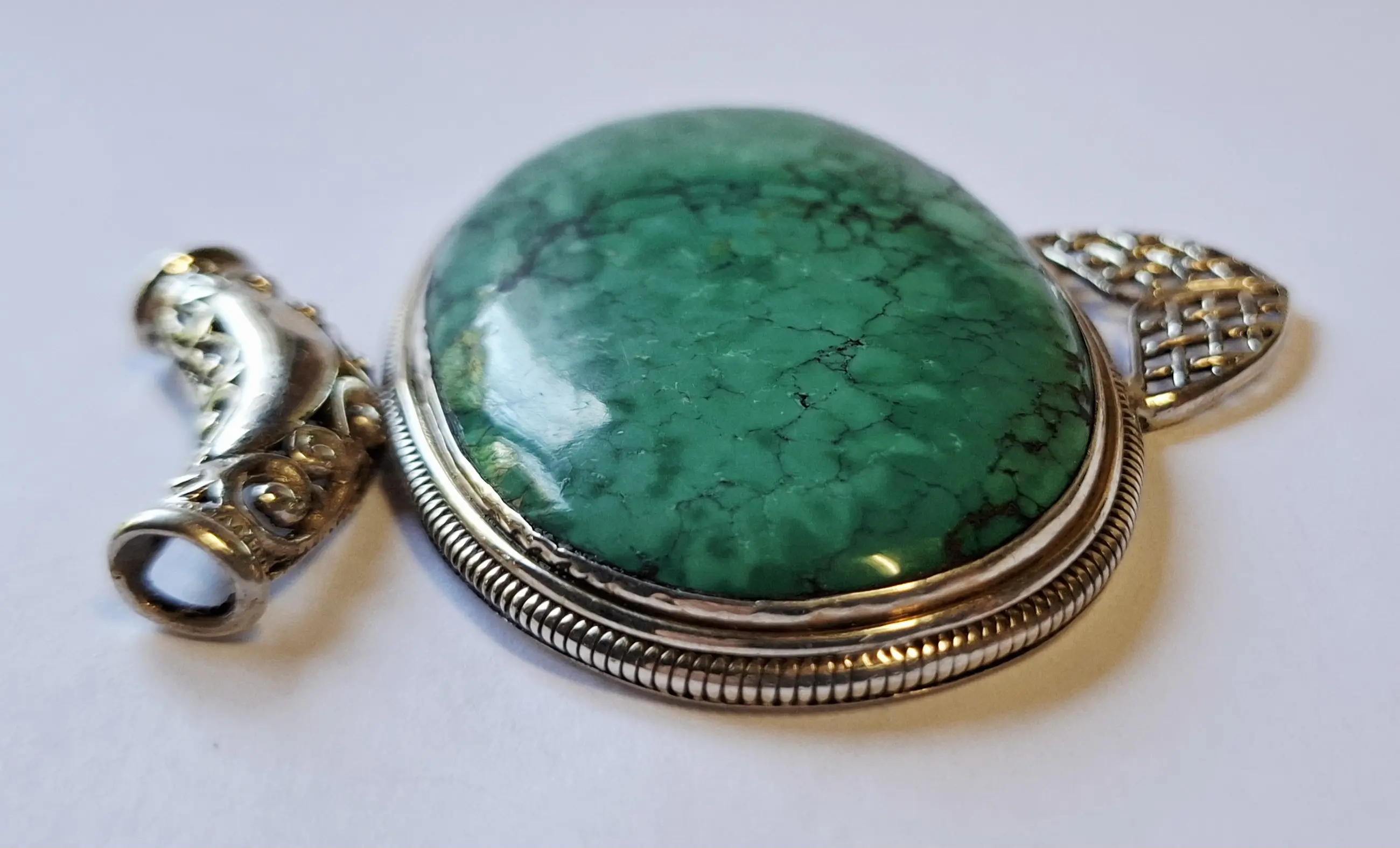 Turkoois komt voor in alle tinten blauw, van blauwgroen tot blauwgroen, en het zijn de natuurlijke variaties in turkoois die de steen aantrekkelijk maken. De kleur van turkoois in Indiaanse sieraden varieert van bruingroen tot helderblauw. Turkoois wordt gevonden in aders tussen lagen moedergesteente en kan in de matrix of adering iets van de invloed van het moedergesteente laten zien. De kleuren van de matrix variëren van blauw tot goudbruin tot zwart en soms met gouden spikkels. Veel mensen geven de voorkeur aan turkoois met matrix boven heldere stenen. Komt uit een prive Collectie Ennis nog nooit gedragen .meer dan 75 jaar oud . Eigelijk is het nog nieuw voor meer dan 75 jaar oude Navajo hanger.