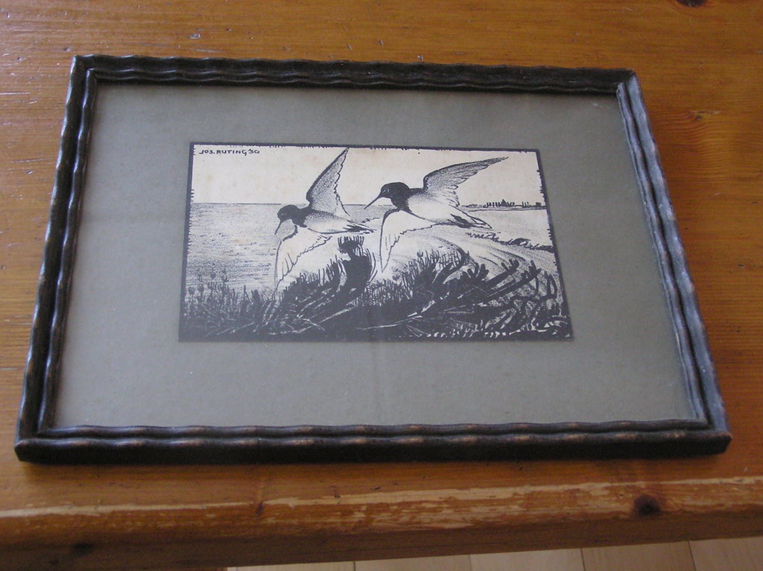 Pentekening van twee vogels die opstijgen vanuit een rietkraag, links bovenin gesigneerd en gedateerd Jos Ruting '30. In originele houten lijst. In prima conditie, heeft een aantal lichte watervlekjes.