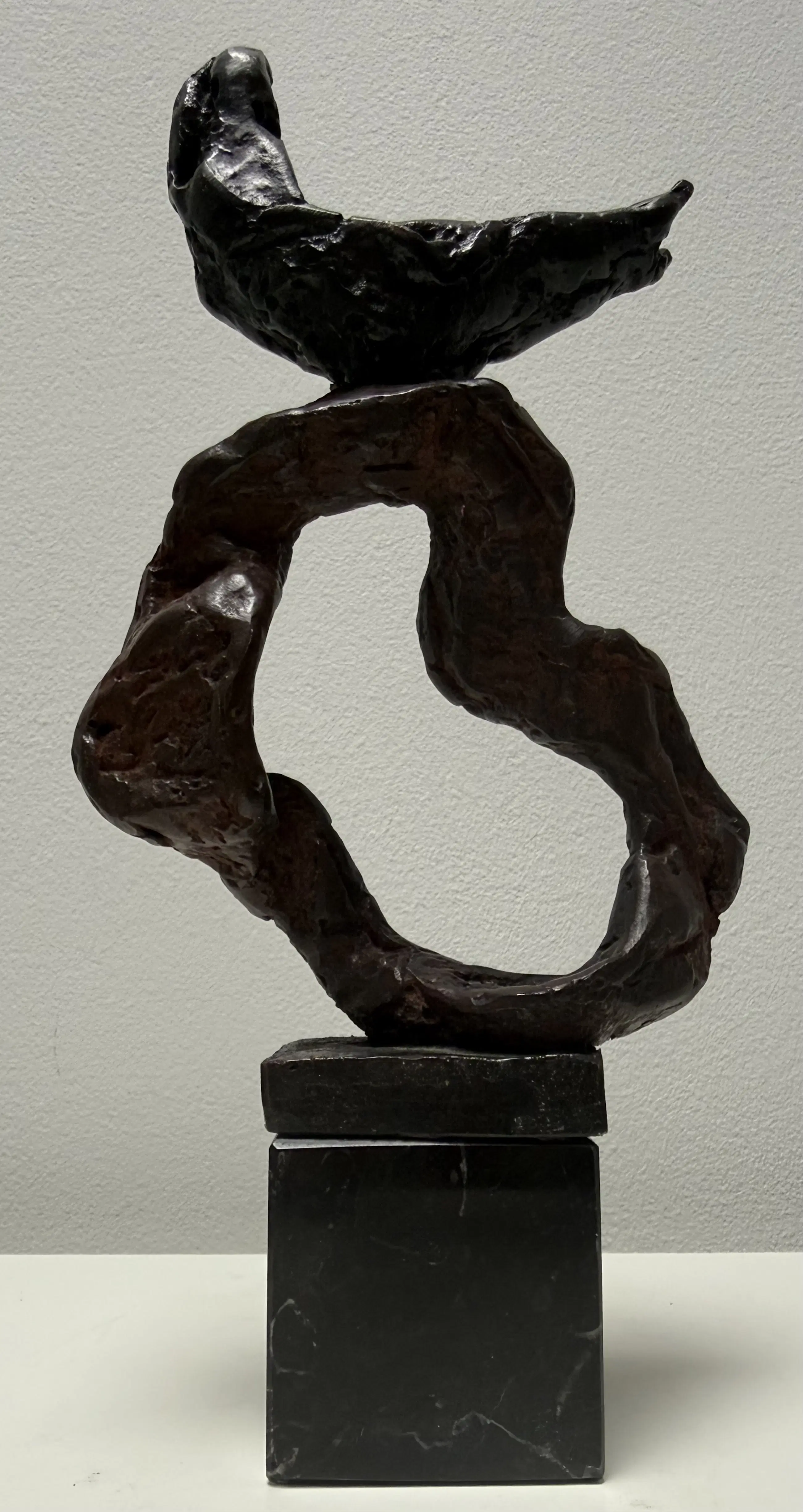 Zeldzaam beeld met zeer fraaie vormgeving en composite. Liggend figuur op een opengewerkte vorm.