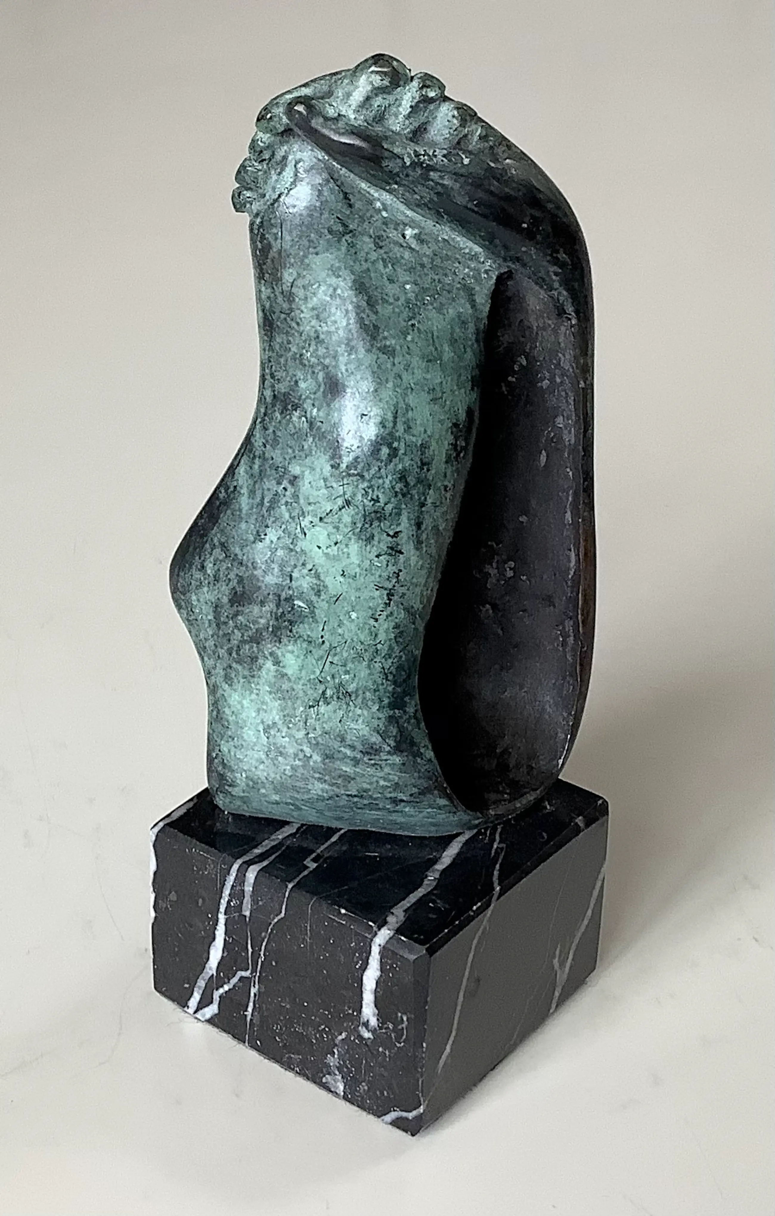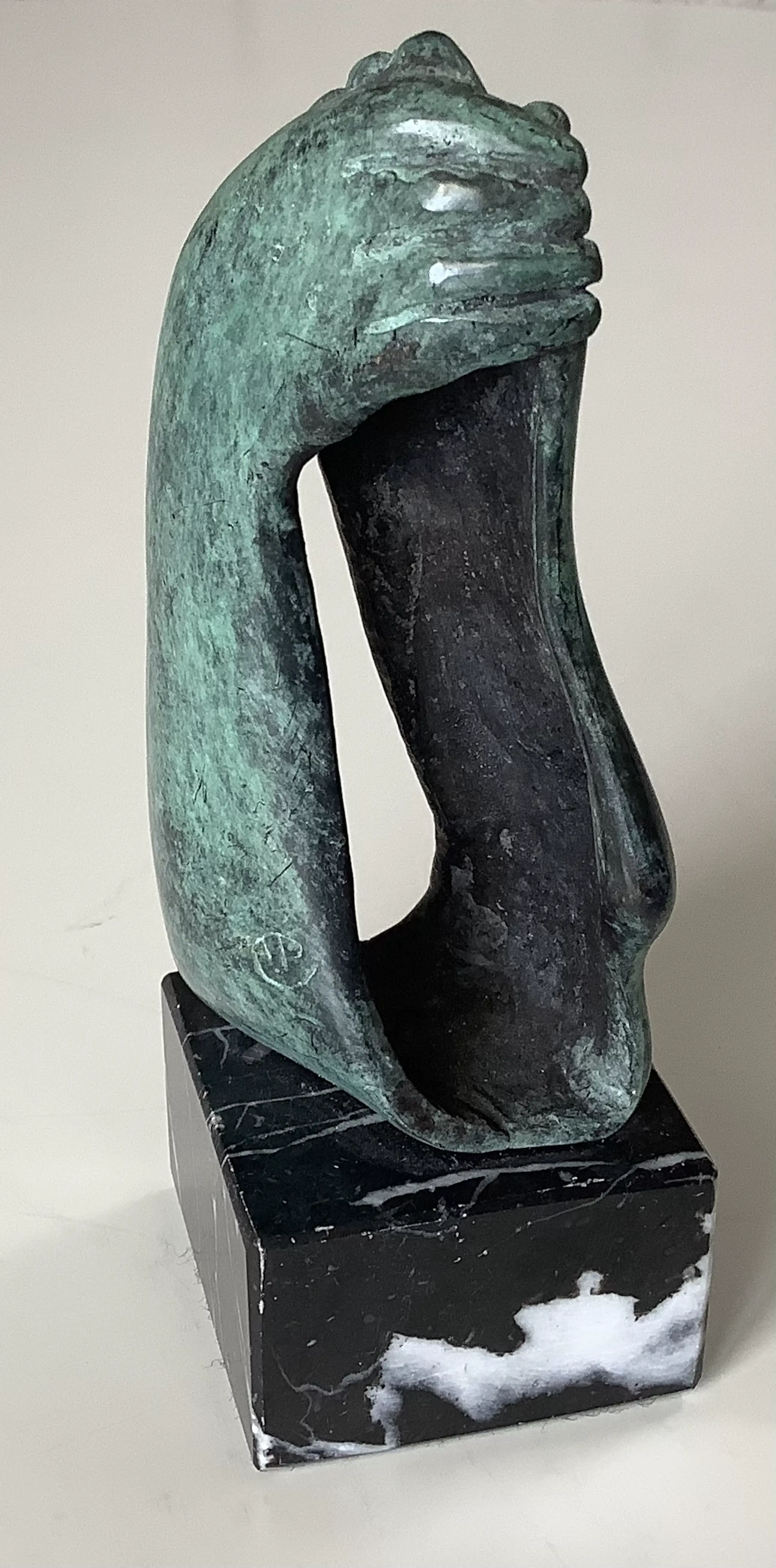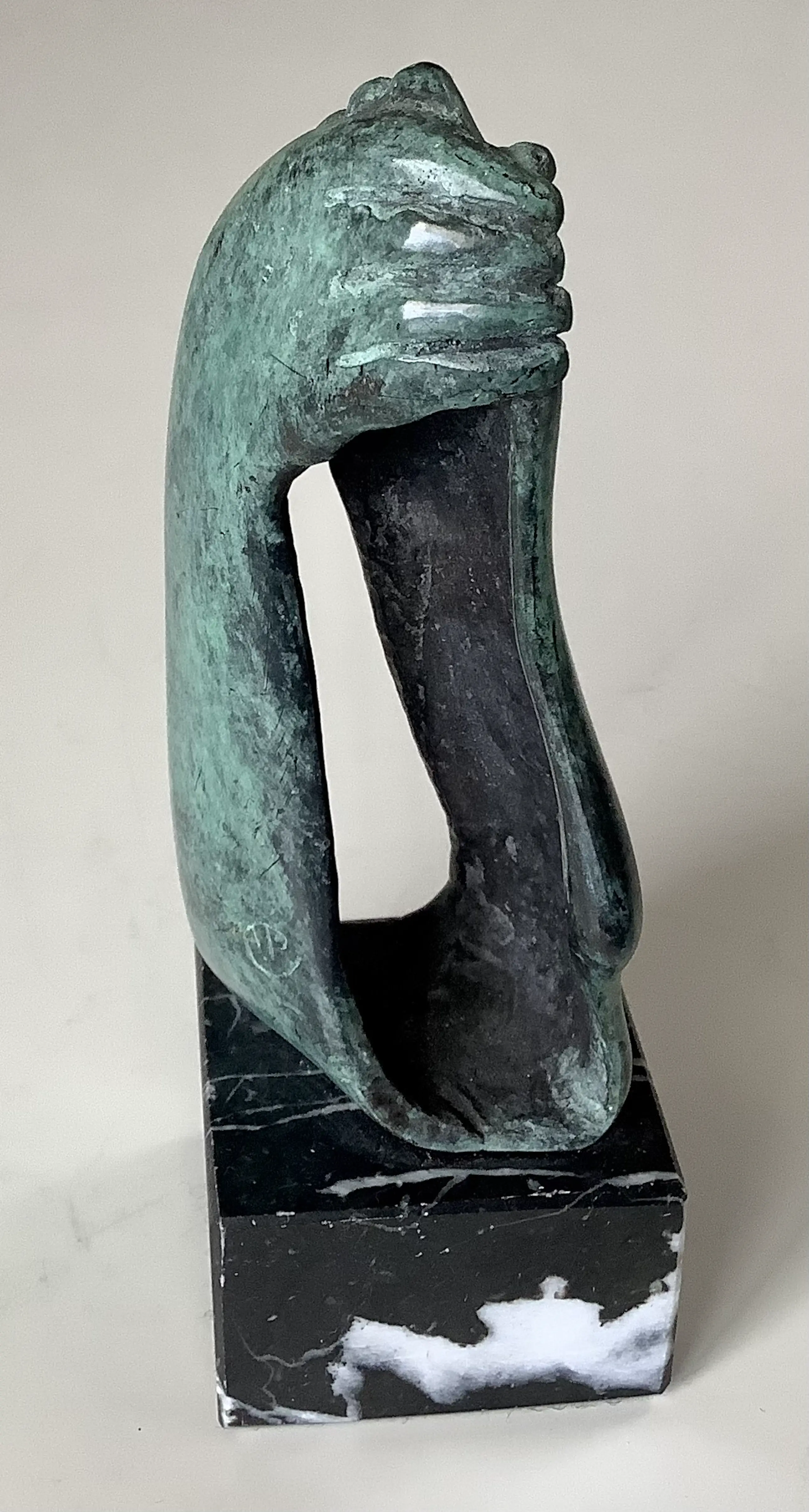 Kleine uitvoering van het beeld hand-voet. Mooi gesigneerd met fraaie patina. Sokkeltje ook in perfecte staat.