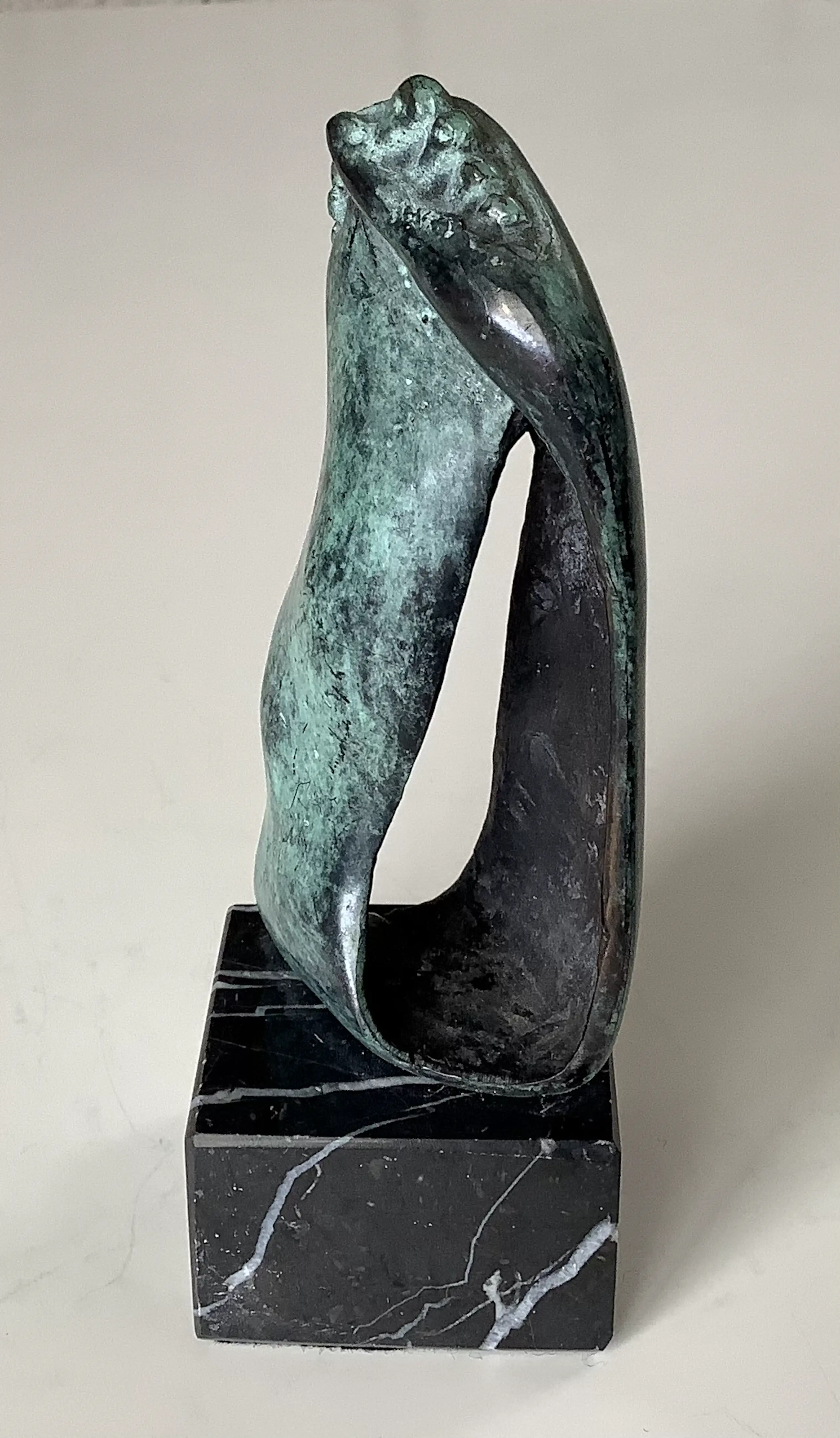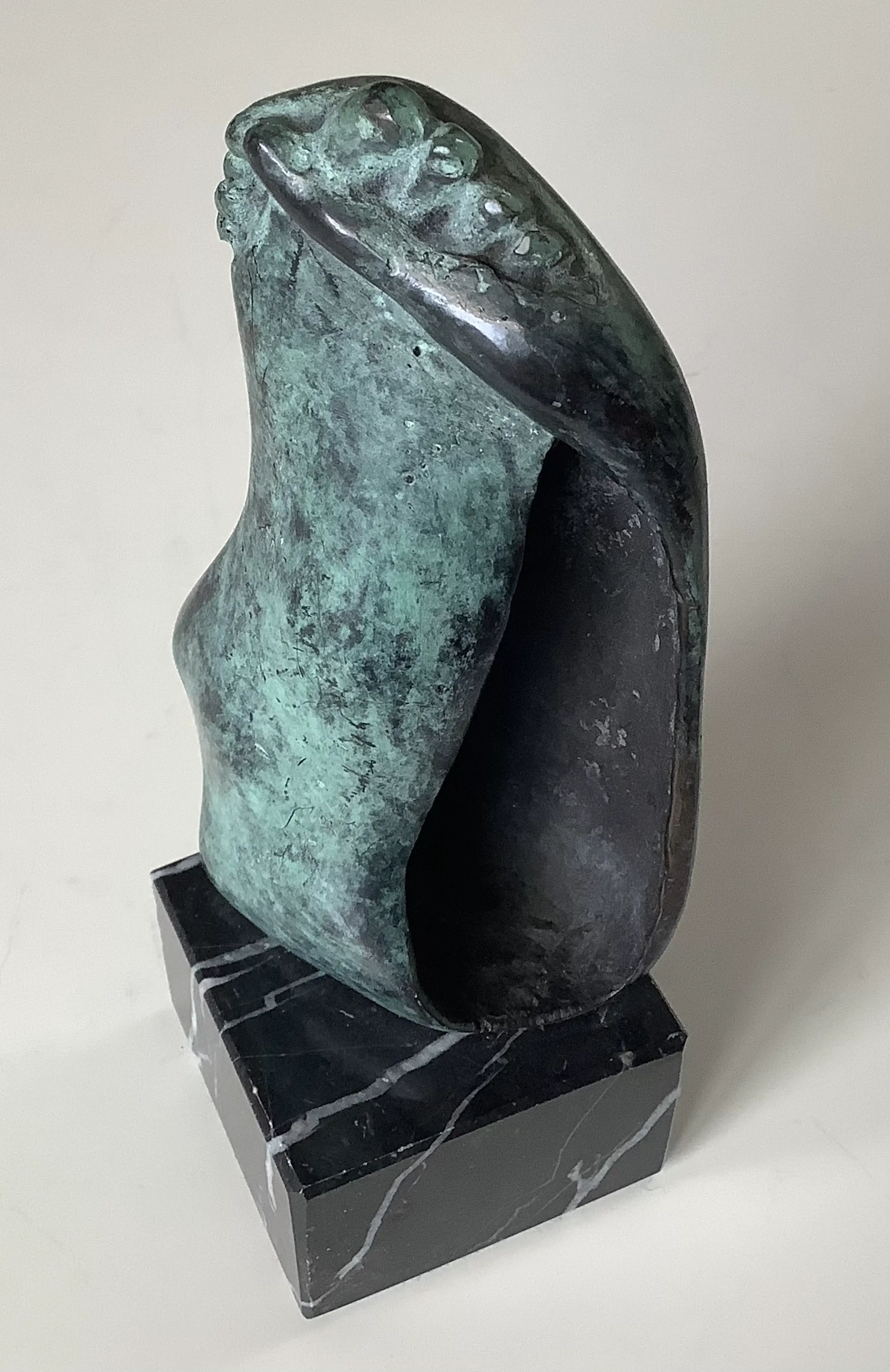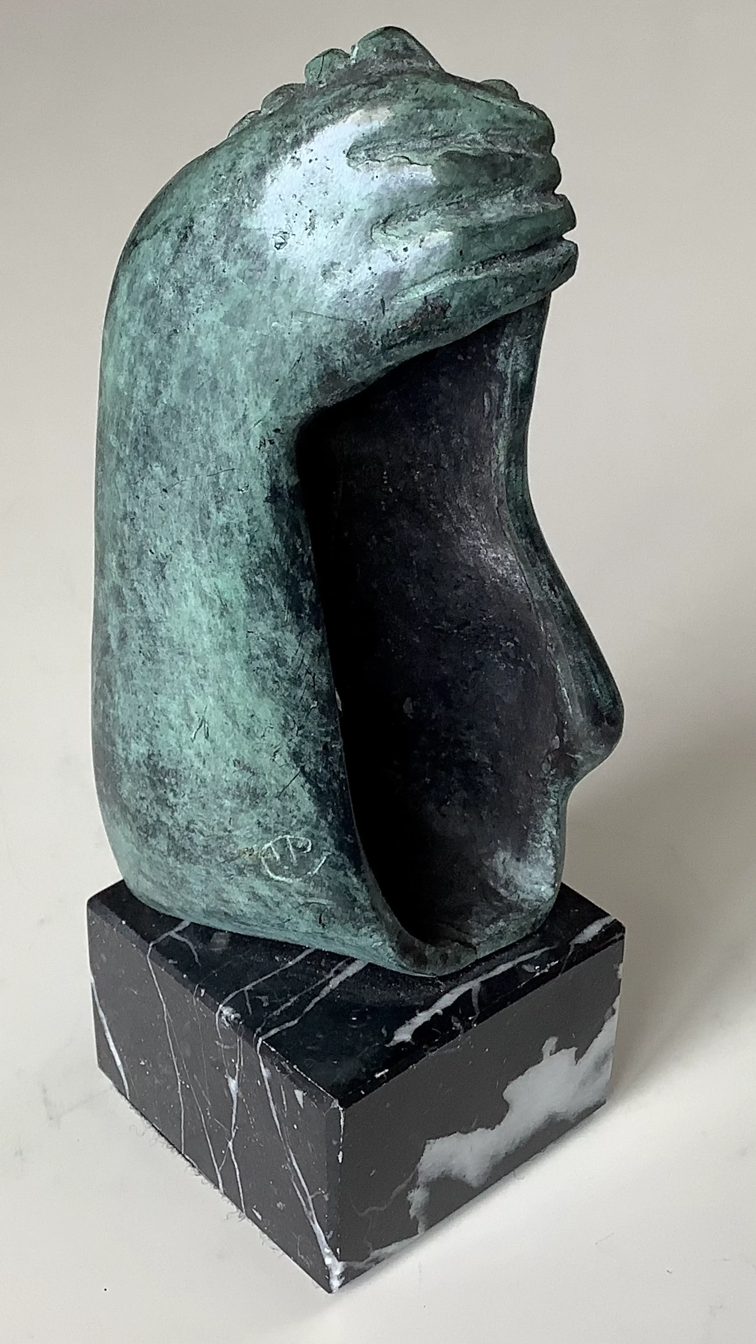 Kleine uitvoering van het beeld hand-voet. Mooi gesigneerd met fraaie patina. Sokkeltje ook in perfecte staat.