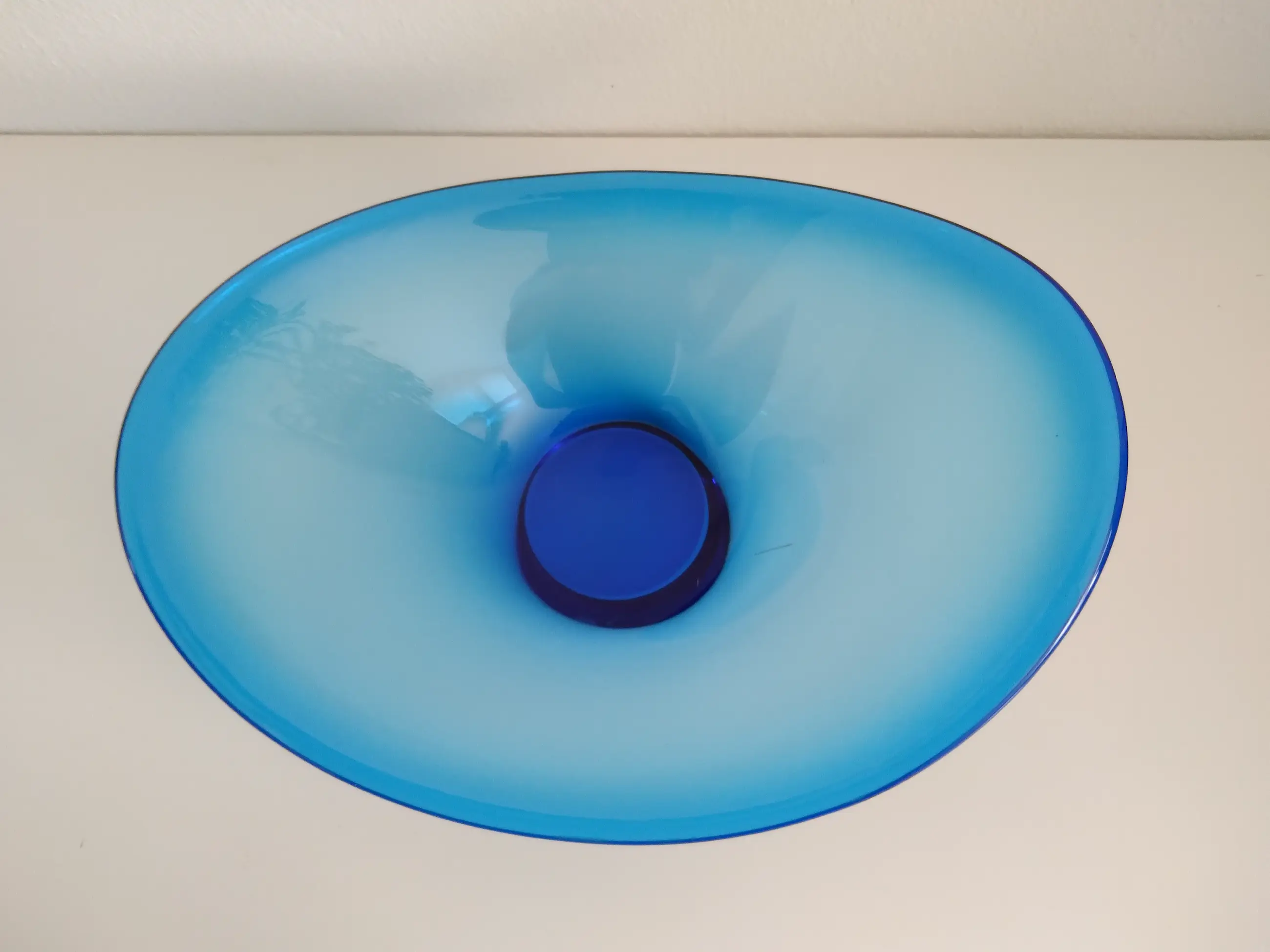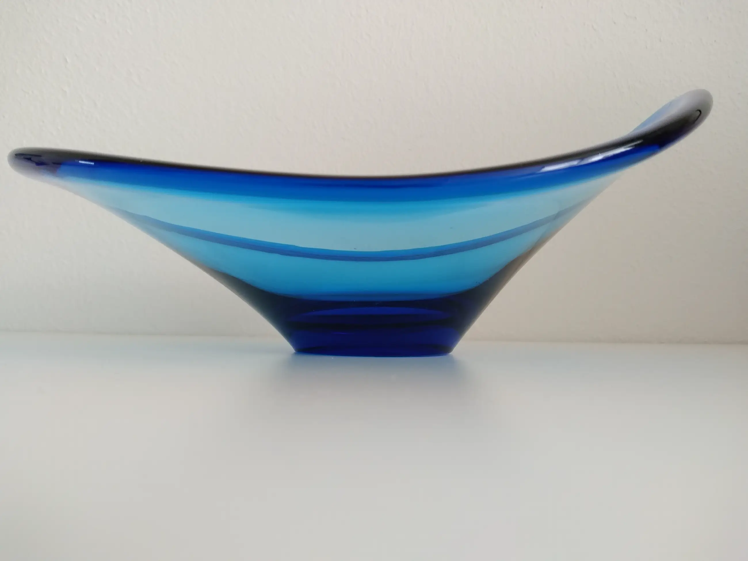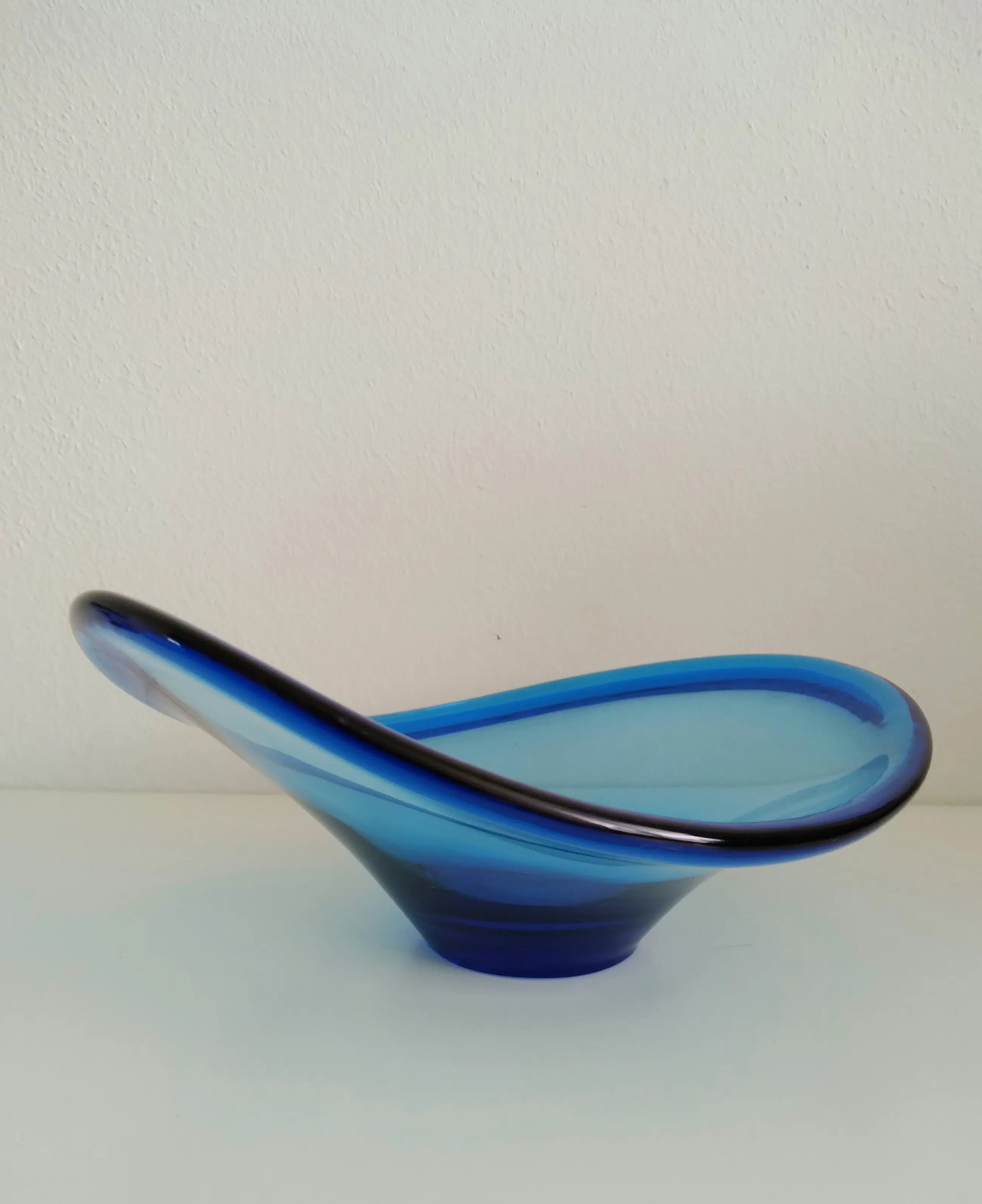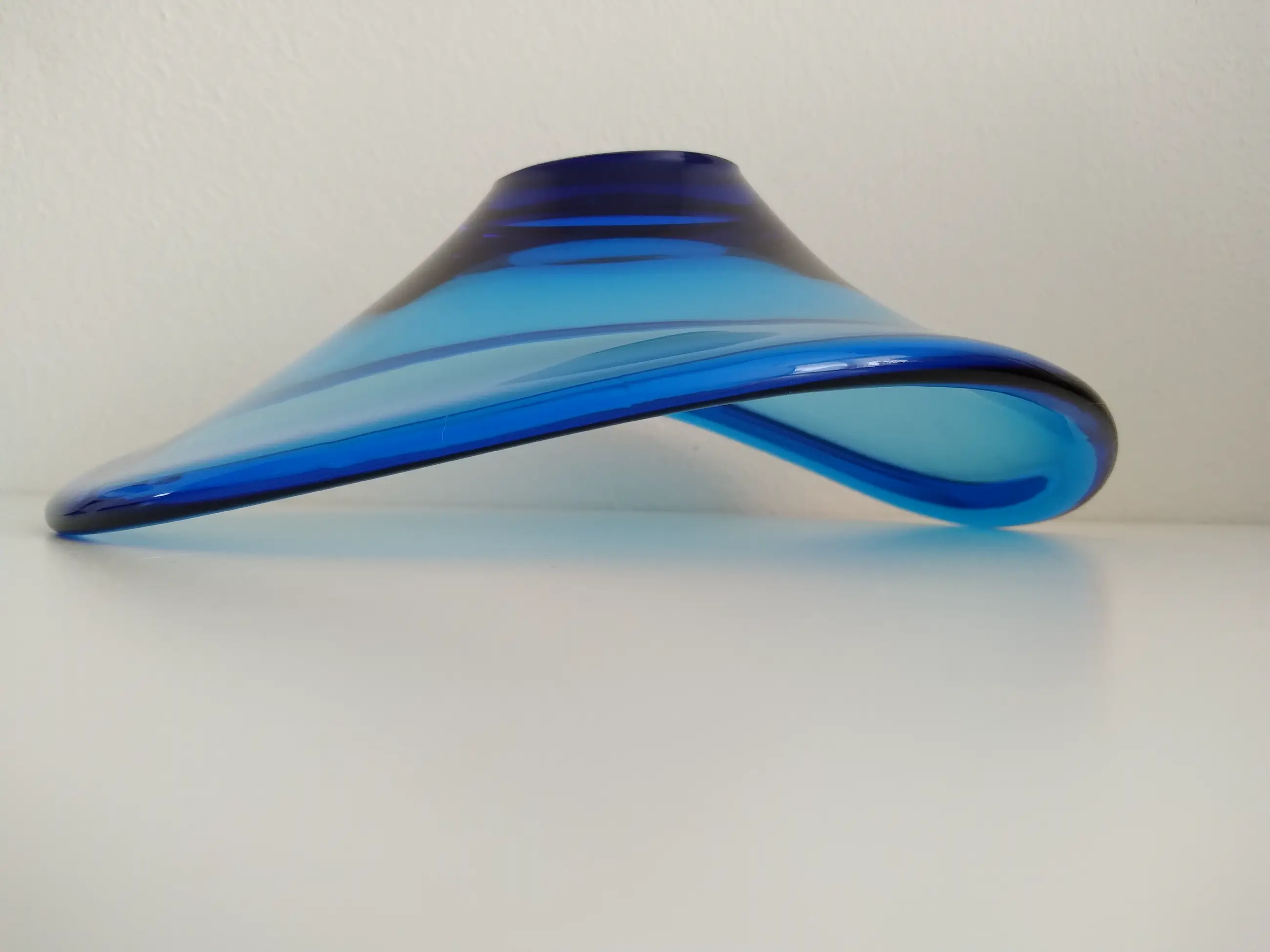 De asymmetrische schaal met een prachtige blauwe kleur is een ontwerp van de Deen Per Lütken.