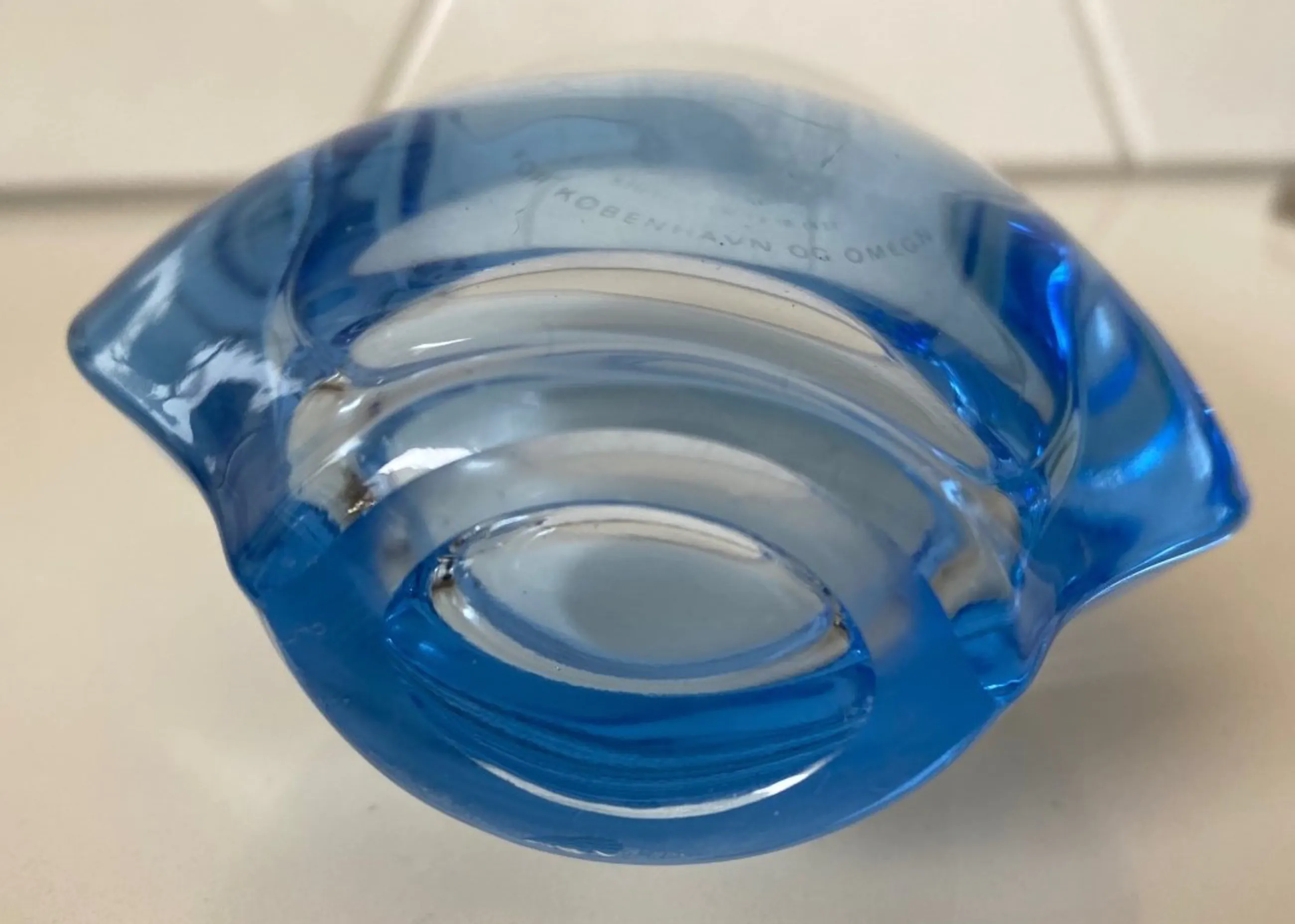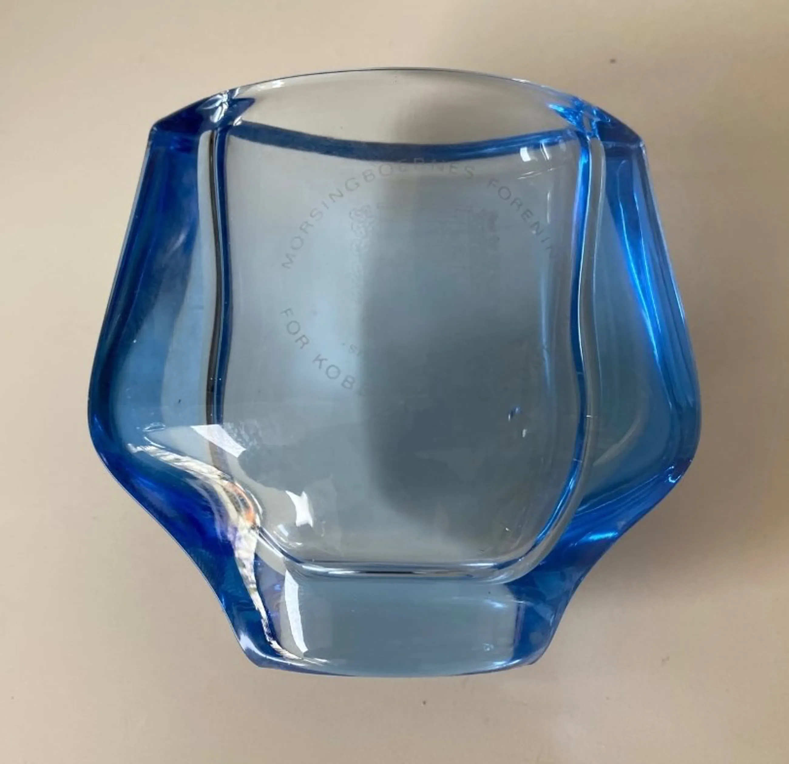 Aqua blauw glazen vaasje ontwerp Per Lutken voor Holmegaard. In zeer goede onbeschadigde conditie. Het vaasje is aan de voorzijde voorzien van een opdruk van een organisatie uit Kopenhagen, die de vaasjes bij Holmegaard heeft besteld als een geschenk voor het personeel oid. echter dit is vanwege de leeftijd al aardig vervaagd dus al veel minder zichtbaar.
