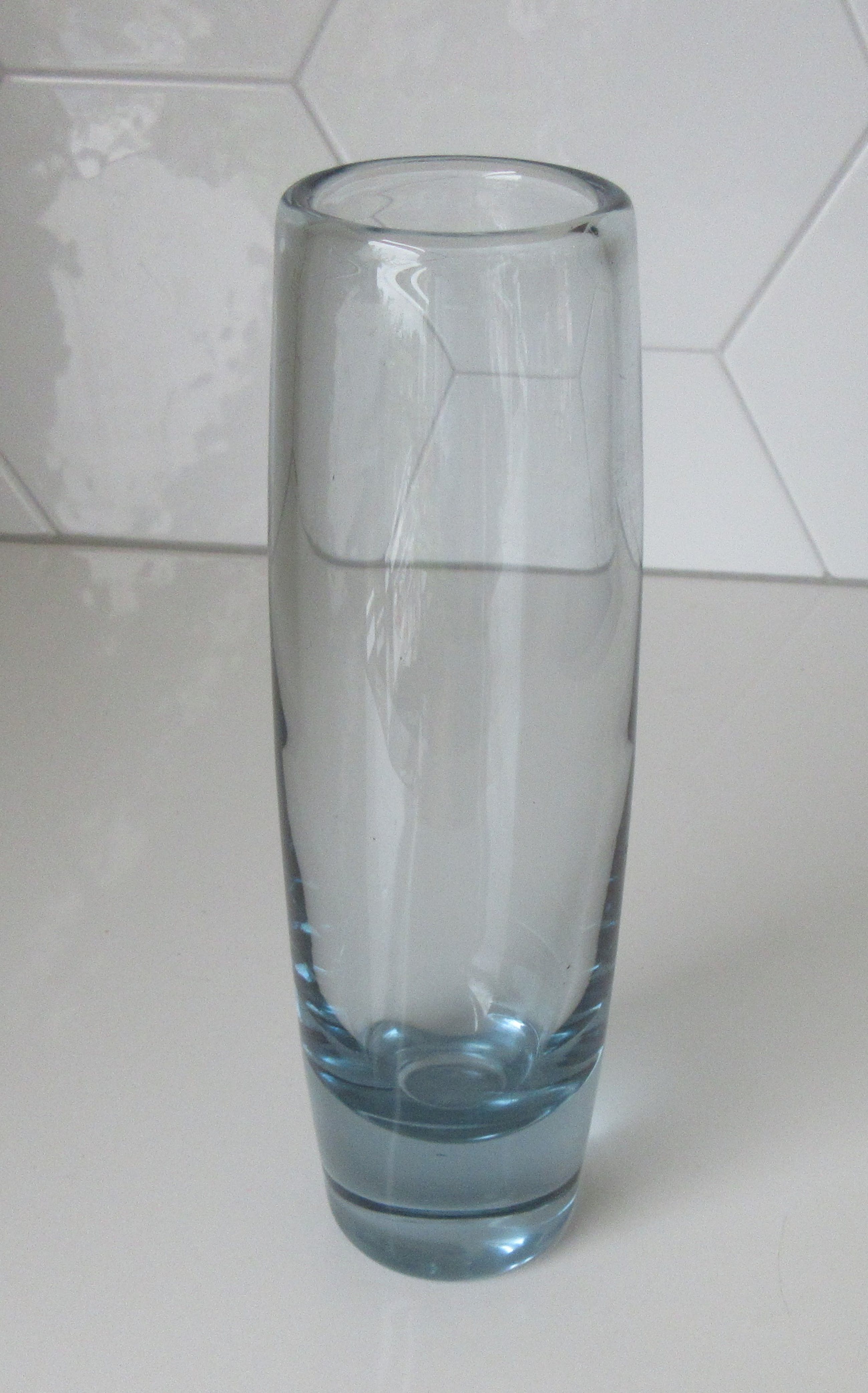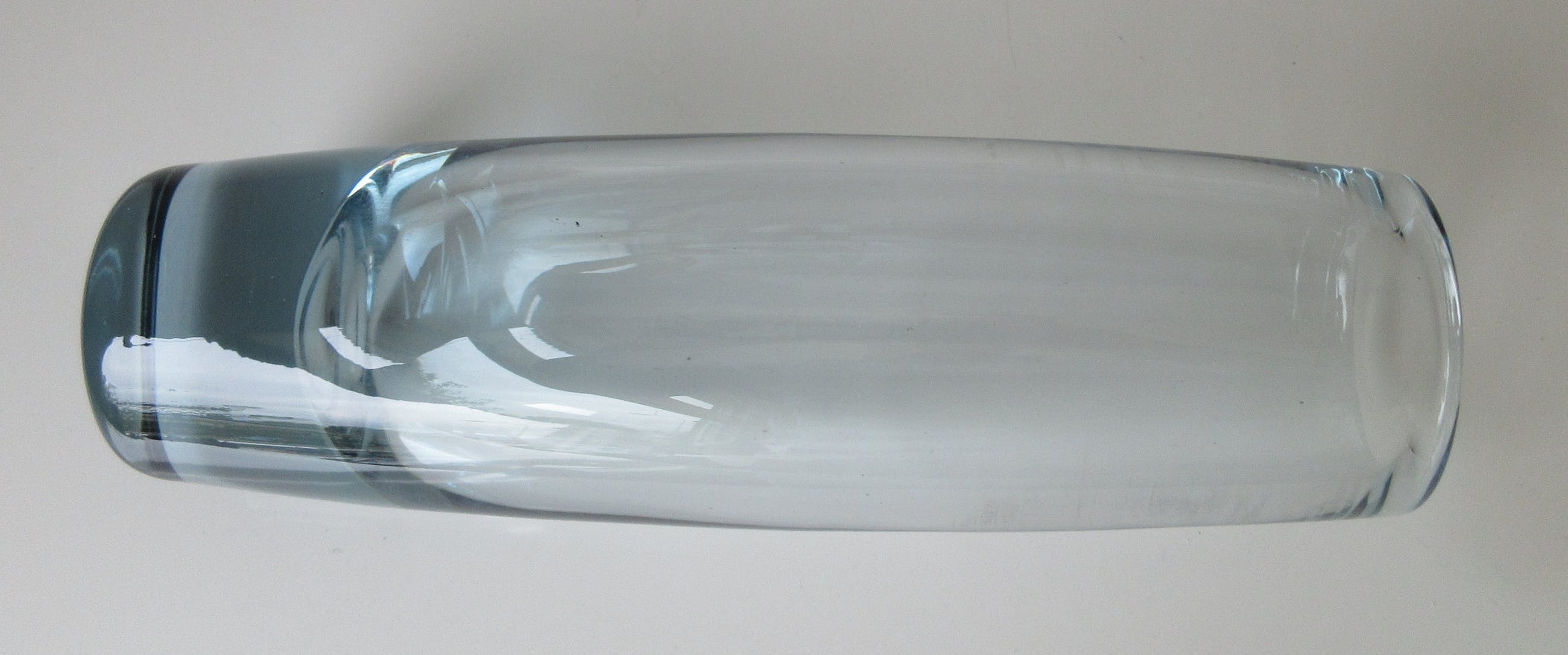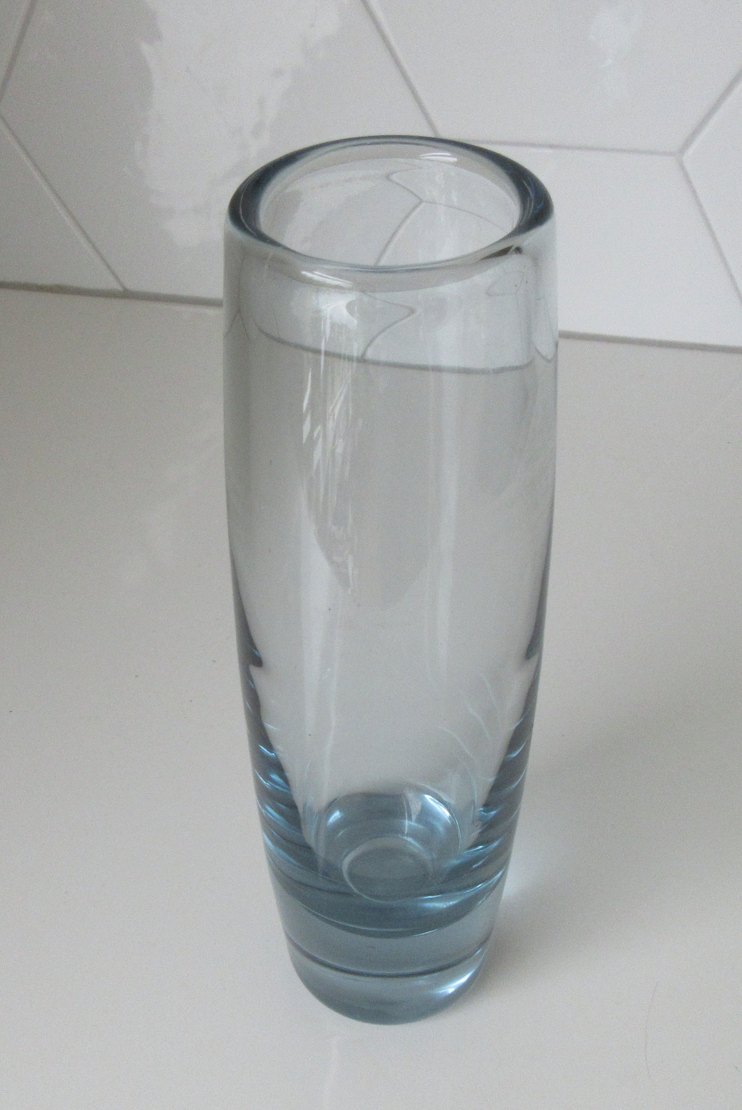 Mooie blauw grijze dikwandige cilinder vaas uit de Akva serie uit de jaren'60 ontworpen door Per Lütken voor Holmegaard. In prima onbeschadigde conditie. Met de diamantpen gemerkt en gesigneerd op de onderzijde van de vaas.