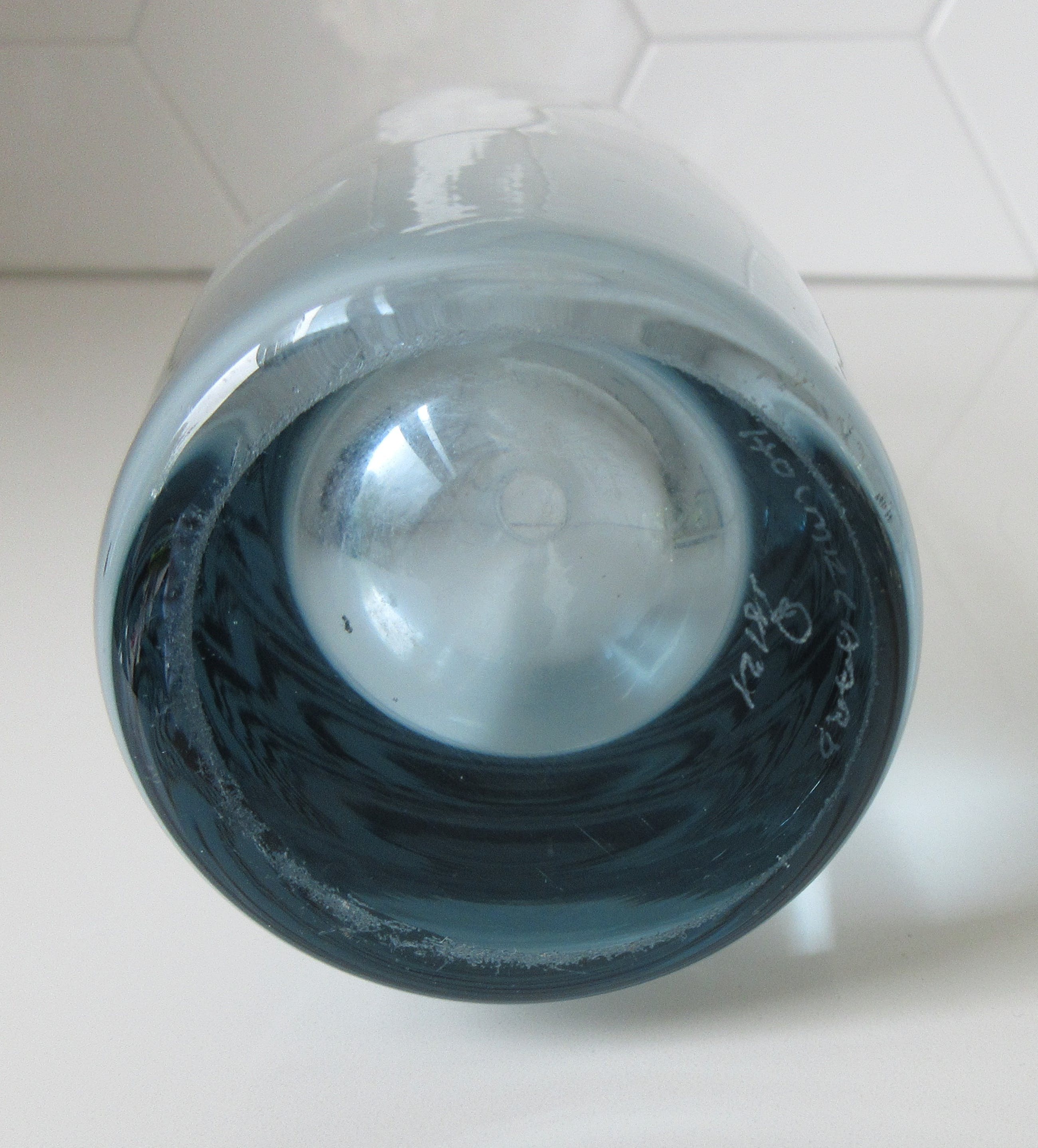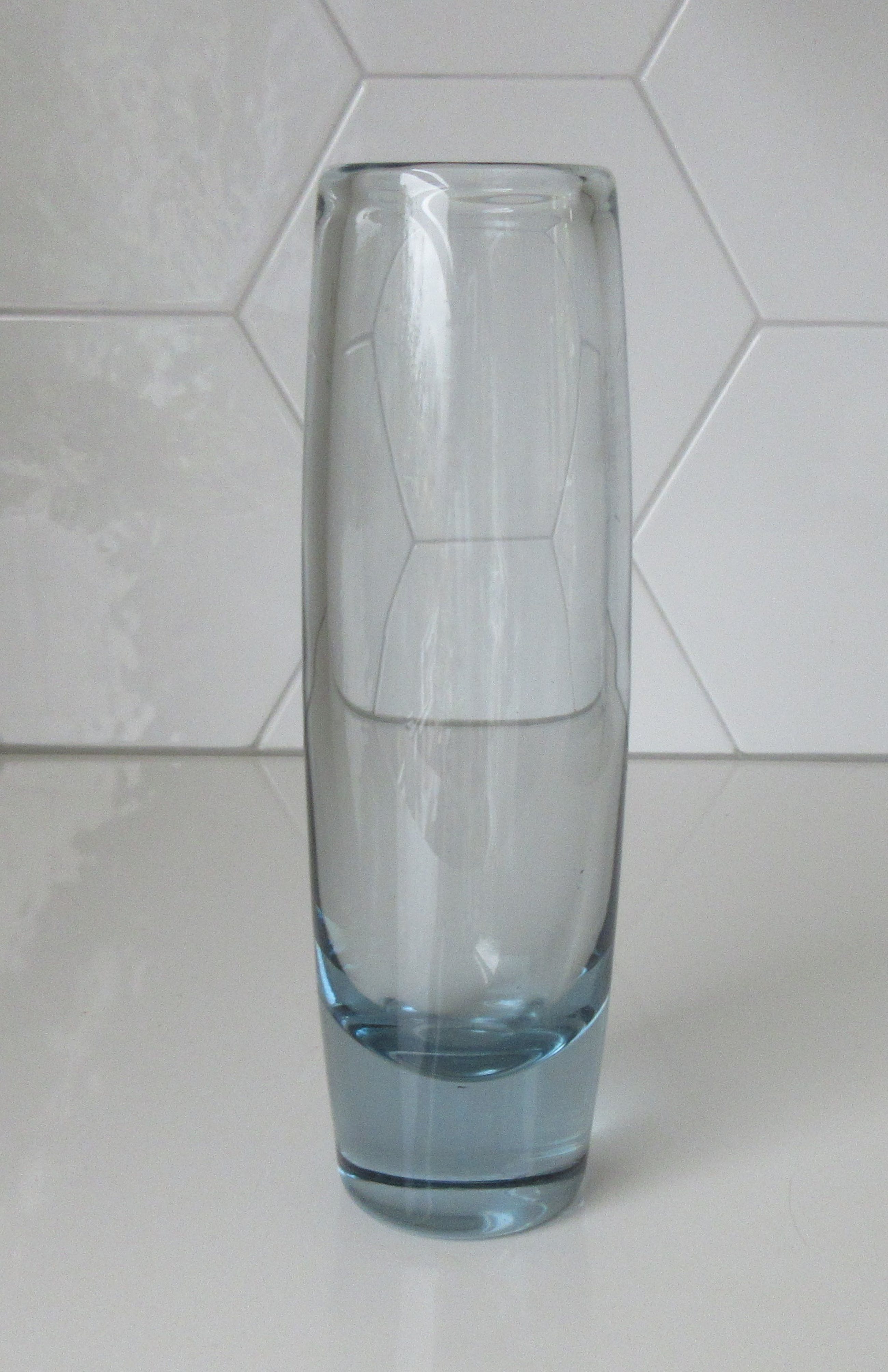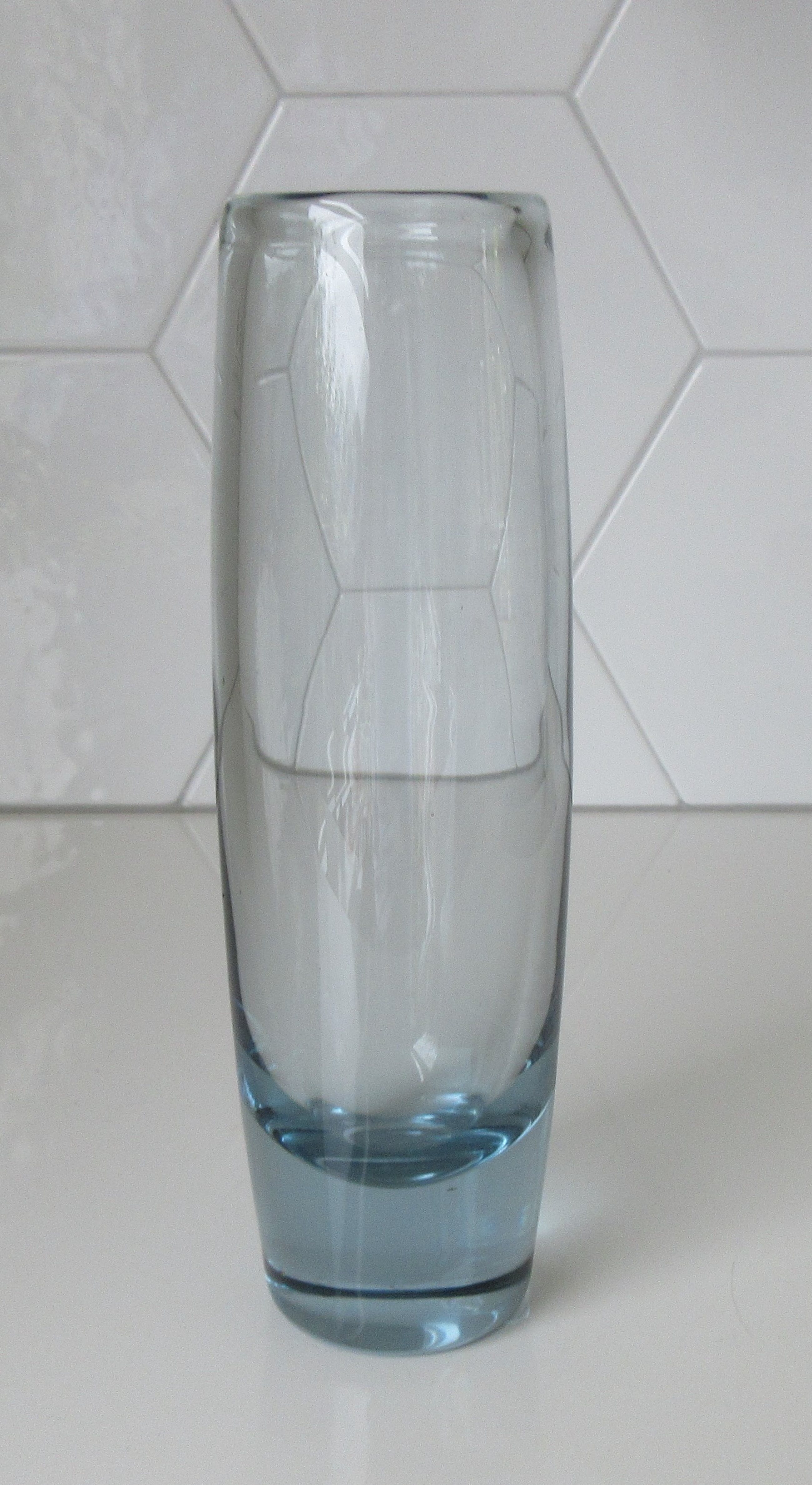 Mooie blauw grijze dikwandige cilinder vaas uit de Akva serie uit de jaren'60 ontworpen door Per Lütken voor Holmegaard. In prima onbeschadigde conditie. Met de diamantpen gemerkt en gesigneerd op de onderzijde van de vaas.