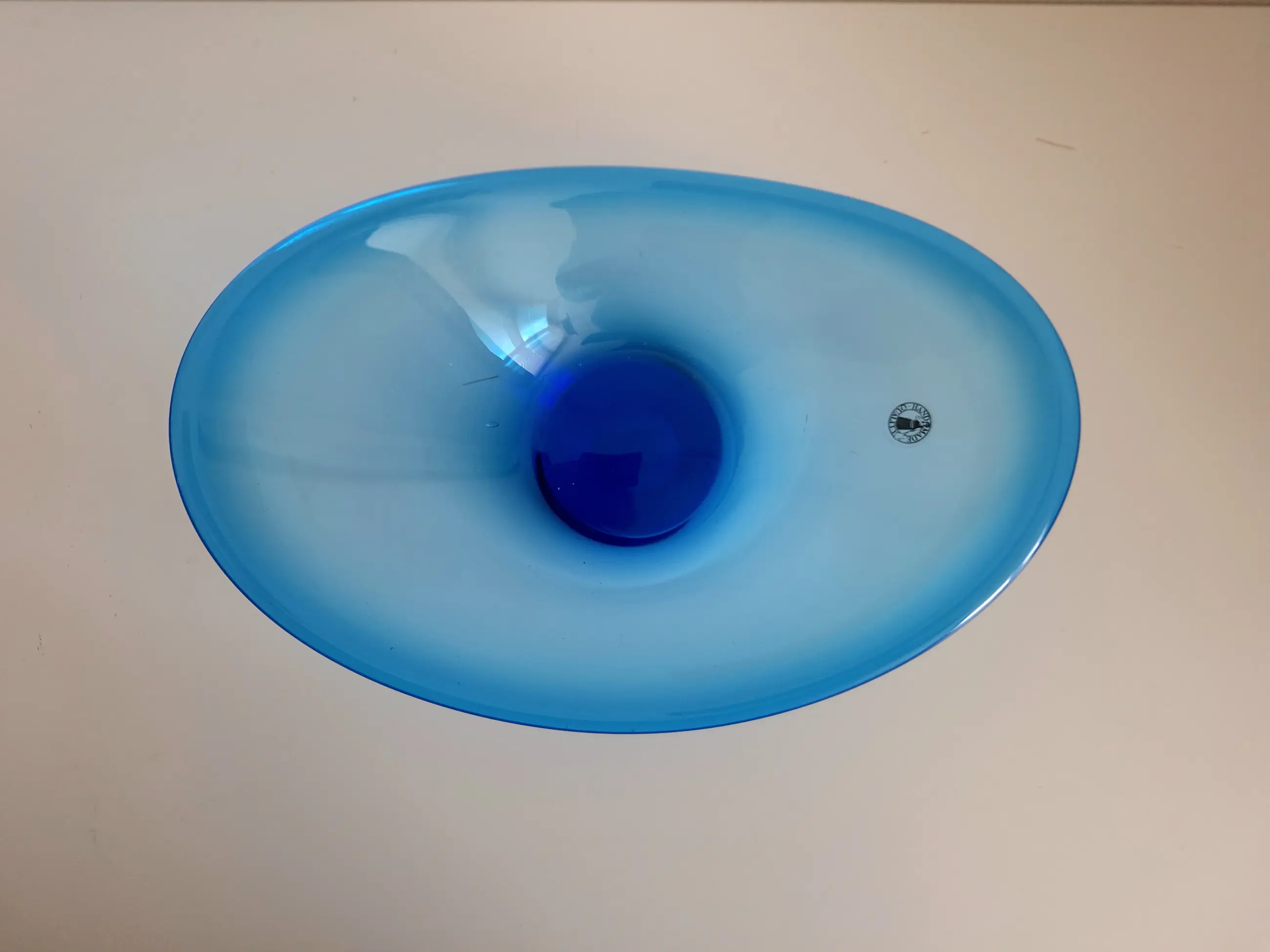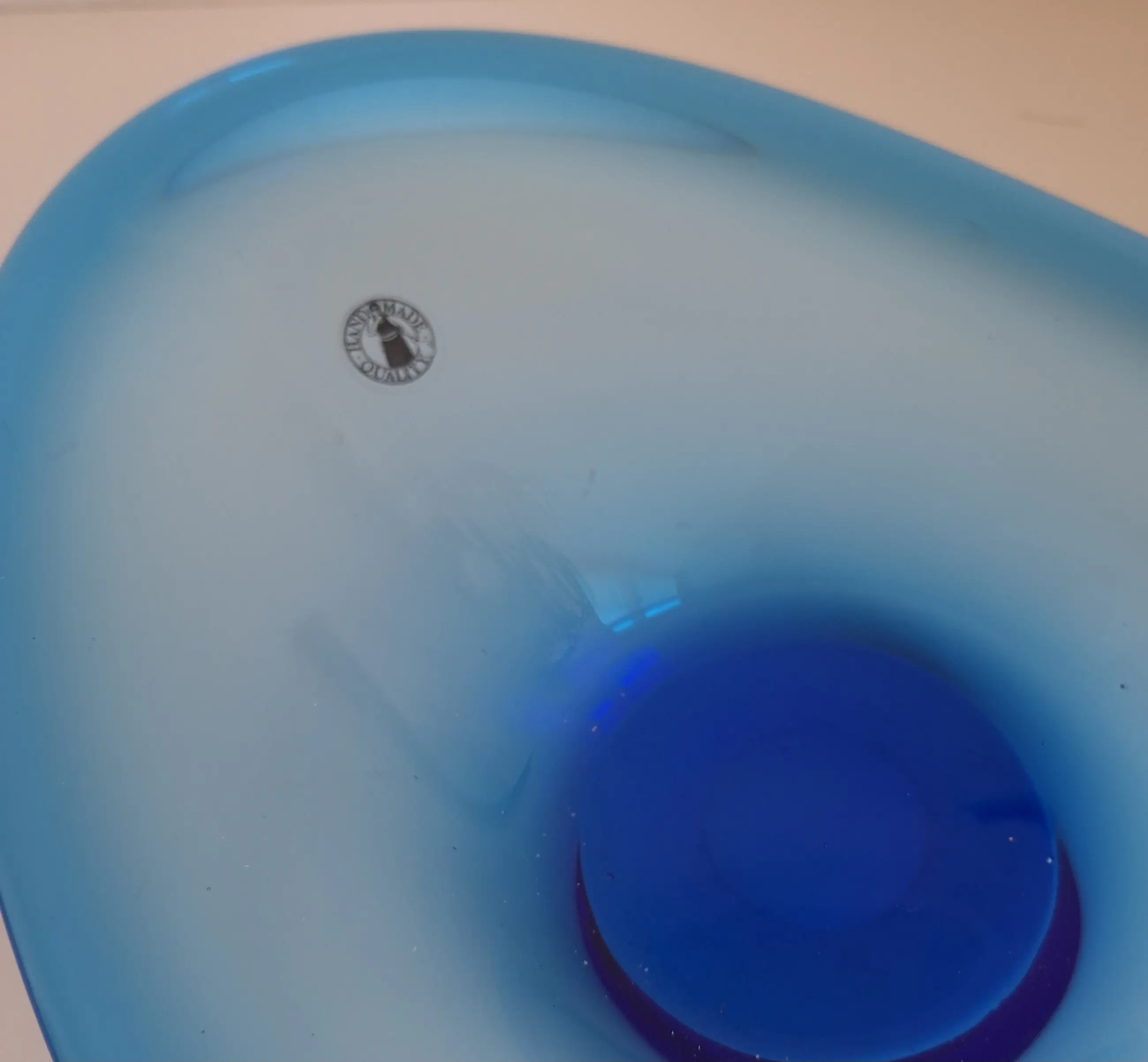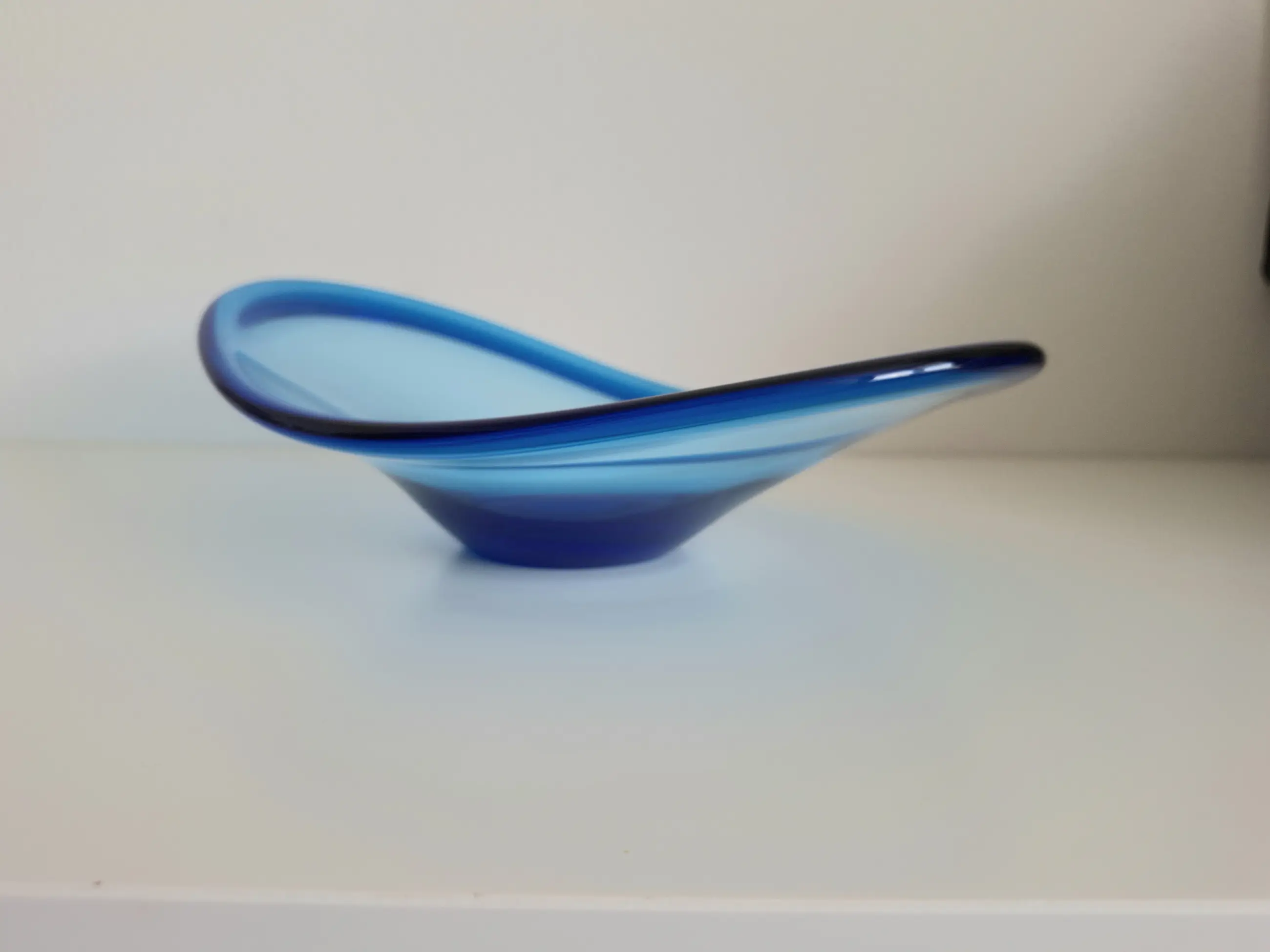 Deze handgemaakte, asymmetrische schaal in deze prachtige blauwe kleur is een ontwerp van de Deen Per Lütken. Het ontwerp uit 1957 is uitgevoerd door de Deense glasblazerij Holmegaard.