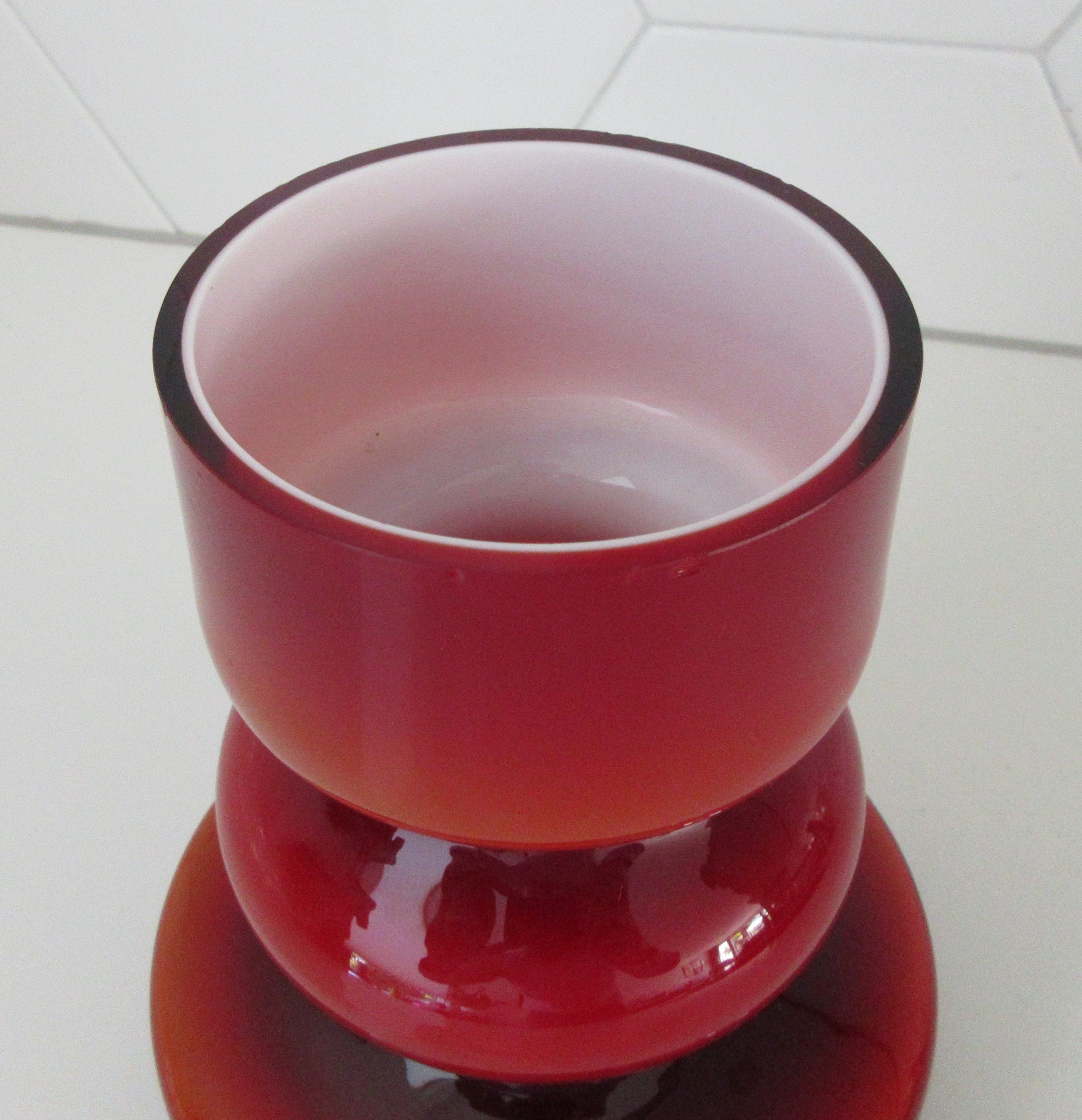 Mooie dikwandige rood-oranje witte glazen vaas uit de Carnaby serie ontworpen door Per Lütken in de jaren'60 voor Kastrup Holmegaard. De vaas heeft op de bovenrand helaas meerdere chipjes (in totaal 11 st.) en is niet gemerkt.