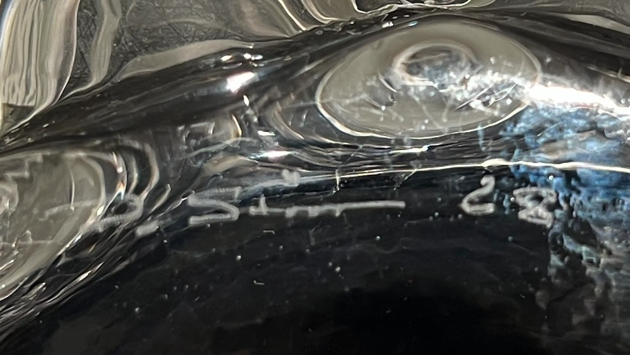 Gemaakt door de Zweedse glasfabrikant Alsterfors in 1968 en ontworpen door de Zweedse glaskunstenaar Per Olof Ström (1930-1992). Aan de onderkant gesigneerd met "P. Ström 68" en heeft een groot uitgeslepen pontil (hol geslepen en gepolijst na het losmaken van de pontil stang) in het midden.