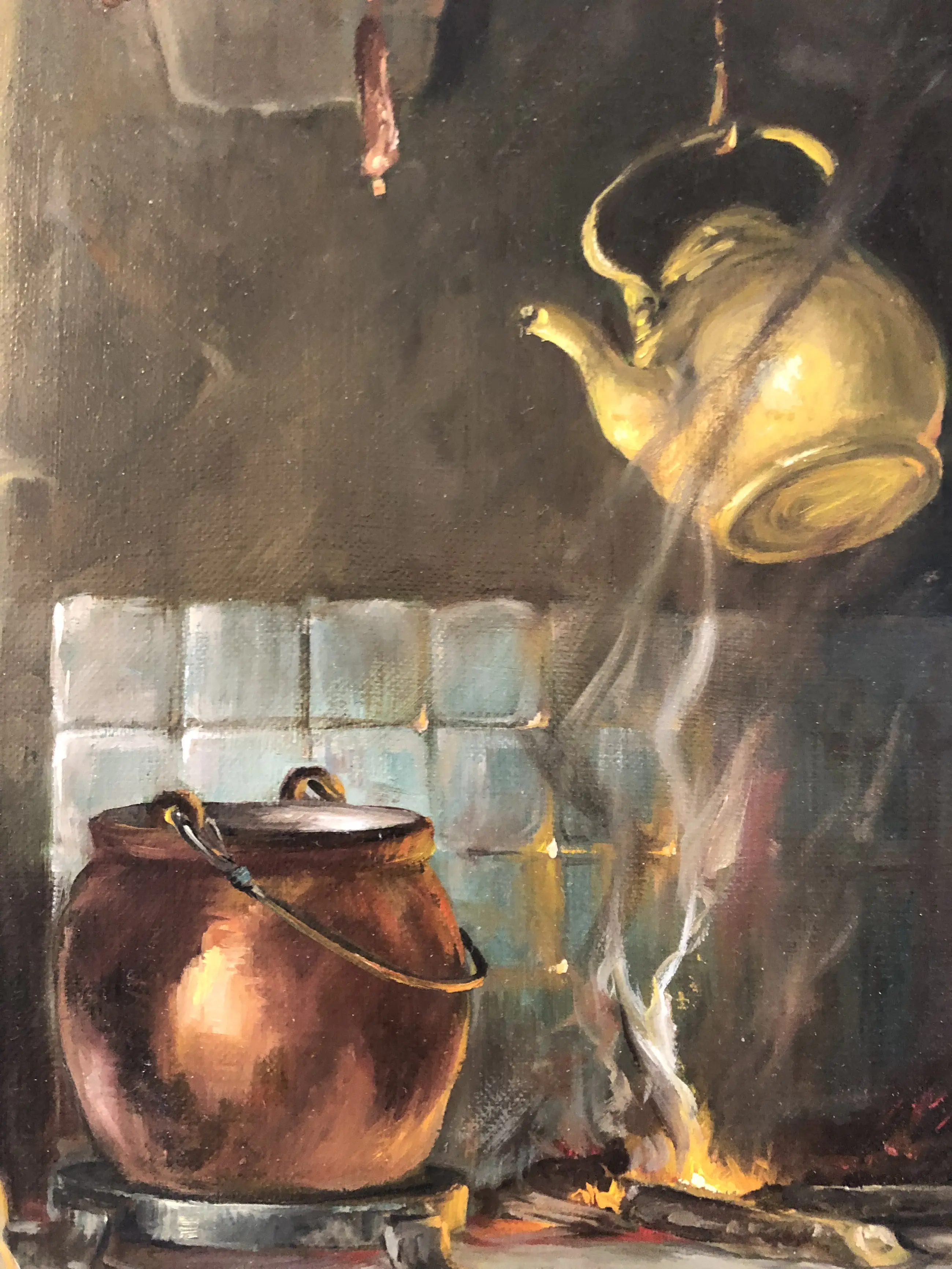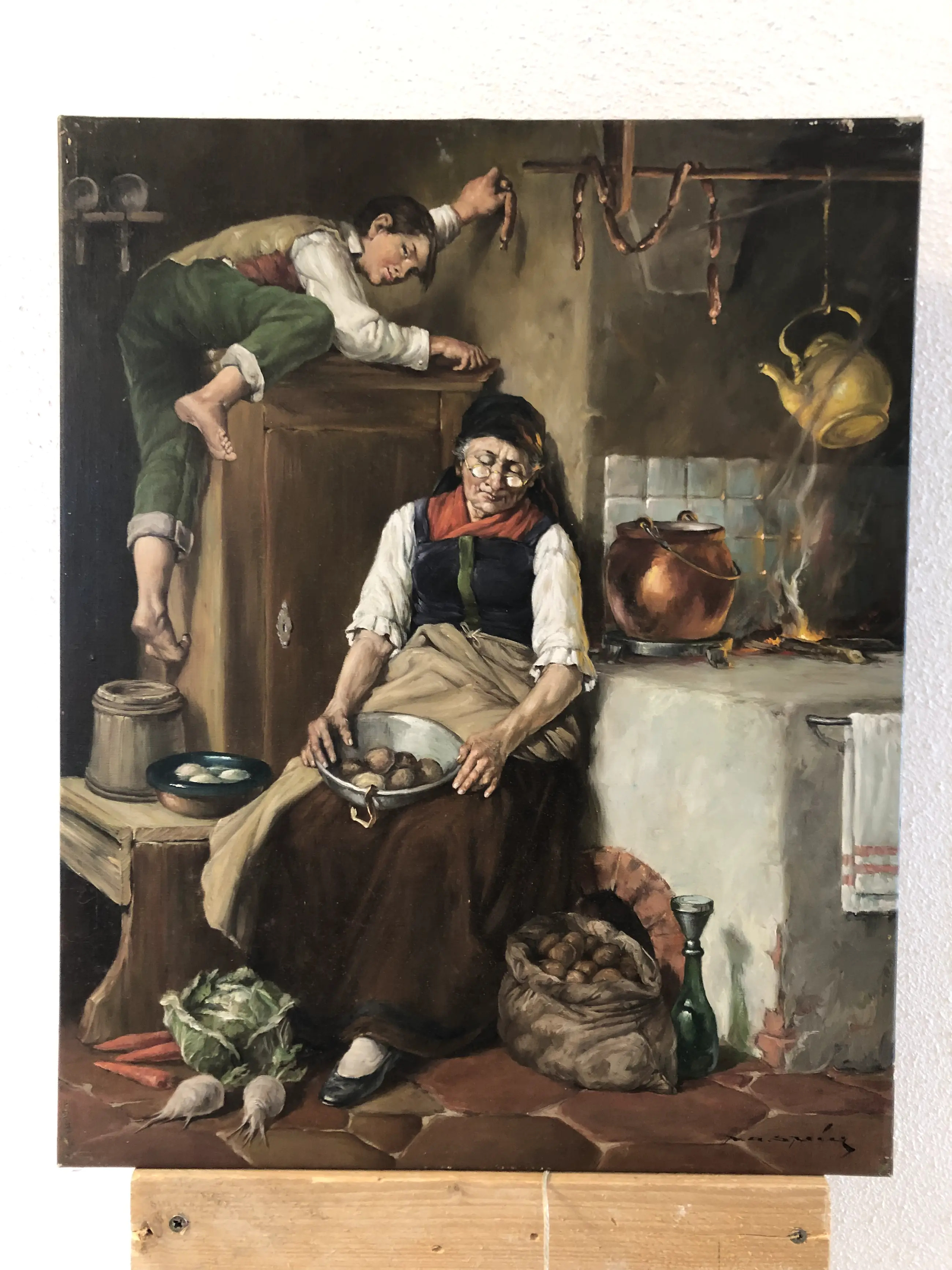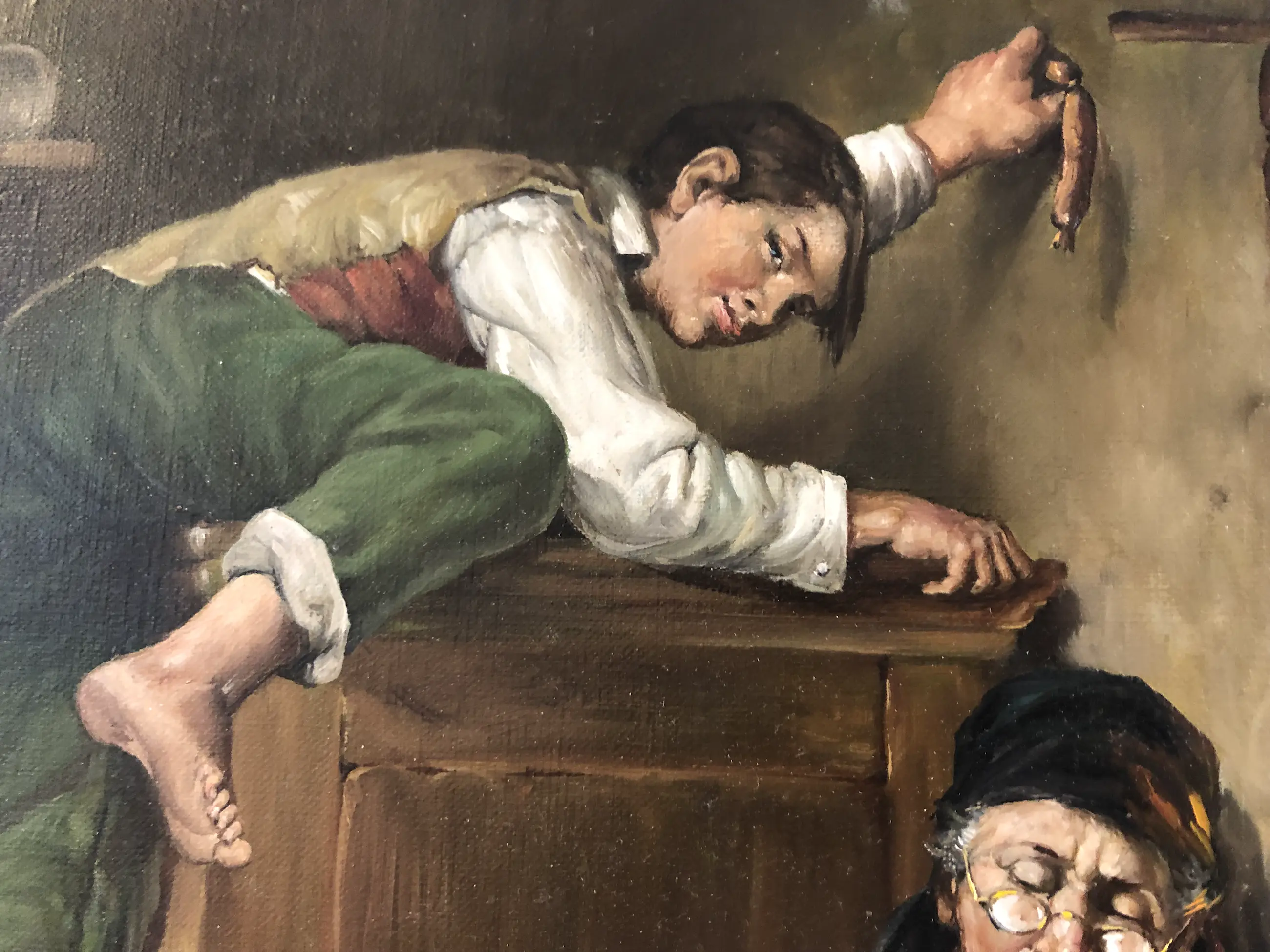 Gezeigt wird eine ländliche Szene, in der ein Junge versucht, ein paar Würstchen zu ergattern.
