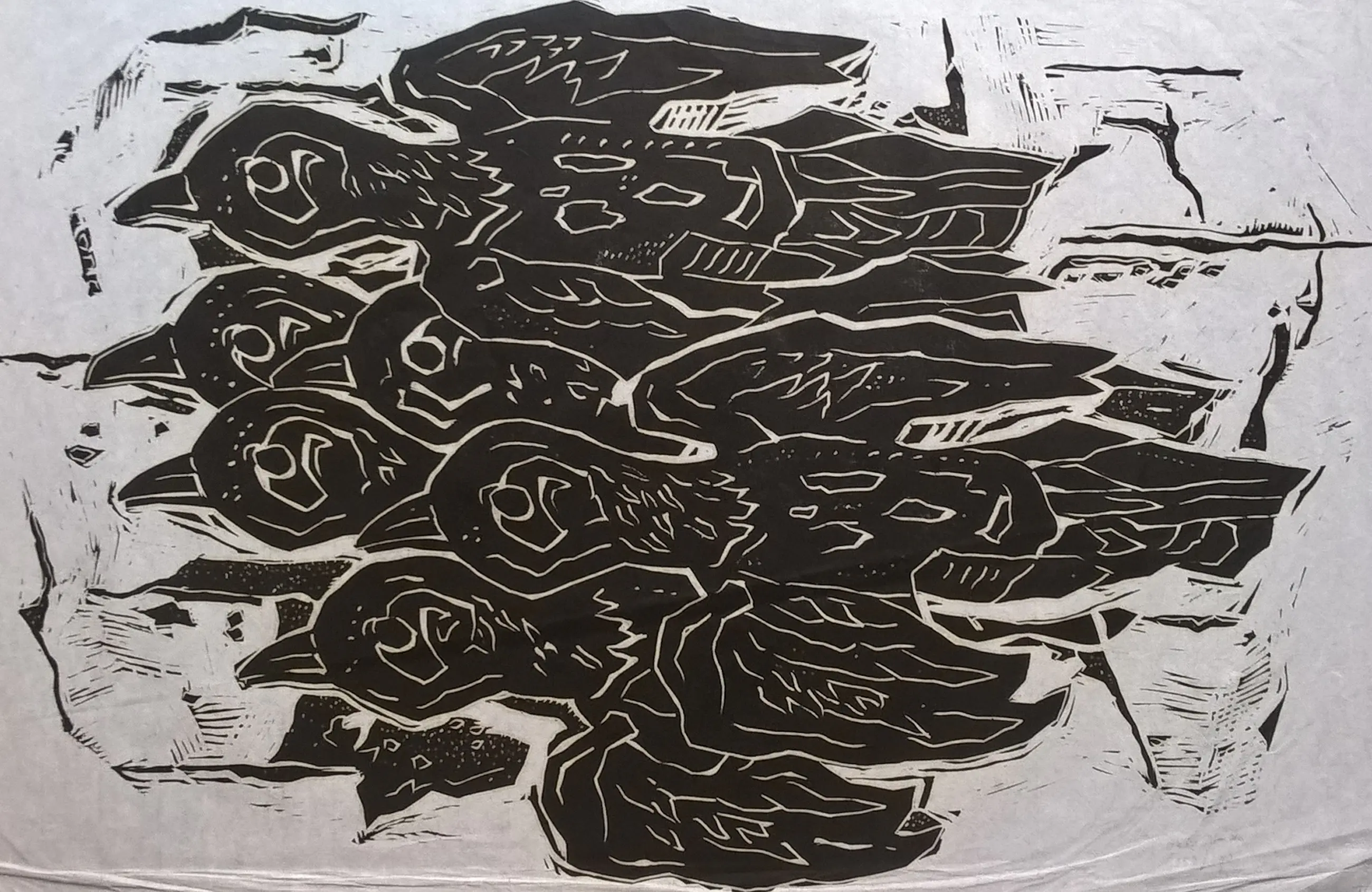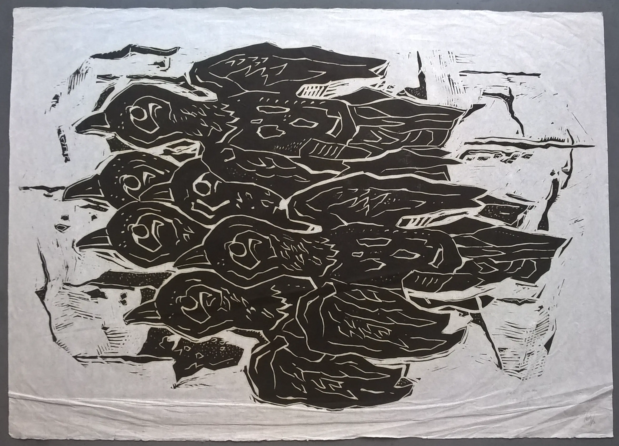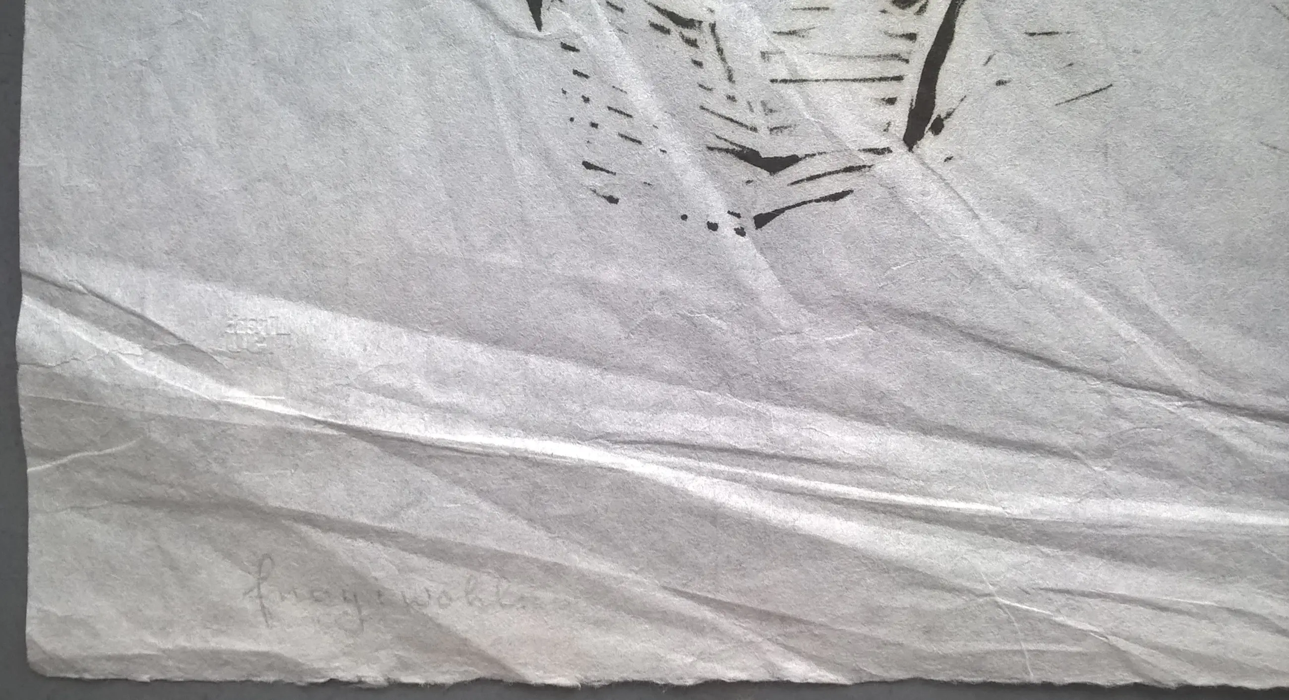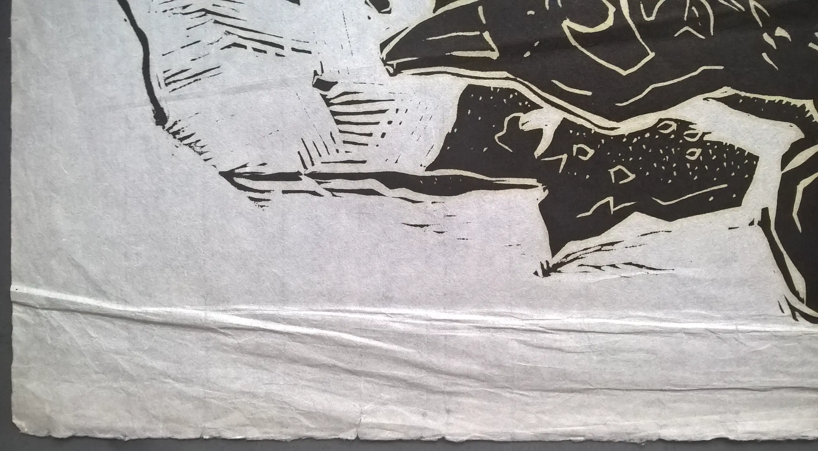 Peter Alma (1886-1969) Linoleumsnede op Japans papier. Rechts is het werk, gesigneerd in potlood en genummerd 158/190 Papiermaat 62 x 87 cm. In het papier zitten een aantal vouwen / kreukels Rechtsonder zit een scheurtje in het papier van ca. 1 cm (nauwelijks zichtbaar). Verder goed.