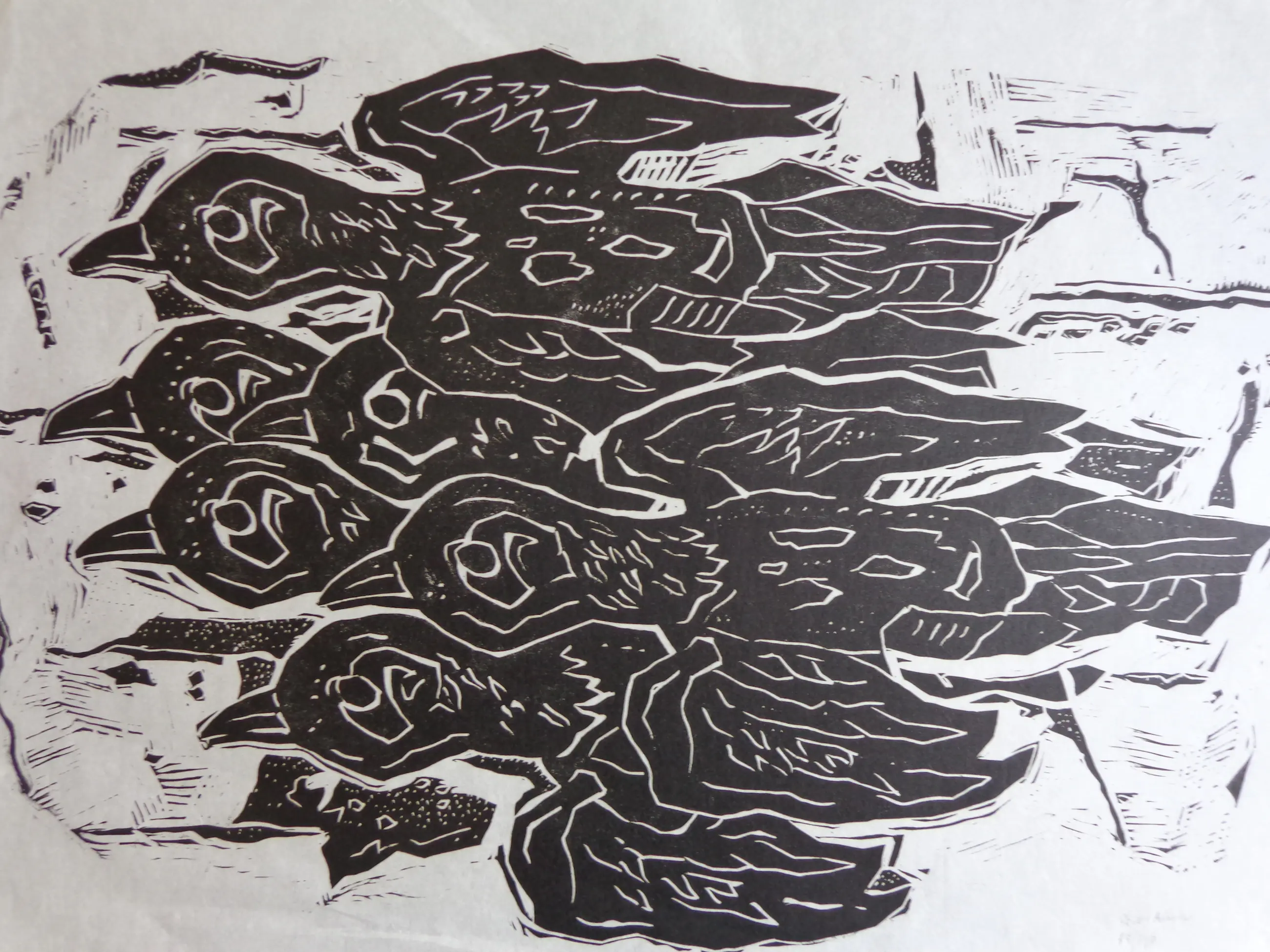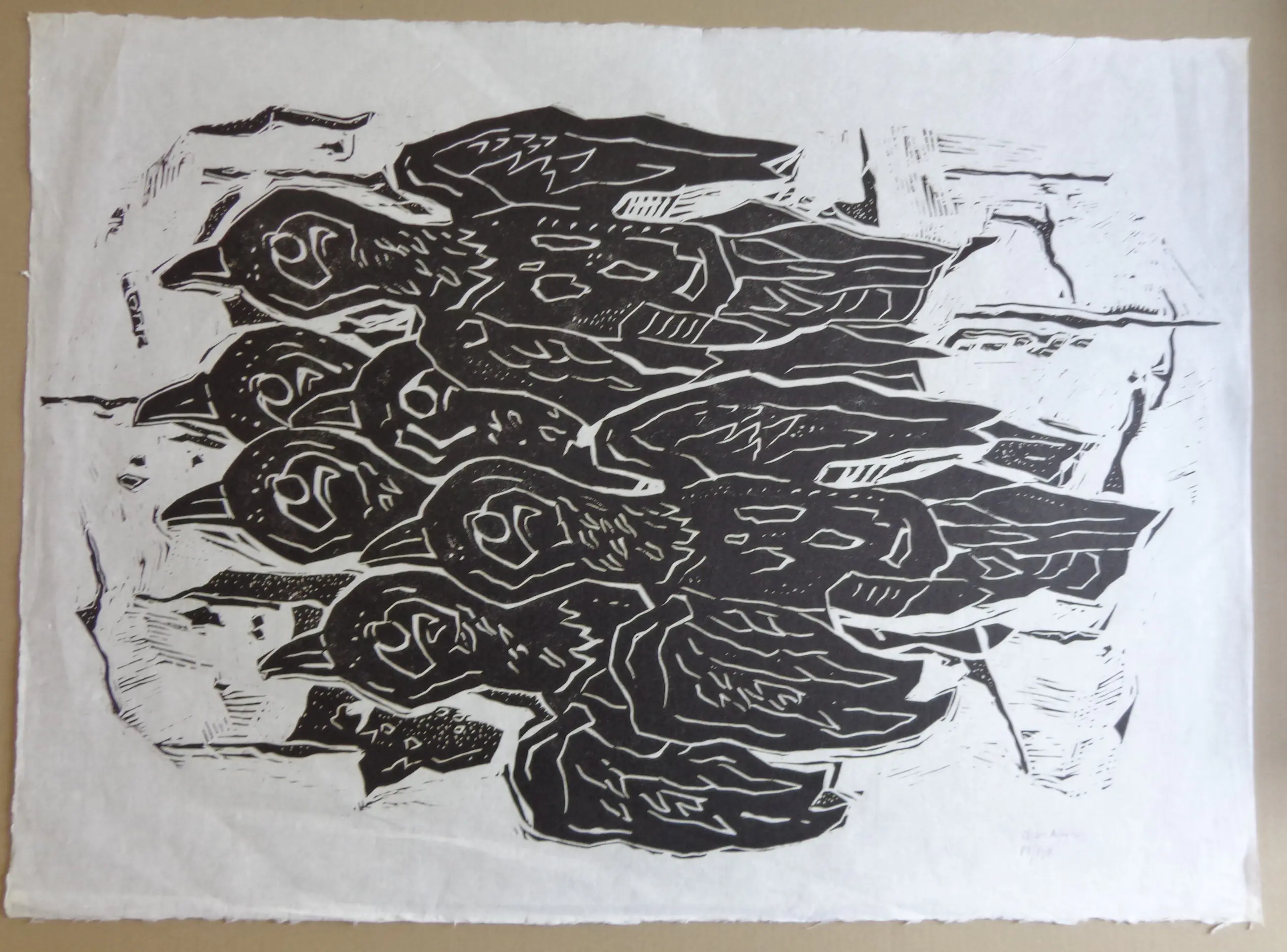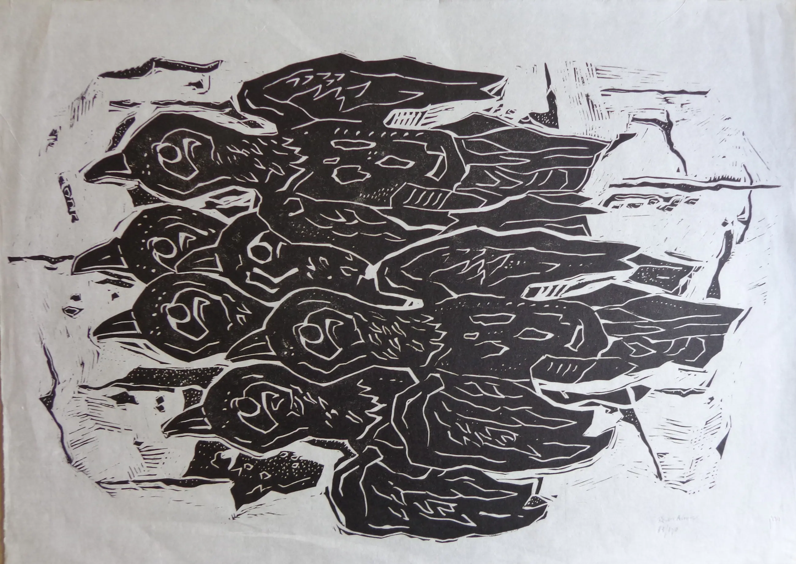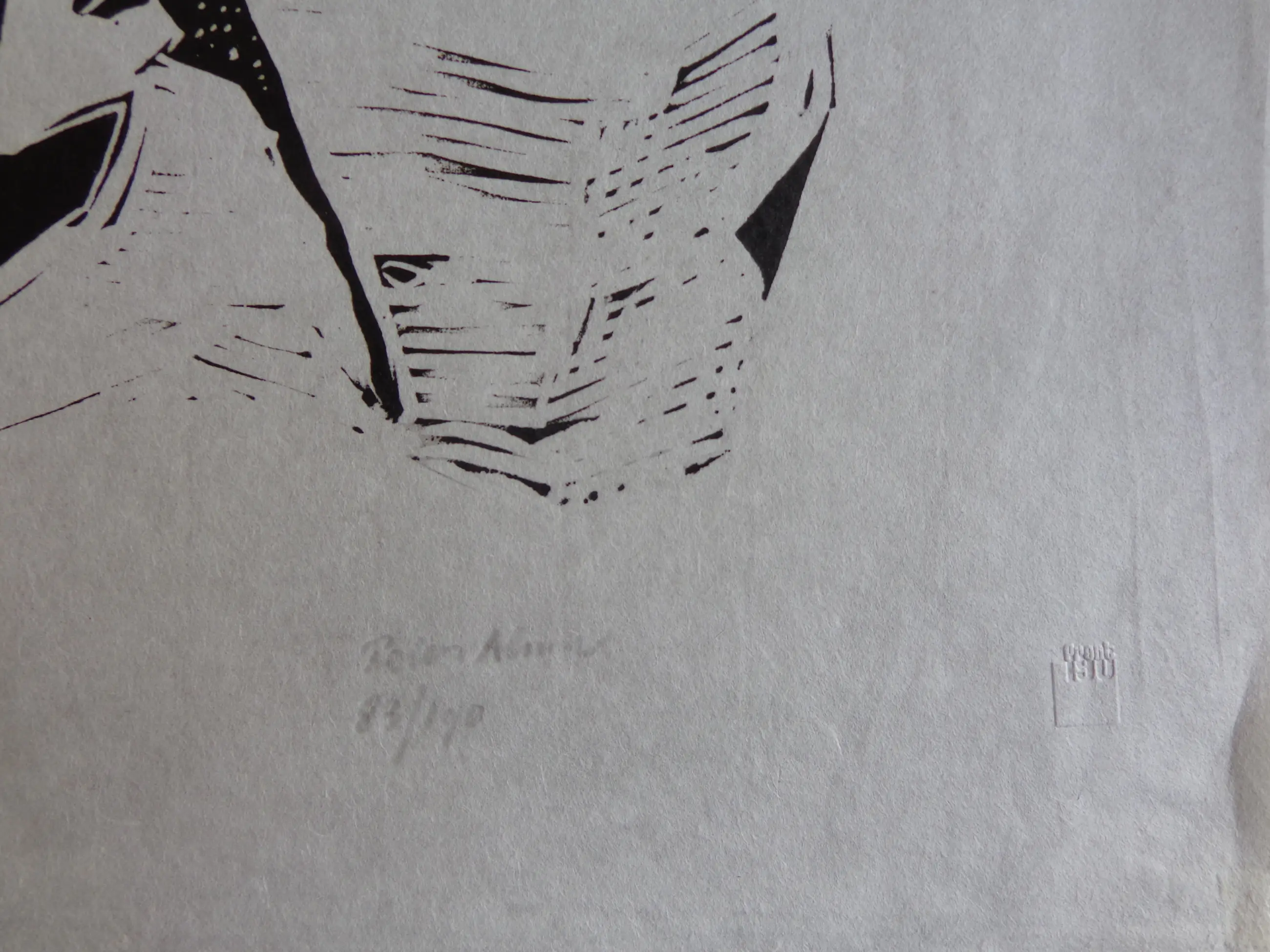 Peter Alma (1886-1969). Vogels. Zwart-wit houtsnede op dun papier. Gesigneerd met potlood. Ex.nr. 83/190. Droogstempel "Prent190". Goede staat. Deuken. Blad: 64x87cm.