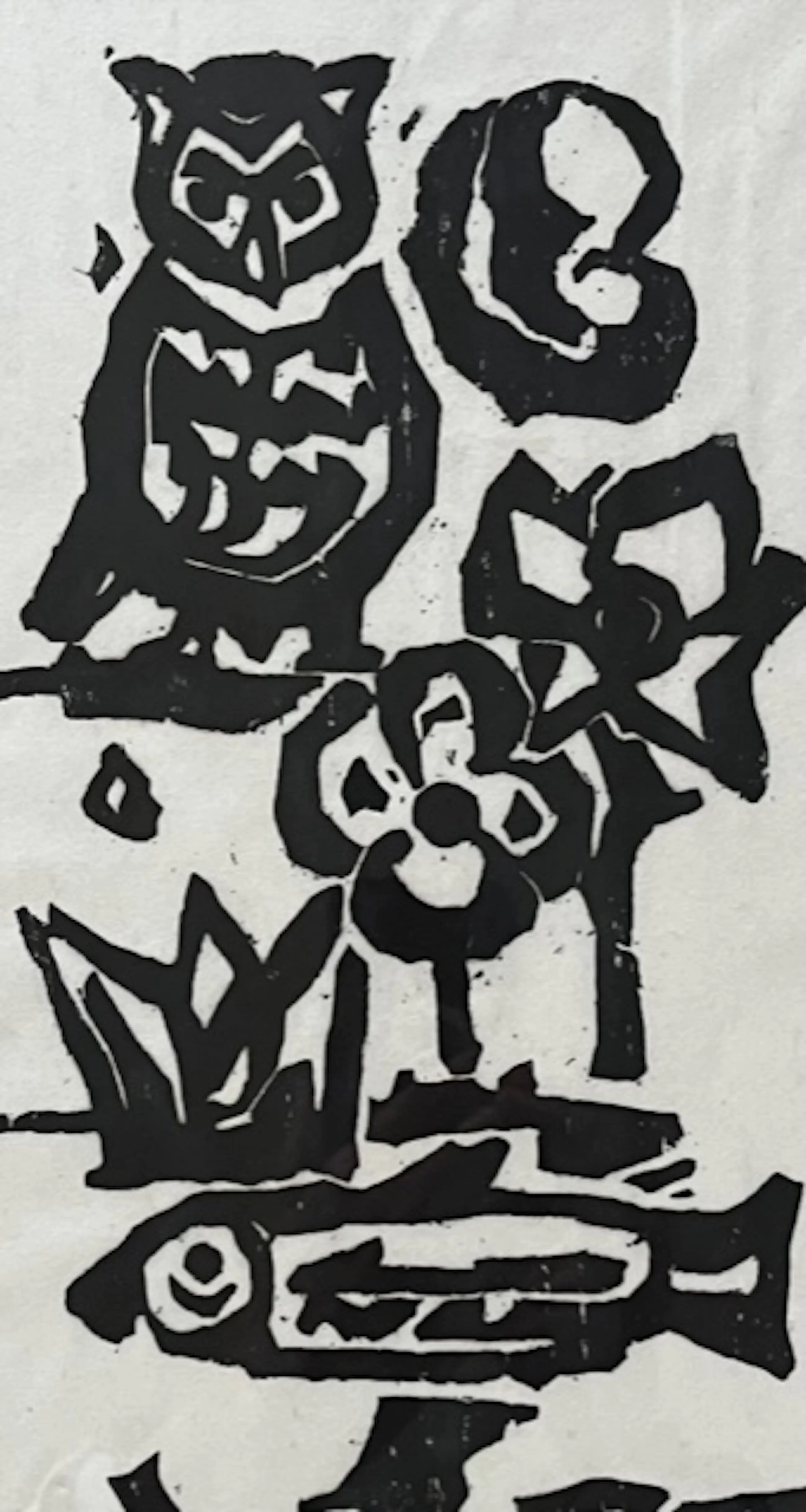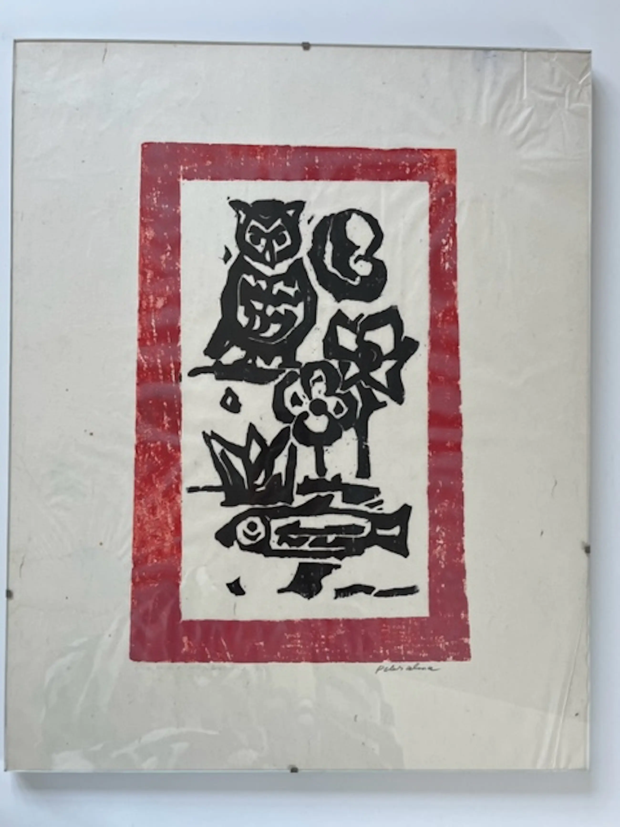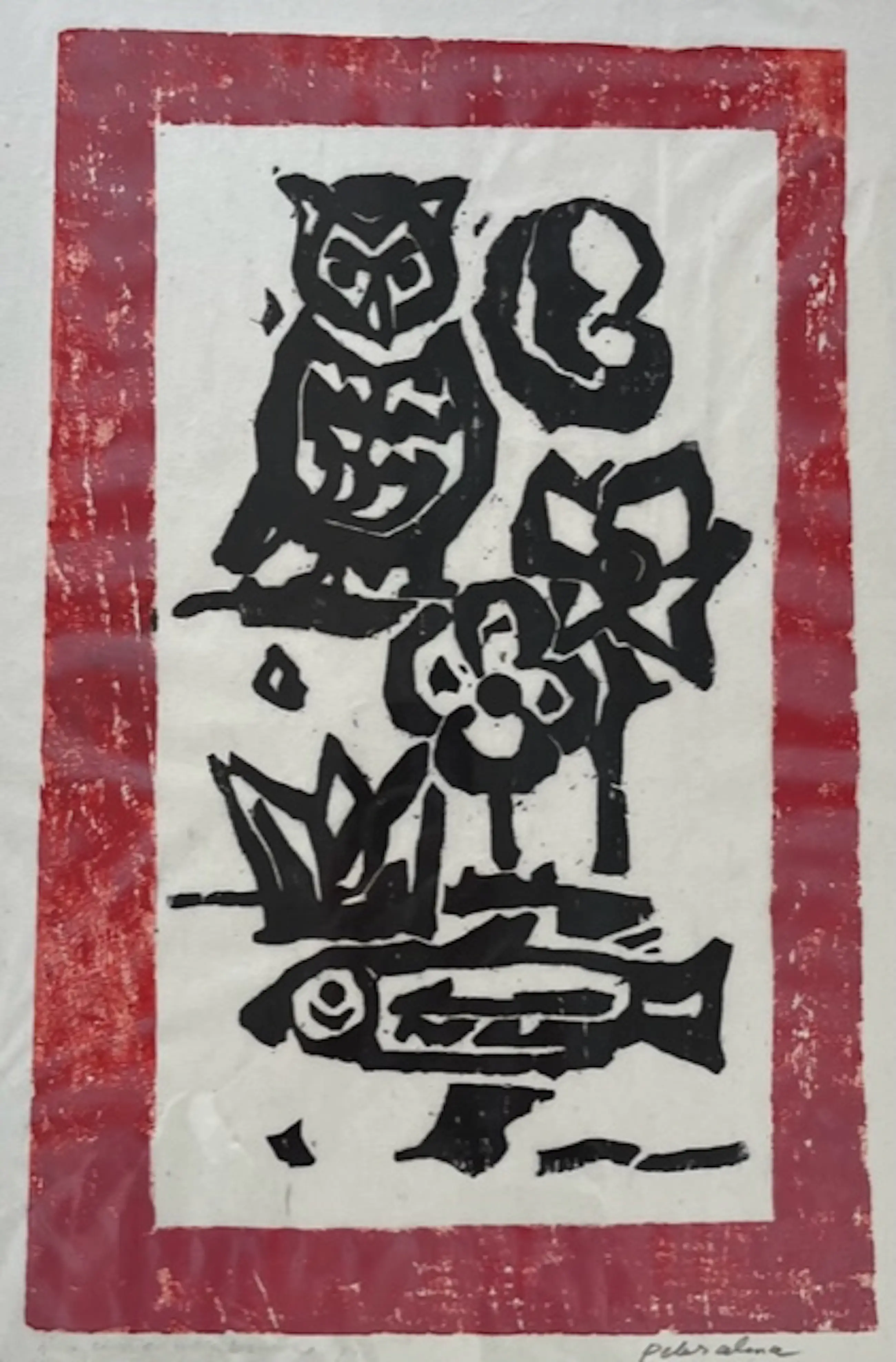 Linoleumsnede op rijstpapier in zwart met rode rand met daarop afgebeeld een uil, bloemen en een vis.